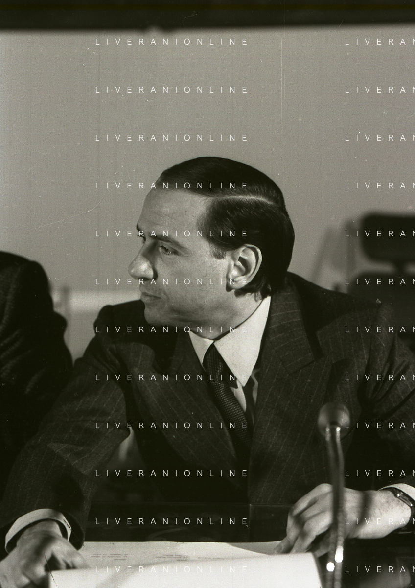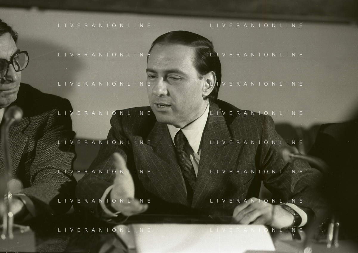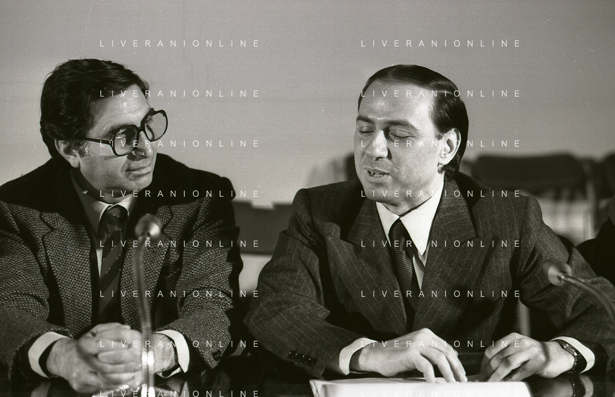 RETROSPETTIVA SILVIO BERLUSCONI IMPRENDITORE NELLA FOTO GAETANO MORAZZONI E SILVIO BERLUSCONI A PALAZZO MARINO A MILANO NELL'ANNO 1980-1981 AG ALDO LIVERANI SAS