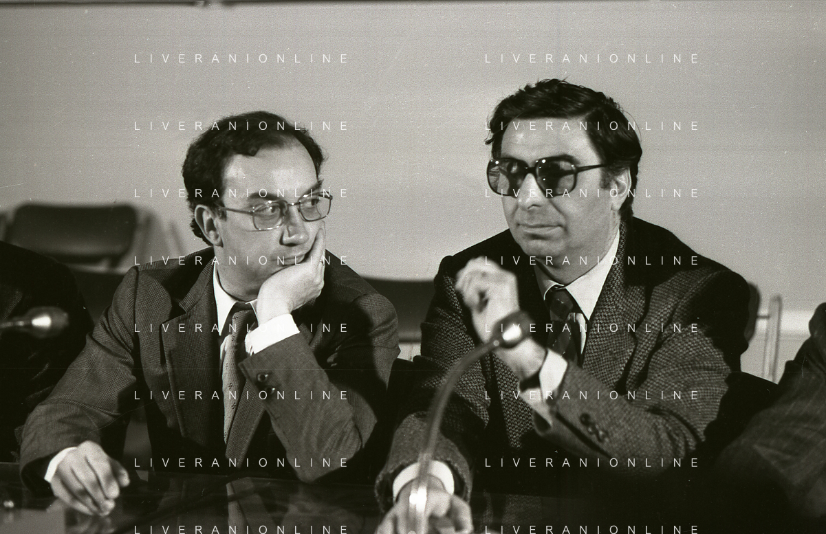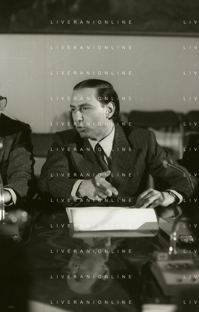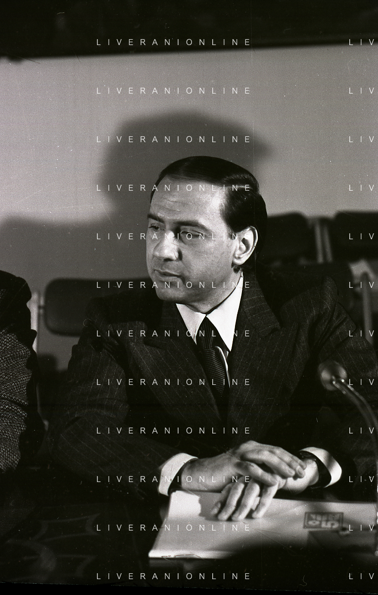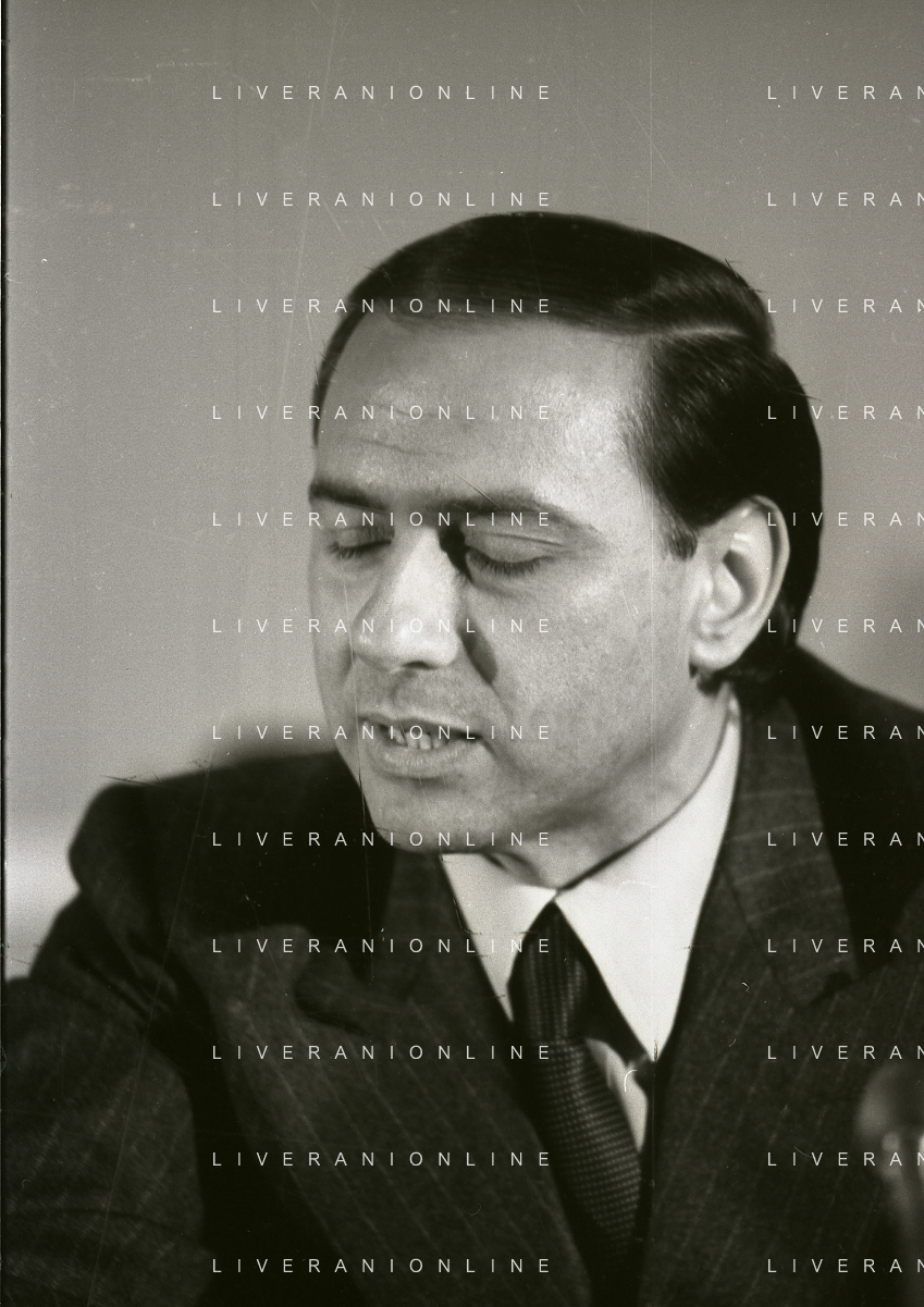 RETROSPETTIVA SILVIO BERLUSCONI IMPRENDITORE NELLA FOTO GAETANO MORAZZONI E SILVIO BERLUSCONI A PALAZZO MARINO A MILANO NELL'ANNO 1980-1981 AG ALDO LIVERANI SAS