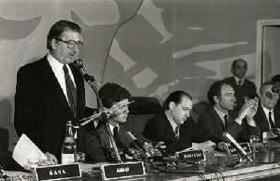 RETROSPETTIVA SILVIO BERLUSCONI IMPRENDITORE NELLA FOTO SILVIO BERLUSCONI NELL'ANNO 1983 AL CIRCOLO DE AMICIS A MILANO IN UN CONVEGNO SULLE TELEVISIONI LIBERE AG ALDO LIVERANI SAS