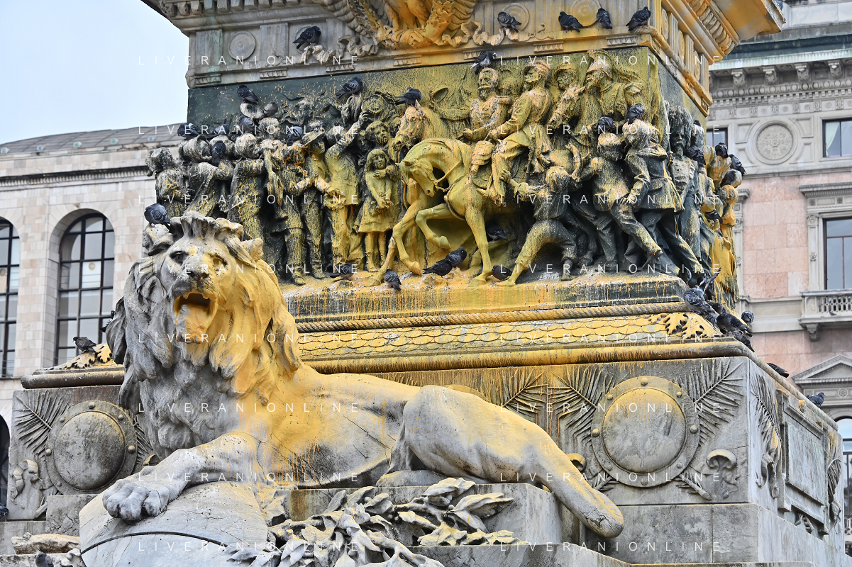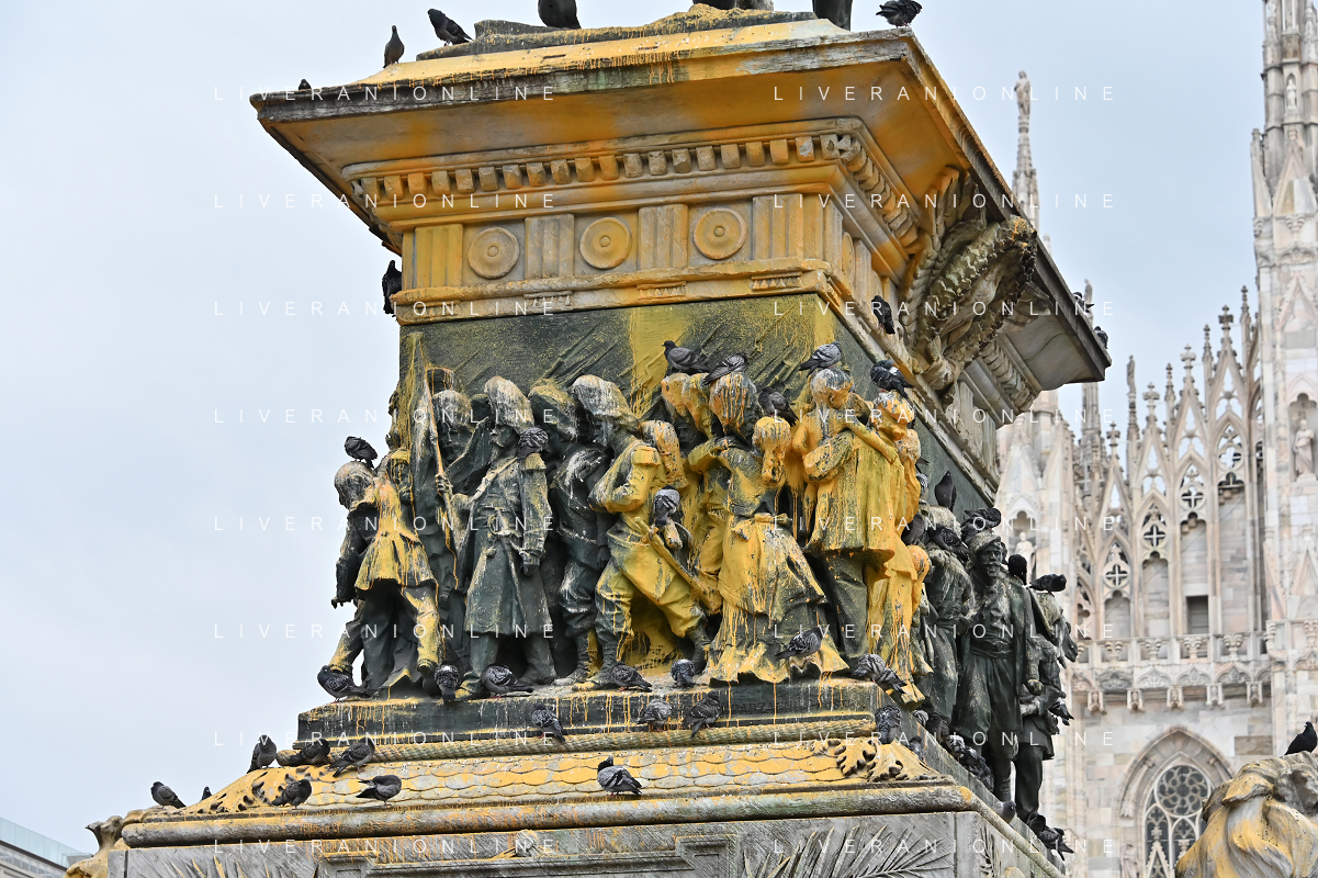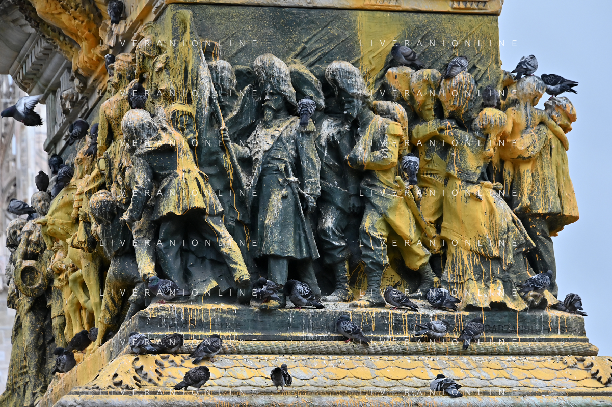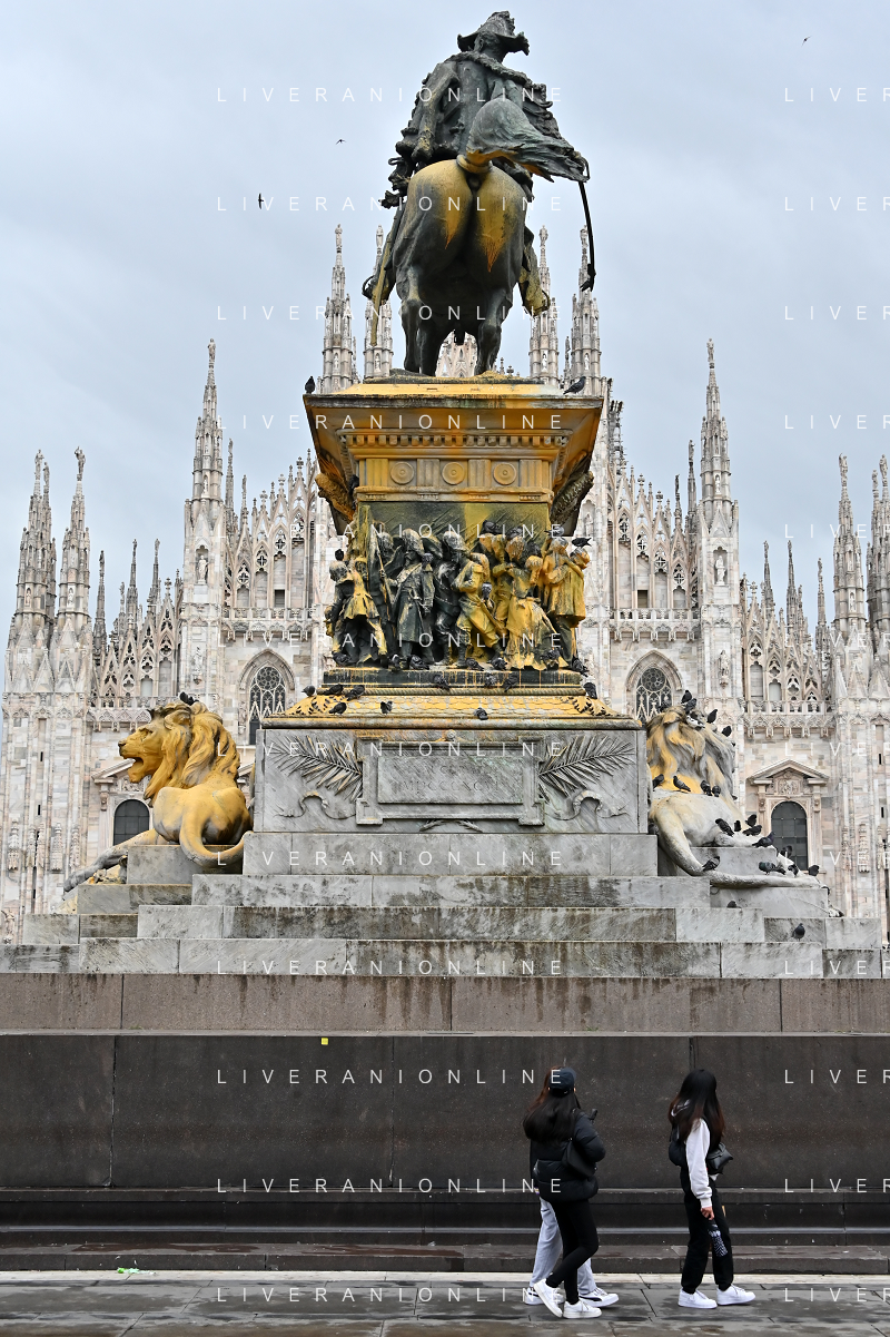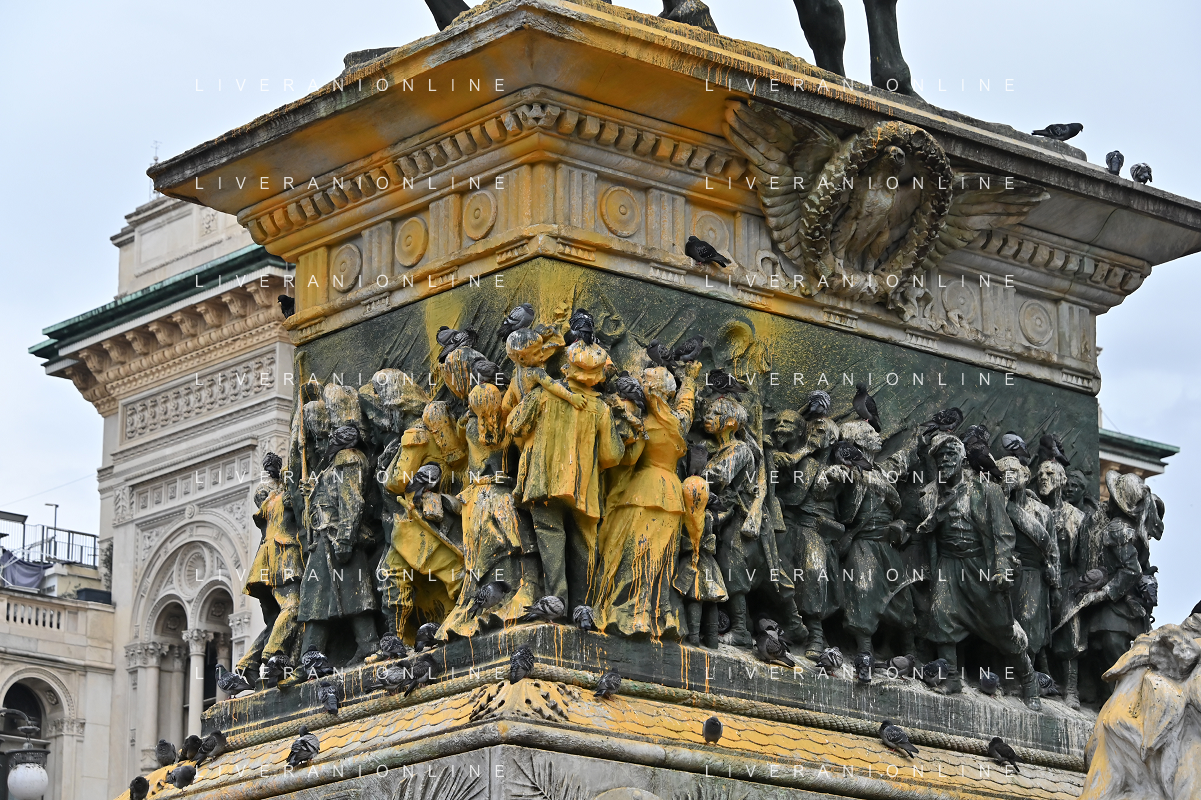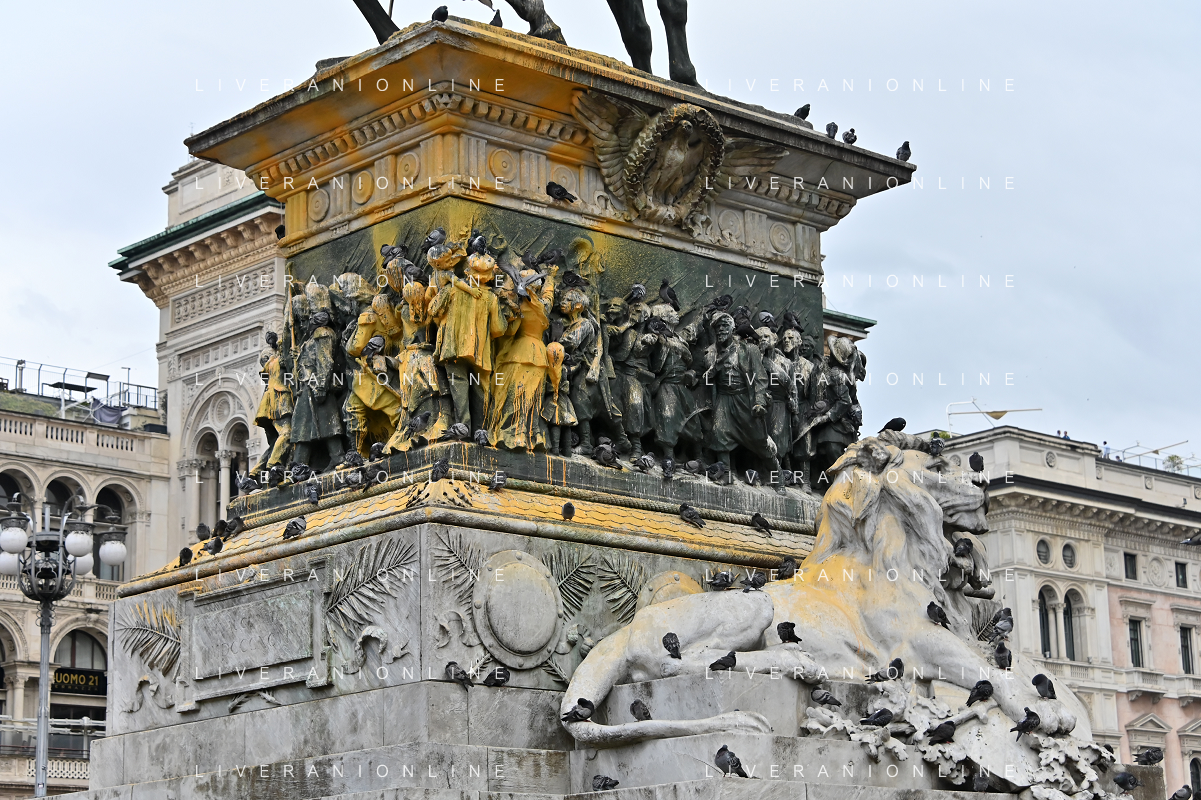 -TVRG Il monumento in piazza Duomo dedicato a Vittorio Emanuele II imbratttao con la vernice dagli attivisti - Milano 13-04-2023