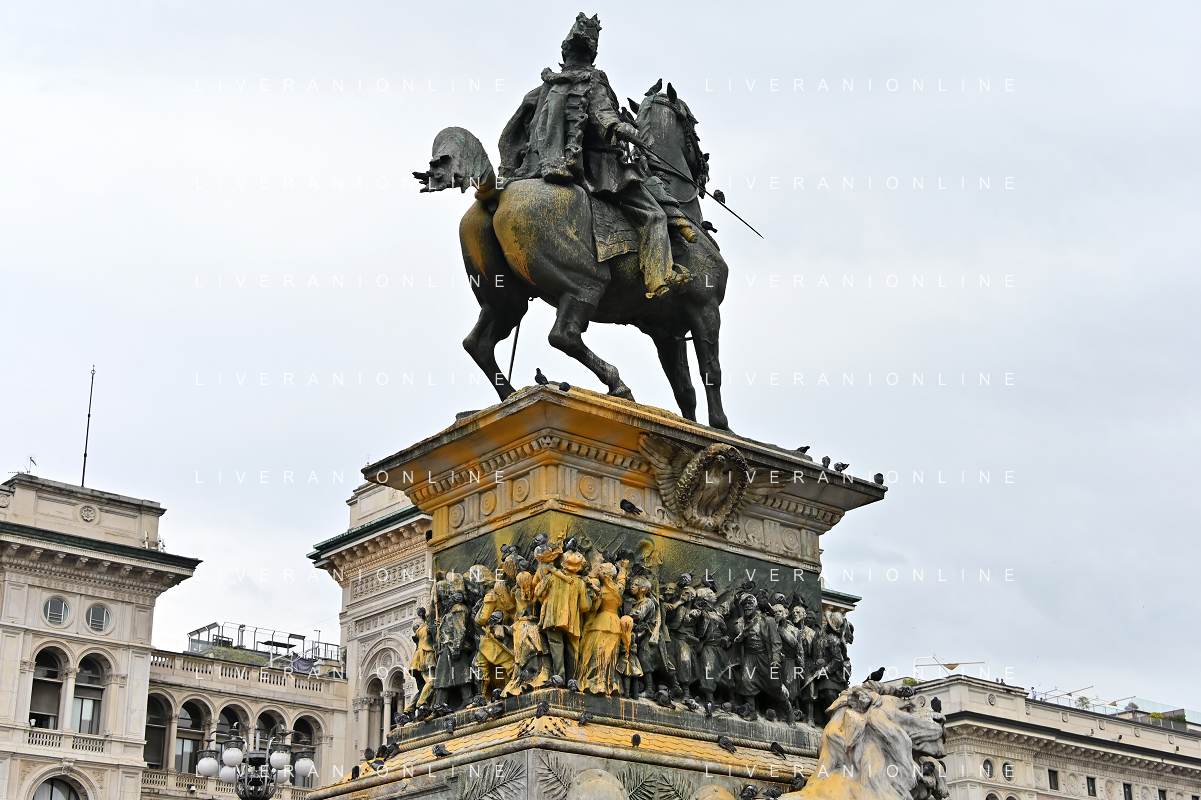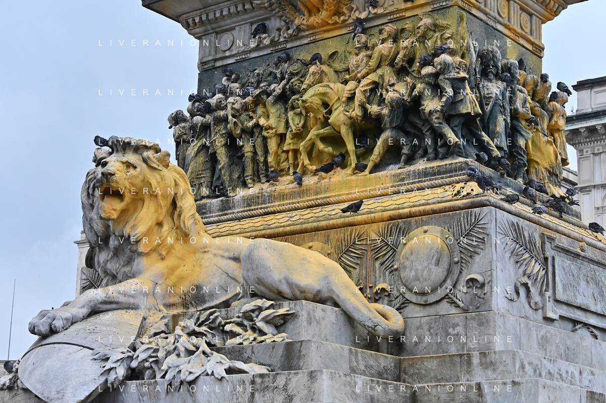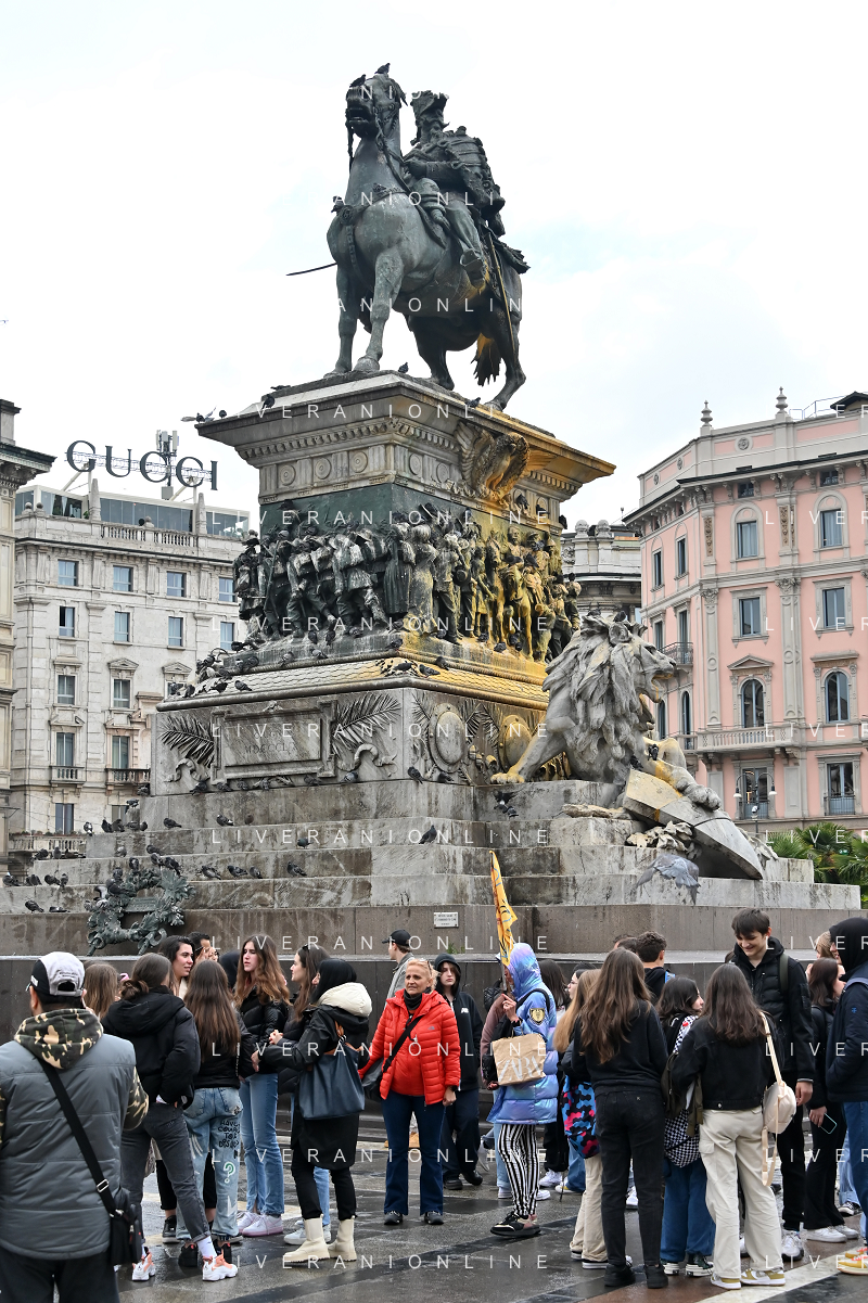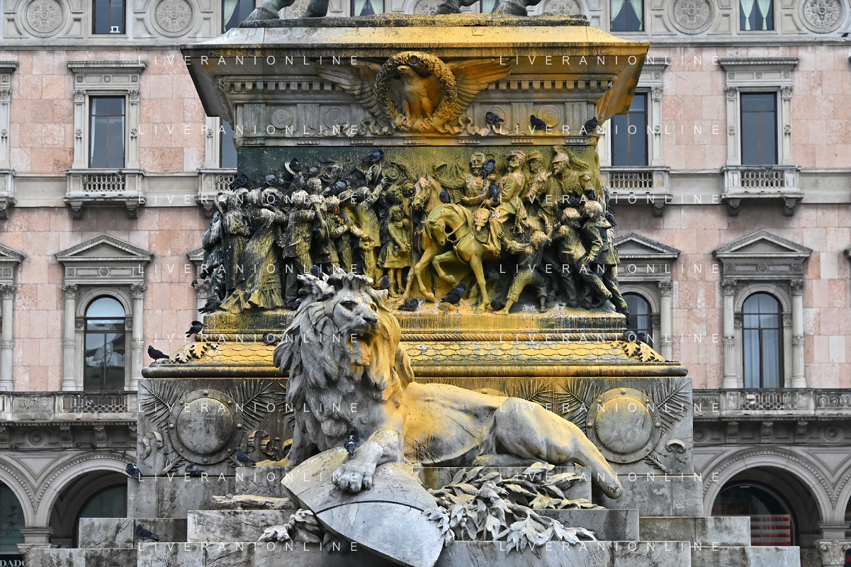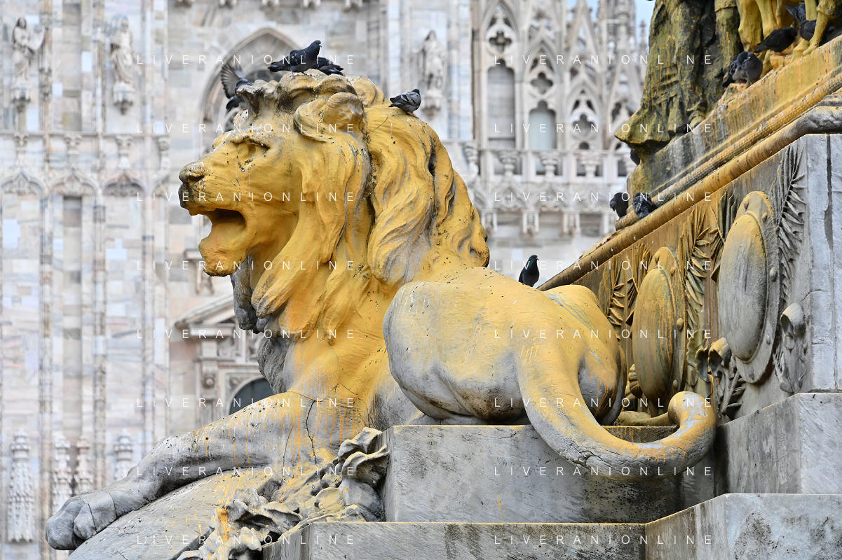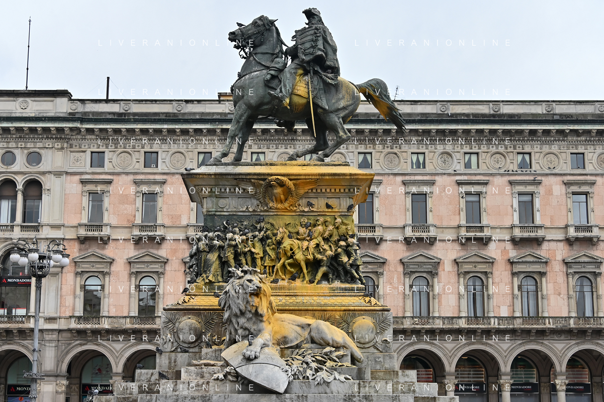 -TVRG Il monumento in piazza Duomo dedicato a Vittorio Emanuele II imbratttao con la vernice dagli attivisti - Milano 13-04-2023