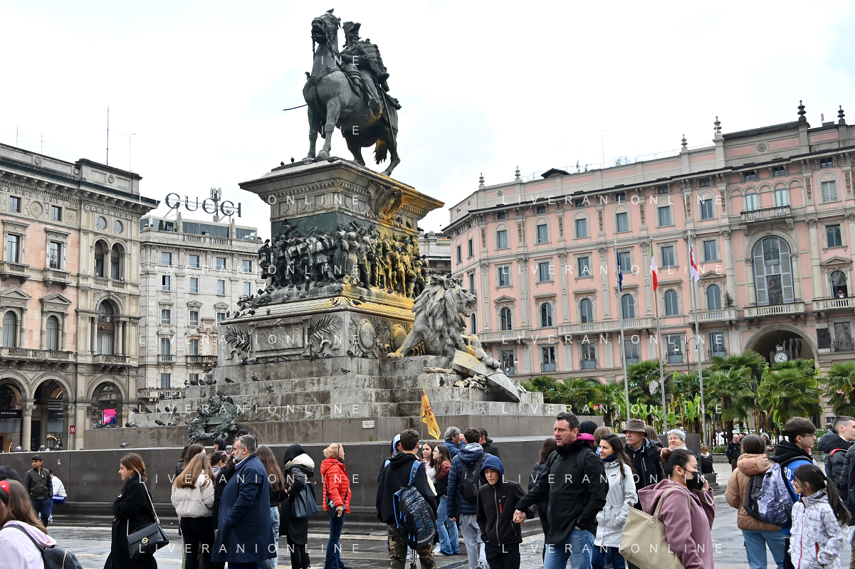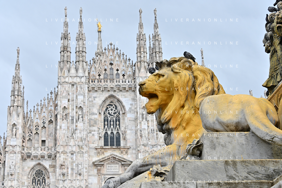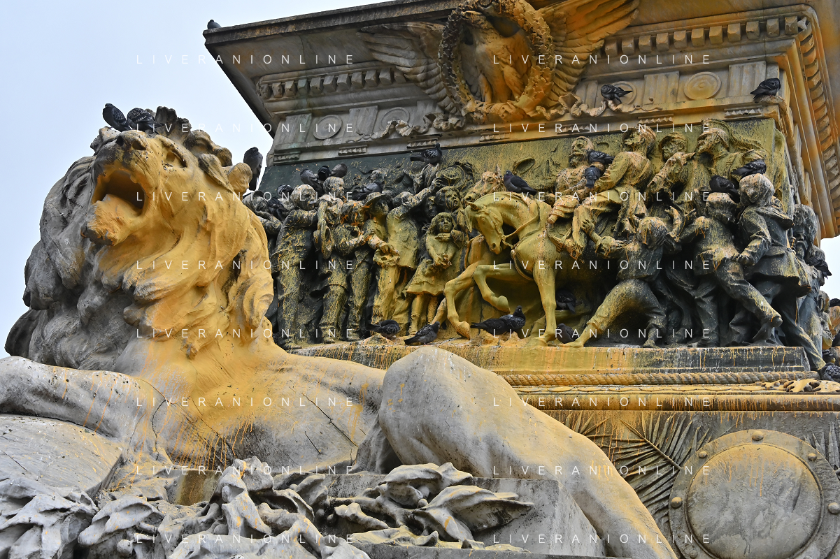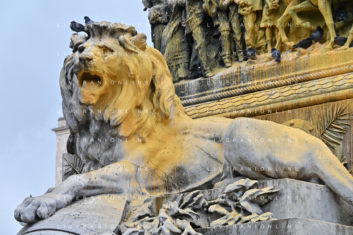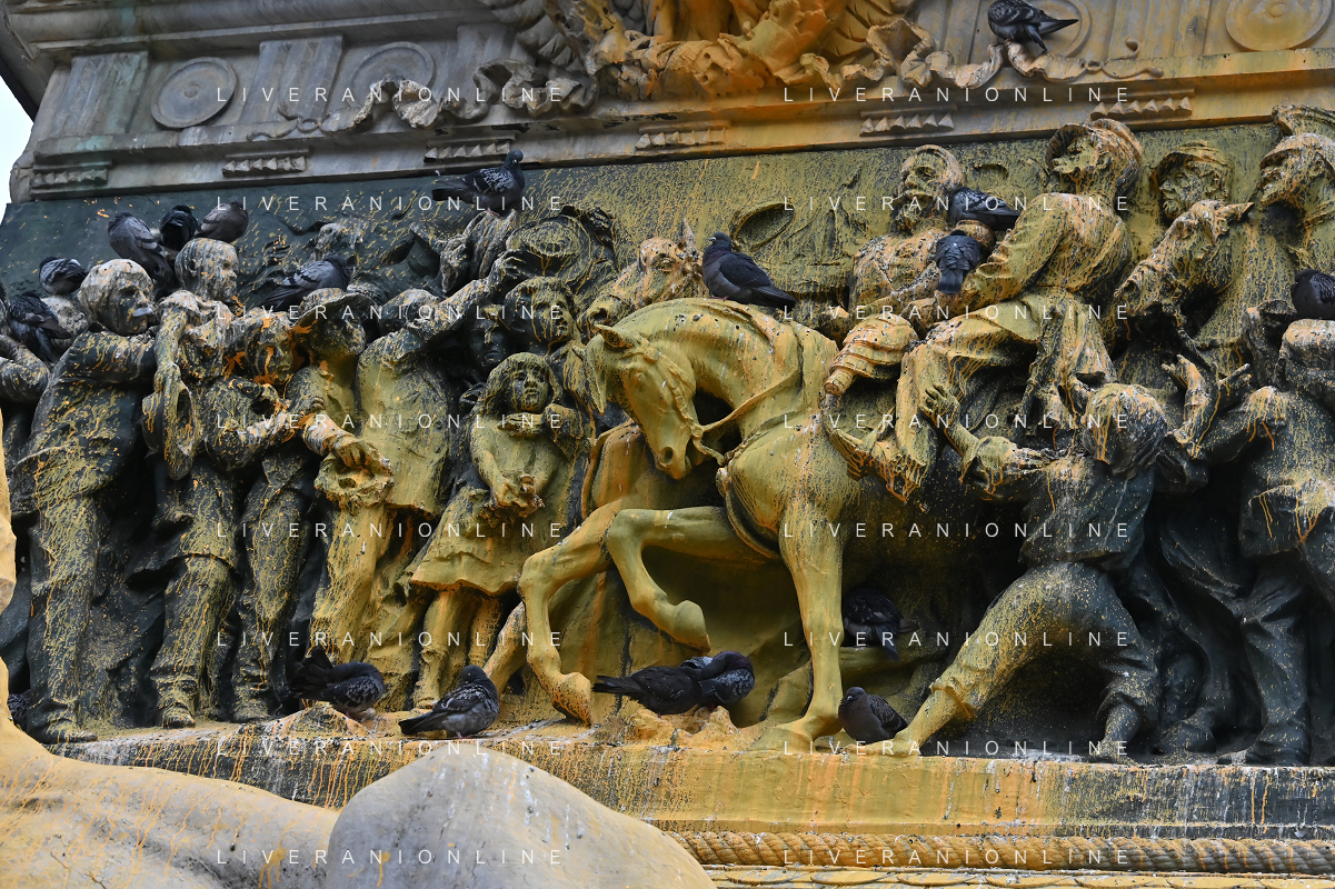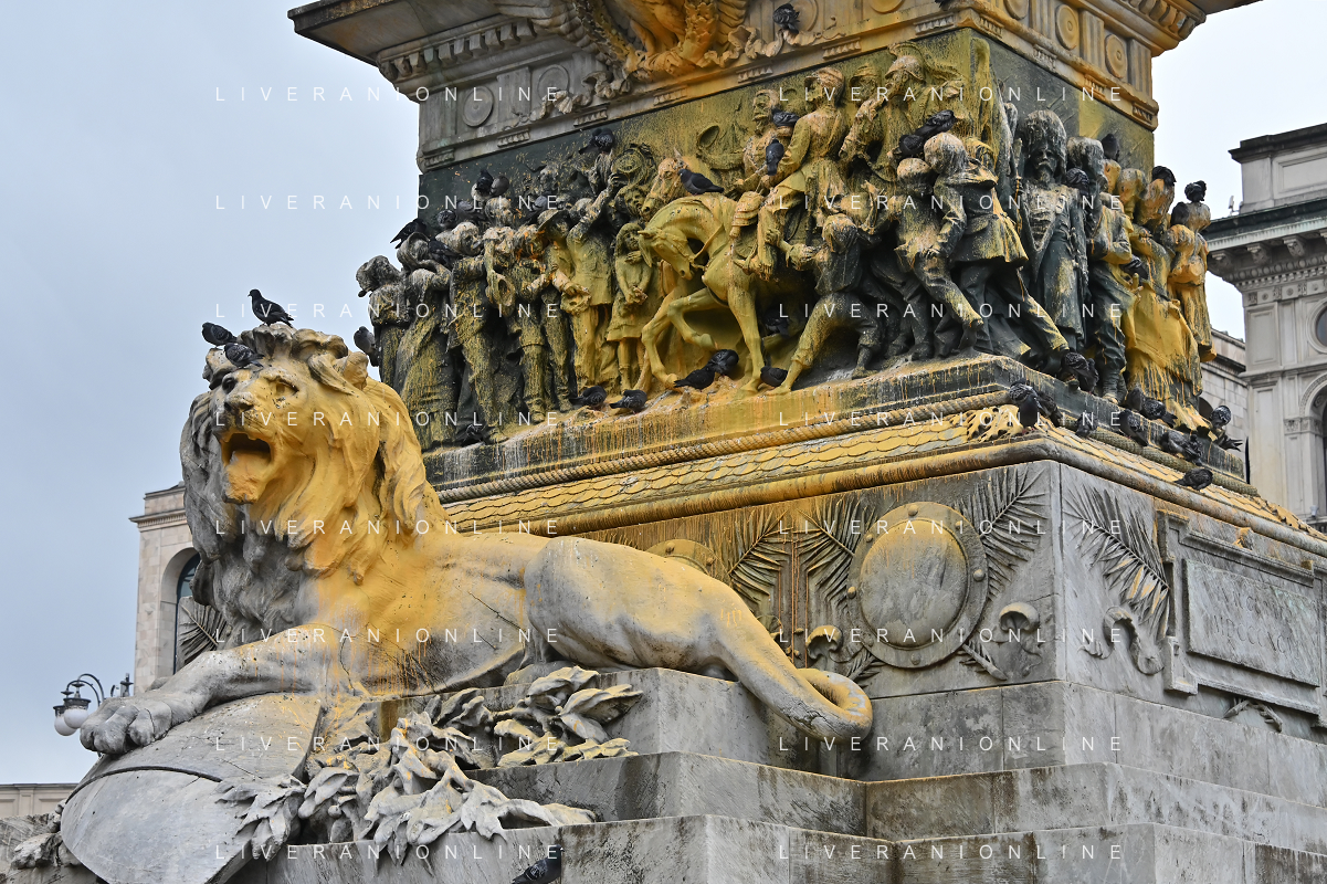 -TVRG Il monumento in piazza Duomo dedicato a Vittorio Emanuele II imbratttao con la vernice dagli attivisti - Milano 13-04-2023