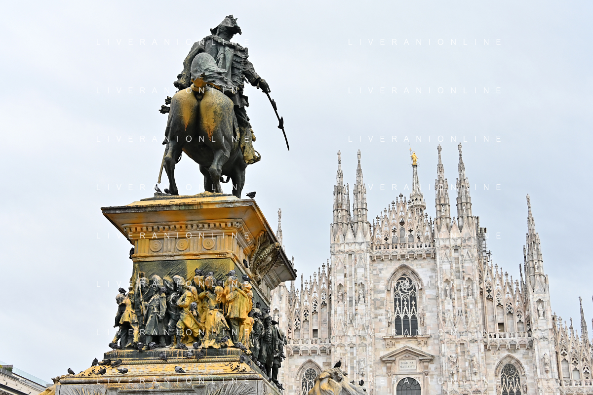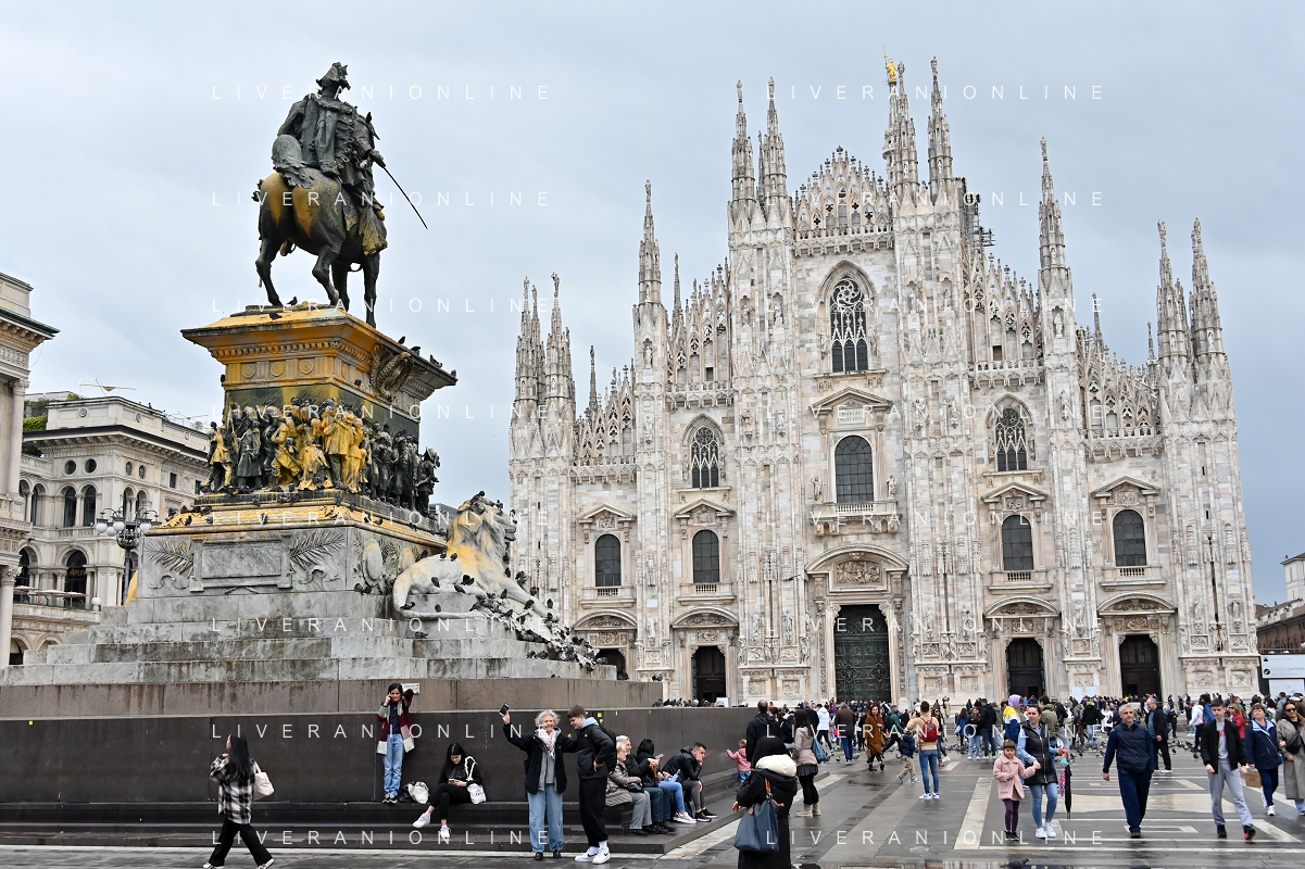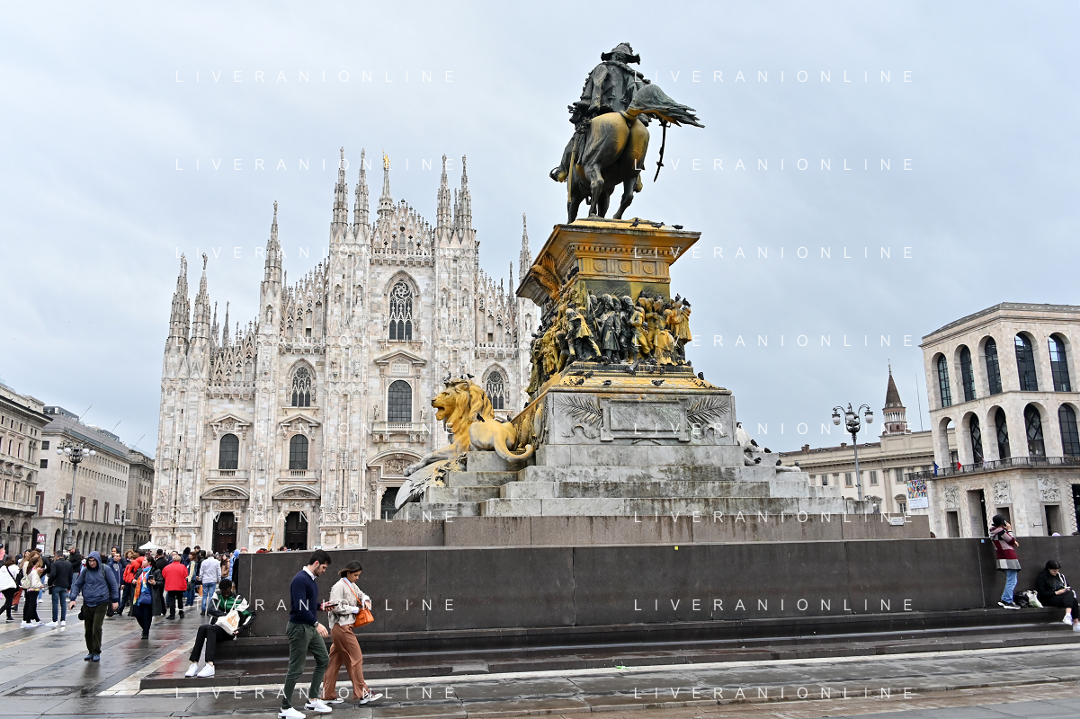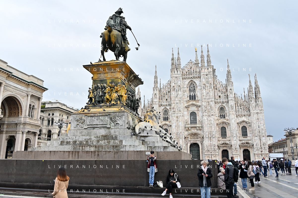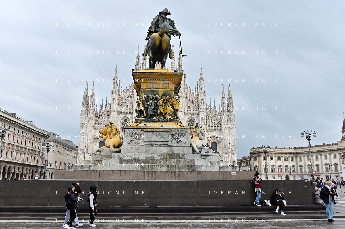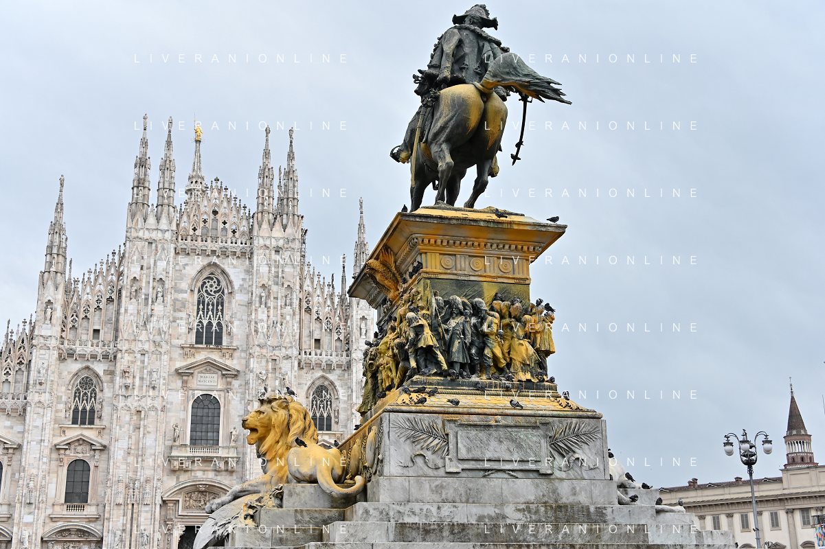 TVRG Monumento imbrattato piazza Duomo Milano 13-04-2023 Il monumento in piazza Duomo e dedicato a Vittorio Emanuele II imbratttao con la vernice foto Roberto Garavaglia/ag. Aldo Liverani sas/ AGENZIA ALDO LIVERANI SAS