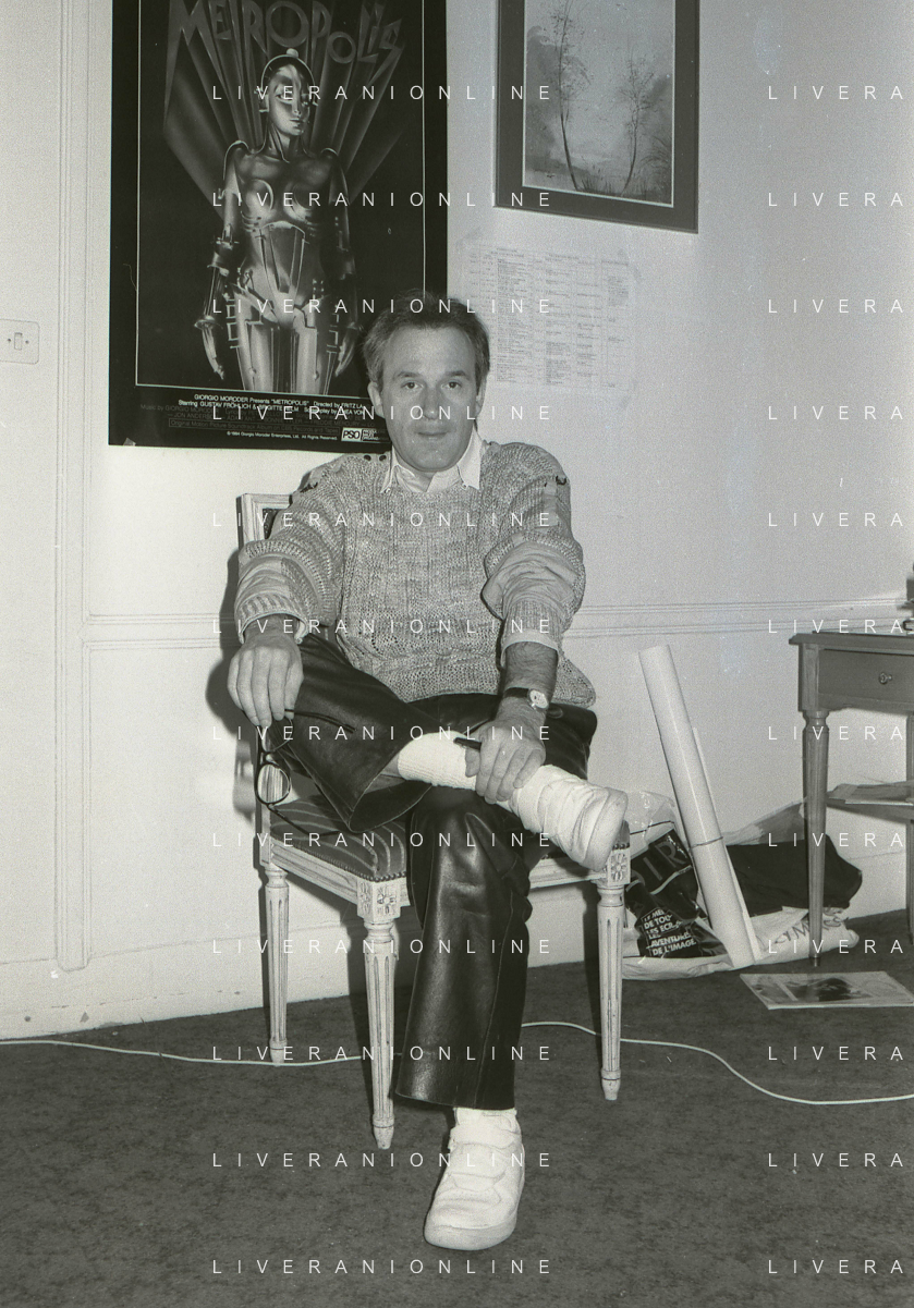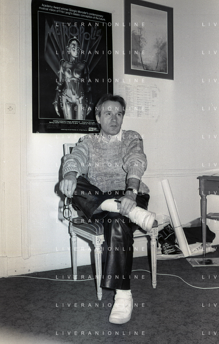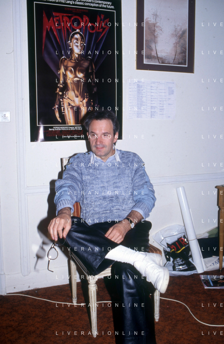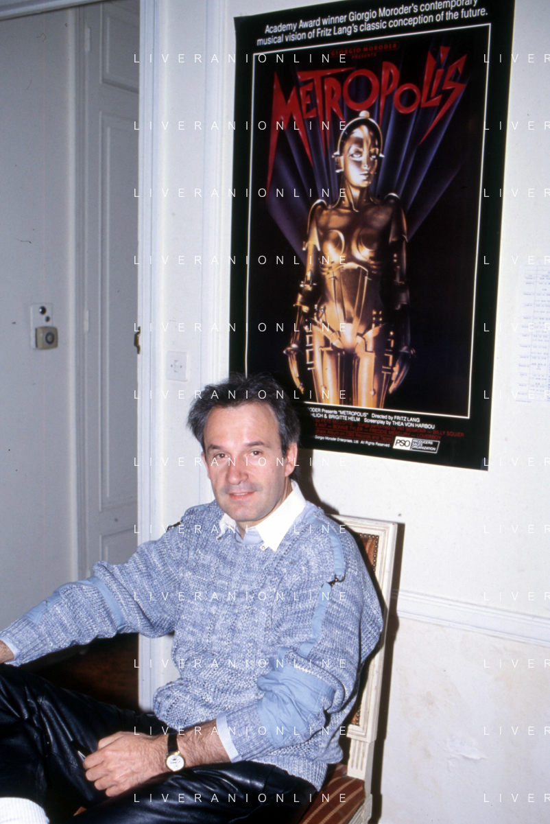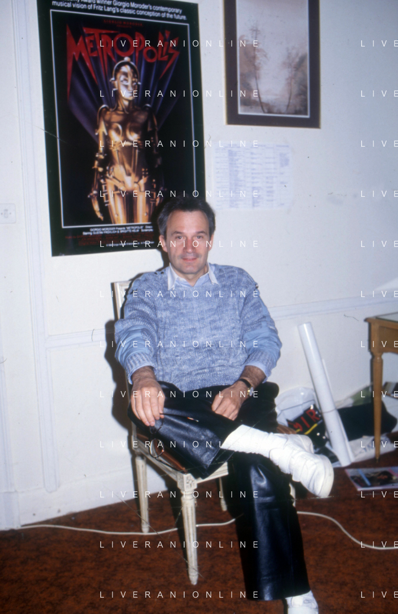 DIA-RETROSPETTIVA GIORGIO MORODER PRODUTTORE DISCOGRAFICO -COMPOSITORE E DISK JOCKEY NELLA FOTO GIORGIO MORODER A CANNES NELL’ANNO 1984 AGENZIA ALDO LIVERANI SAS
