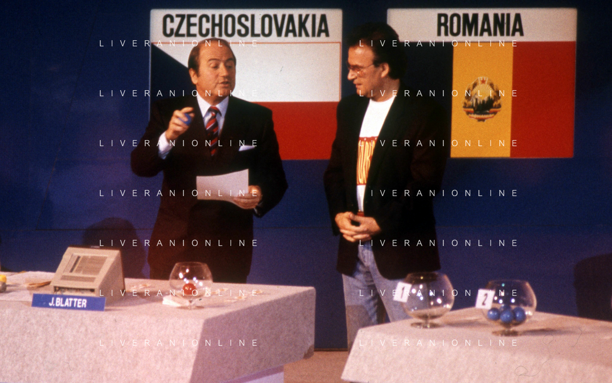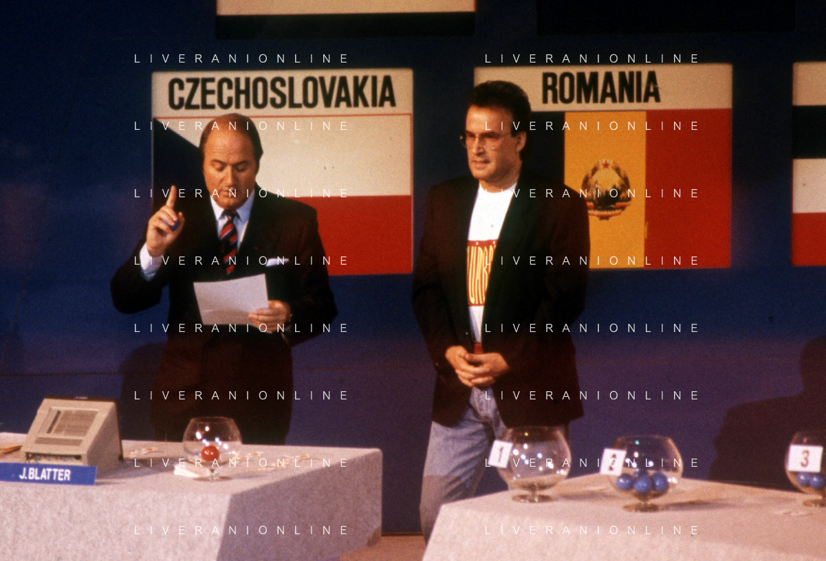 DIA-RETROSPETTIVA GIORGIO MORODER PRODUTTORE DISCOGRAFICO -COMPOSITORE E DISK JOCKEY NELLA FOTO GIORGIO MORODER A ROMA IL 09 DICEMBRE 1989 DURANTE I SORTEGGI PER I MONDIALI DI ITALIA ’90 CON JOSEPH BLATTER AGENZIA ALDO LIVERANI SAS