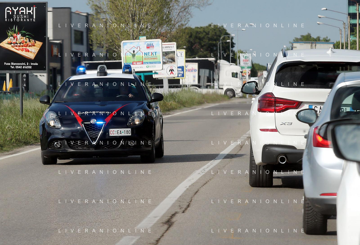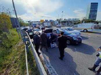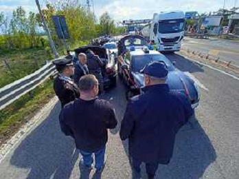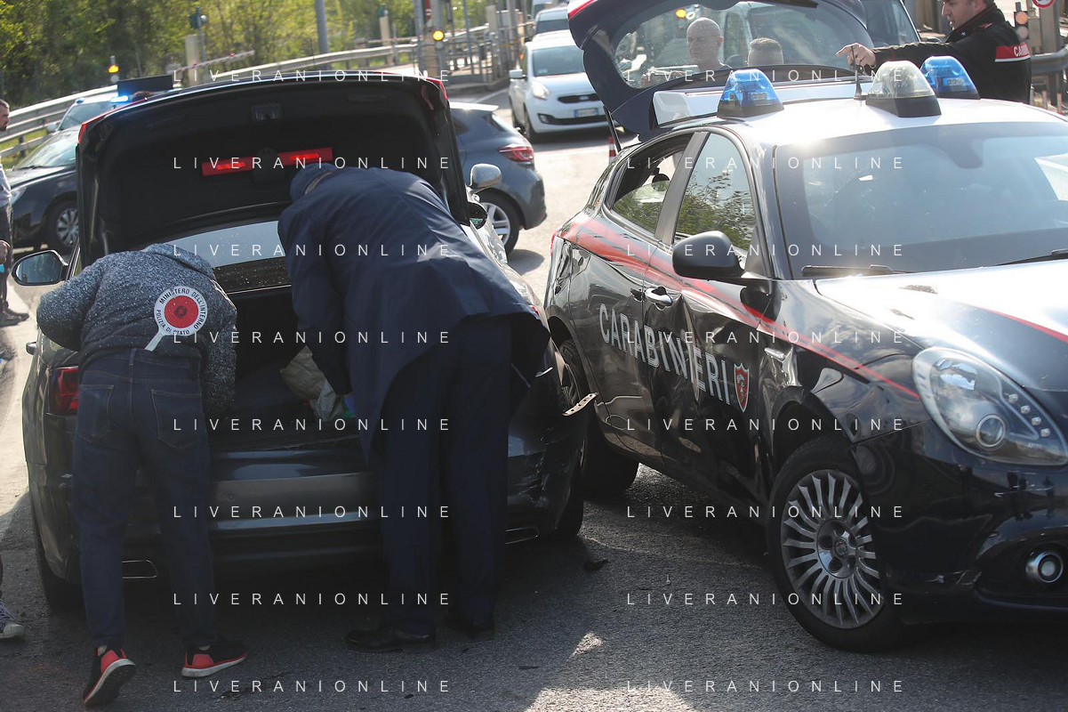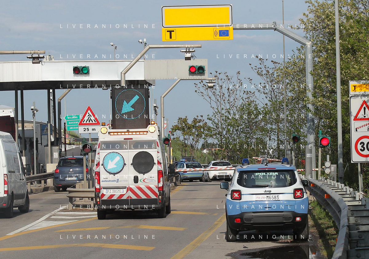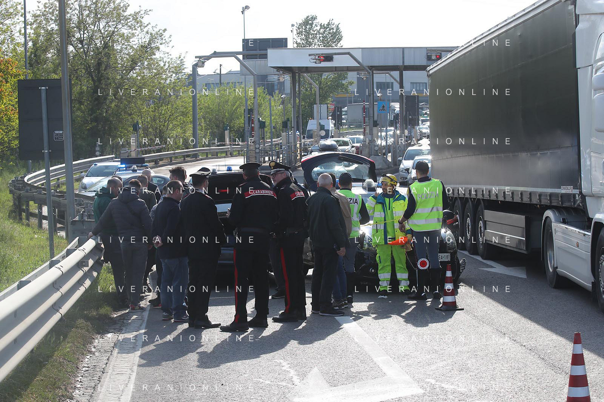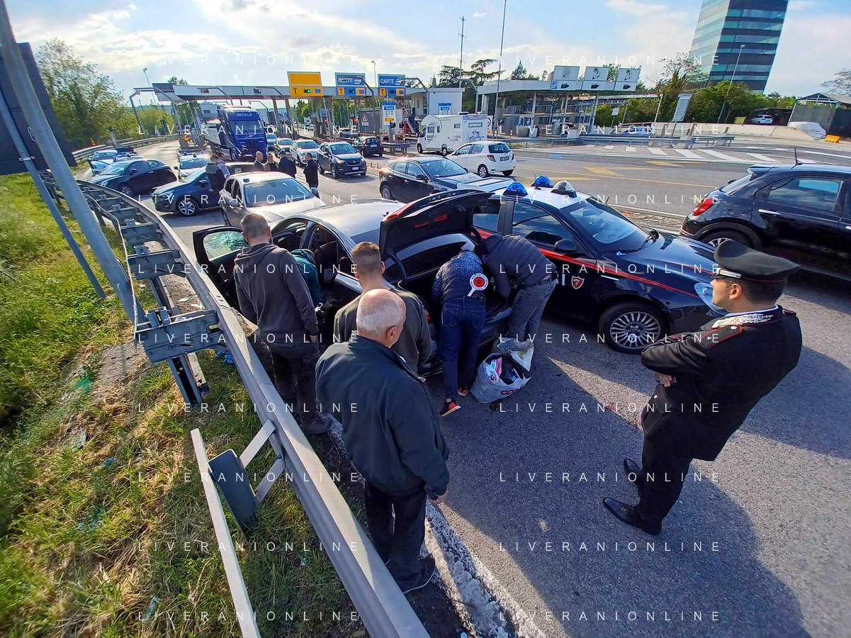 IMOLA 20 04 2023 POLIZIA DI STATO E CARABINIERI ARRESTANO DUE MALVIVENTI AL CASELLO AUTOSTRADALE DI IMOLA BLOCCANDO LA AUTO DEI MALVIVENTI CON DUE AUTO DELLE FORZE DELL'ORDINE