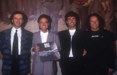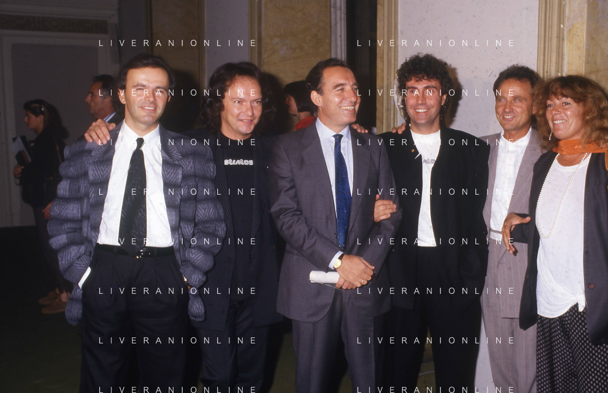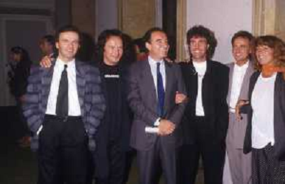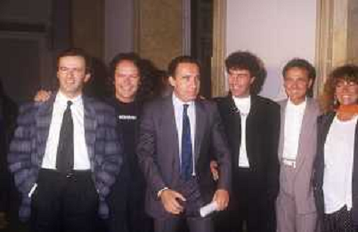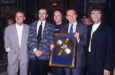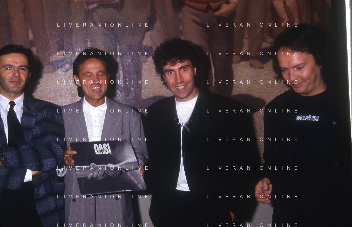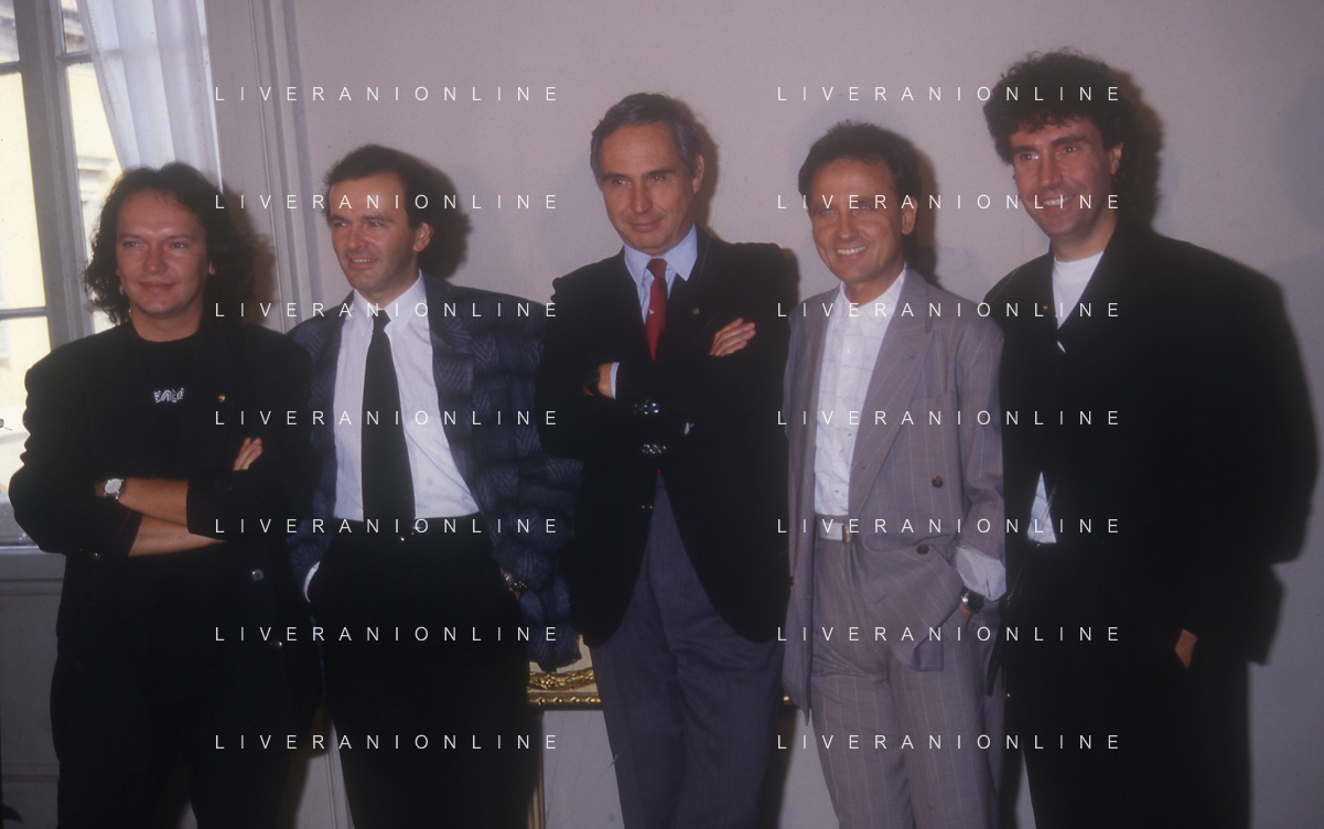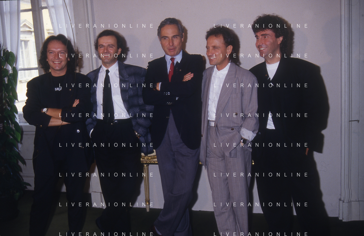 1988 MILANO VILLA REALE CONSEGNA DEL DISCO D'DOROA AL COMPLESSO MUSICALE DEI POOH NELLA FOTO IL COMPLESSO MUSICALE DEI POOH ALLA PRESENZA DEL SINDACO DI MILANO PAOLO PILLITTERI RICEVE IL DISCO D'ORO NELL'ANNO 1988 AG ALDO LIVERANI SAS