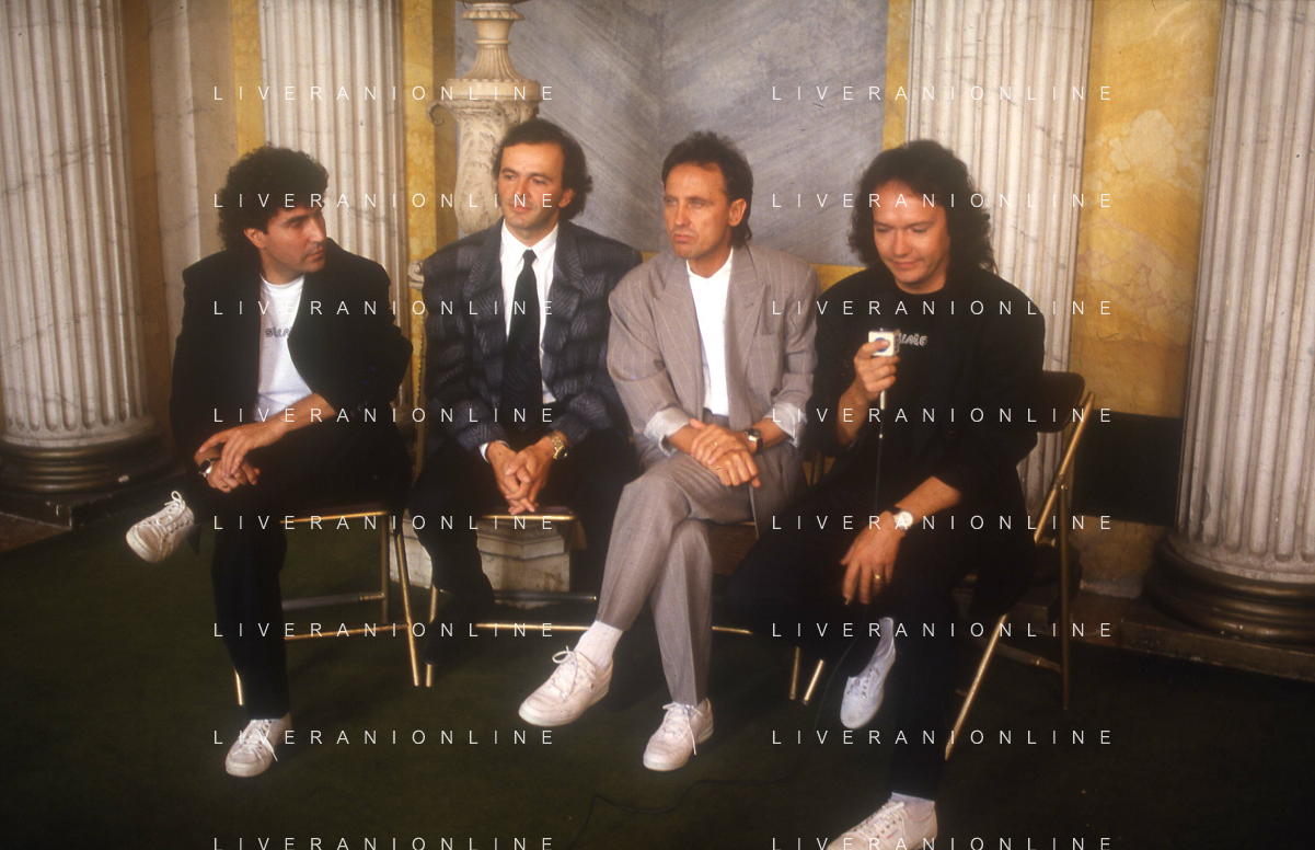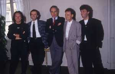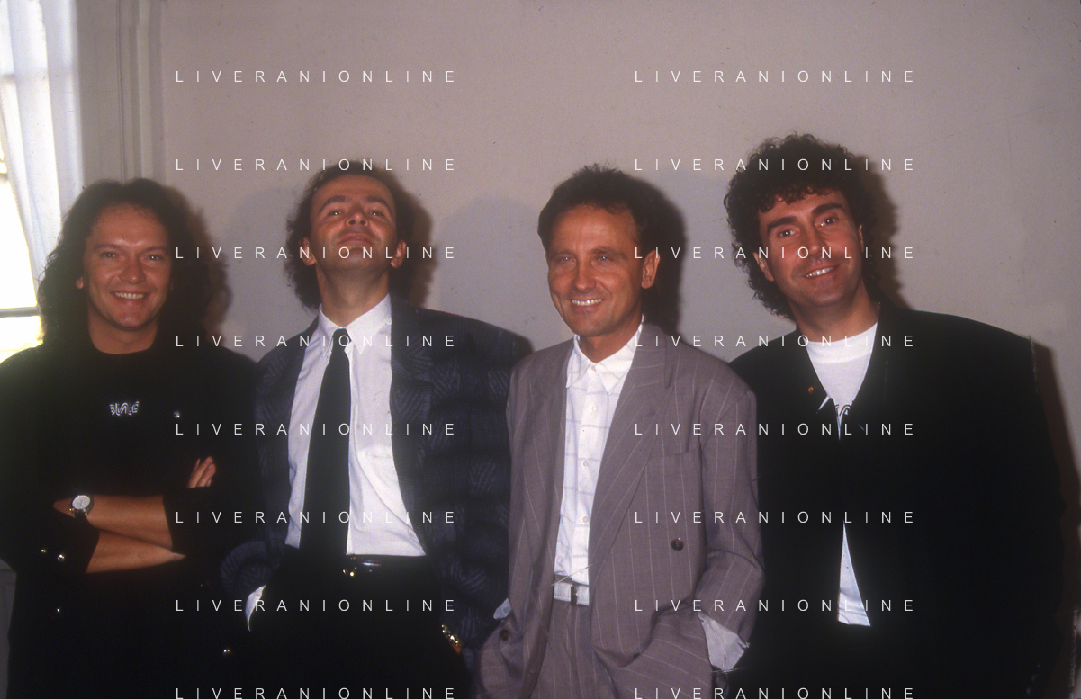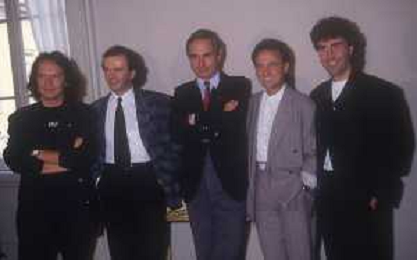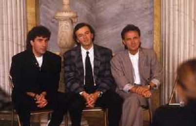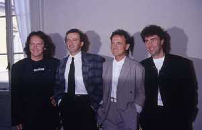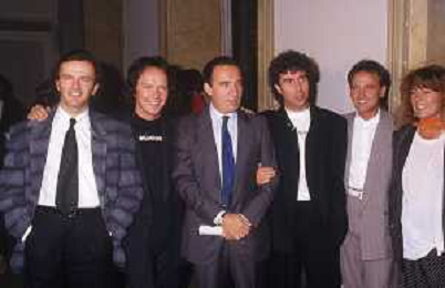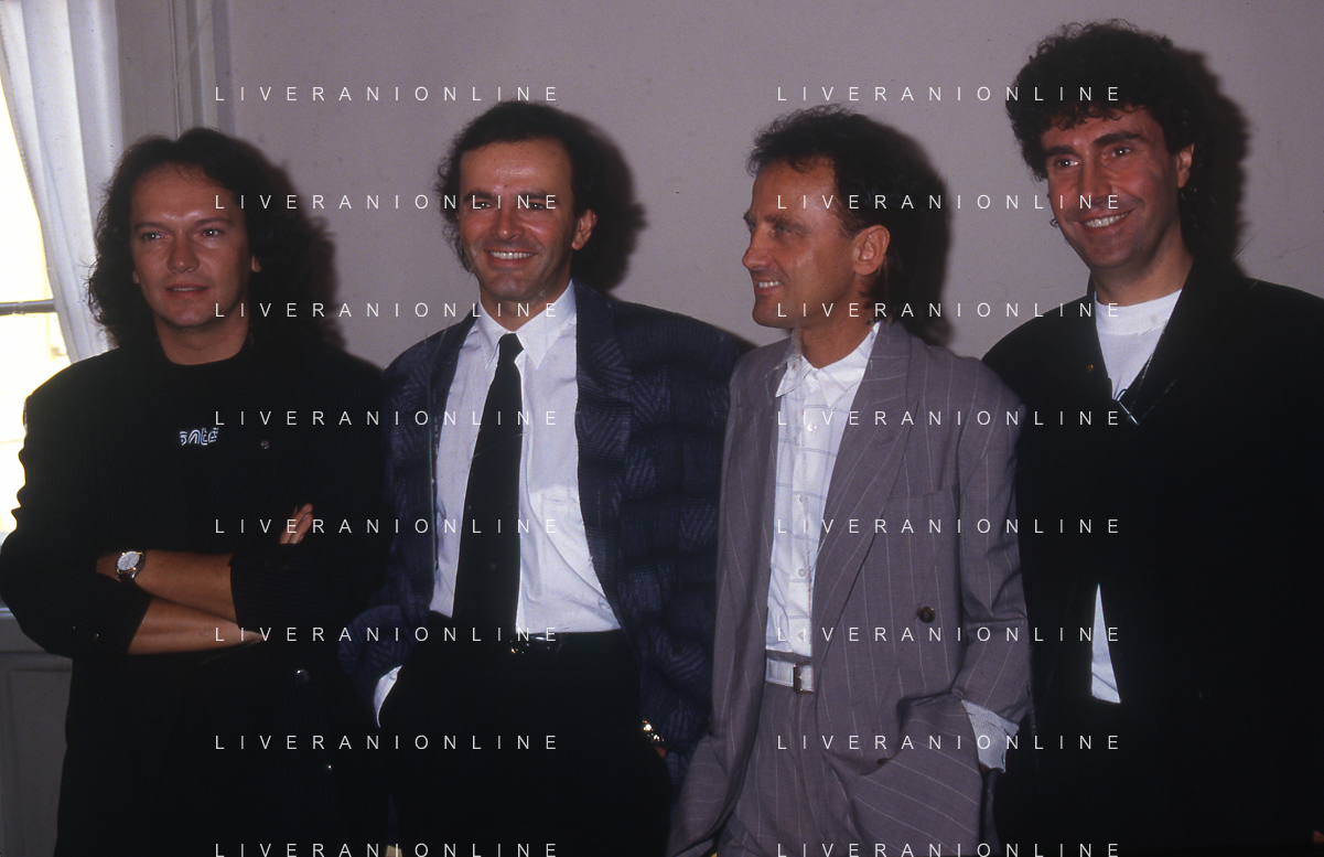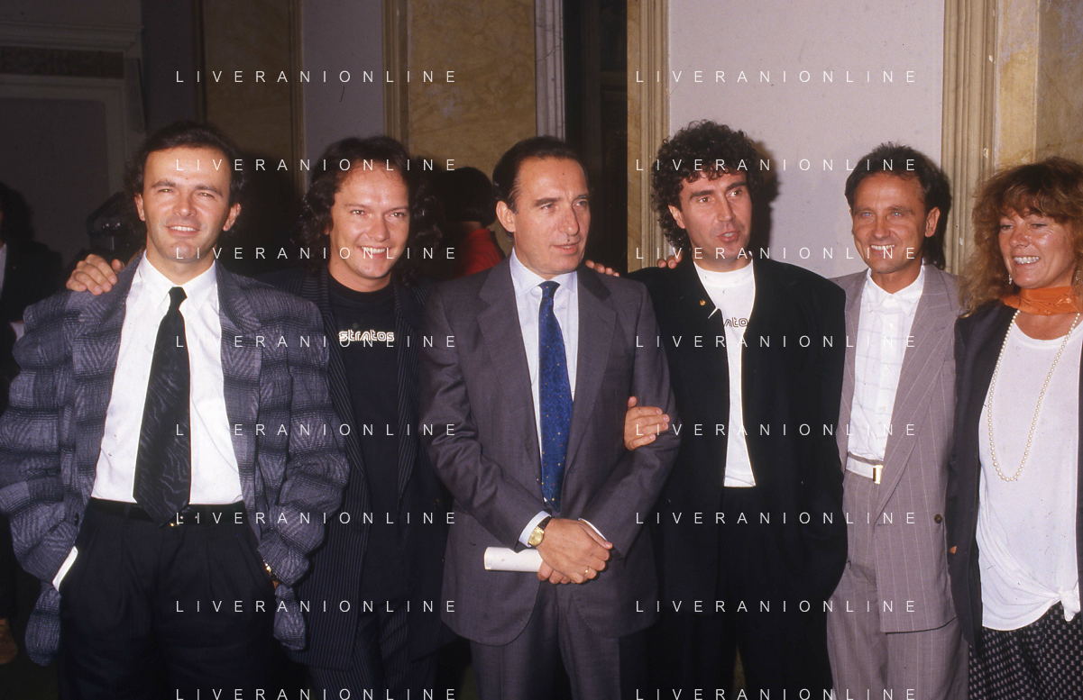 1988 MILANO VILLA REALE CONSEGNA DEL DISCO D'DOROA AL COMPLESSO MUSICALE DEI POOH NELLA FOTO IL COMPLESSO MUSICALE DEI POOH ALLA PRESENZA DEL SINDACO DI MILANO PAOLO PILLITTERI RICEVE IL DISCO D'ORO NELL'ANNO 1988 AG ALDO LIVERANI SAS