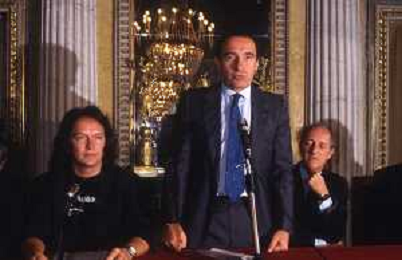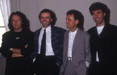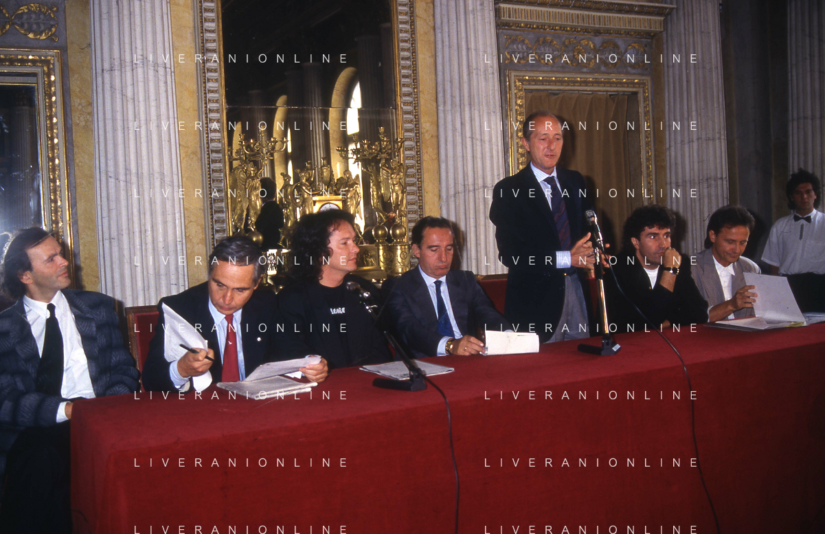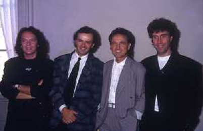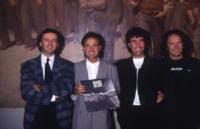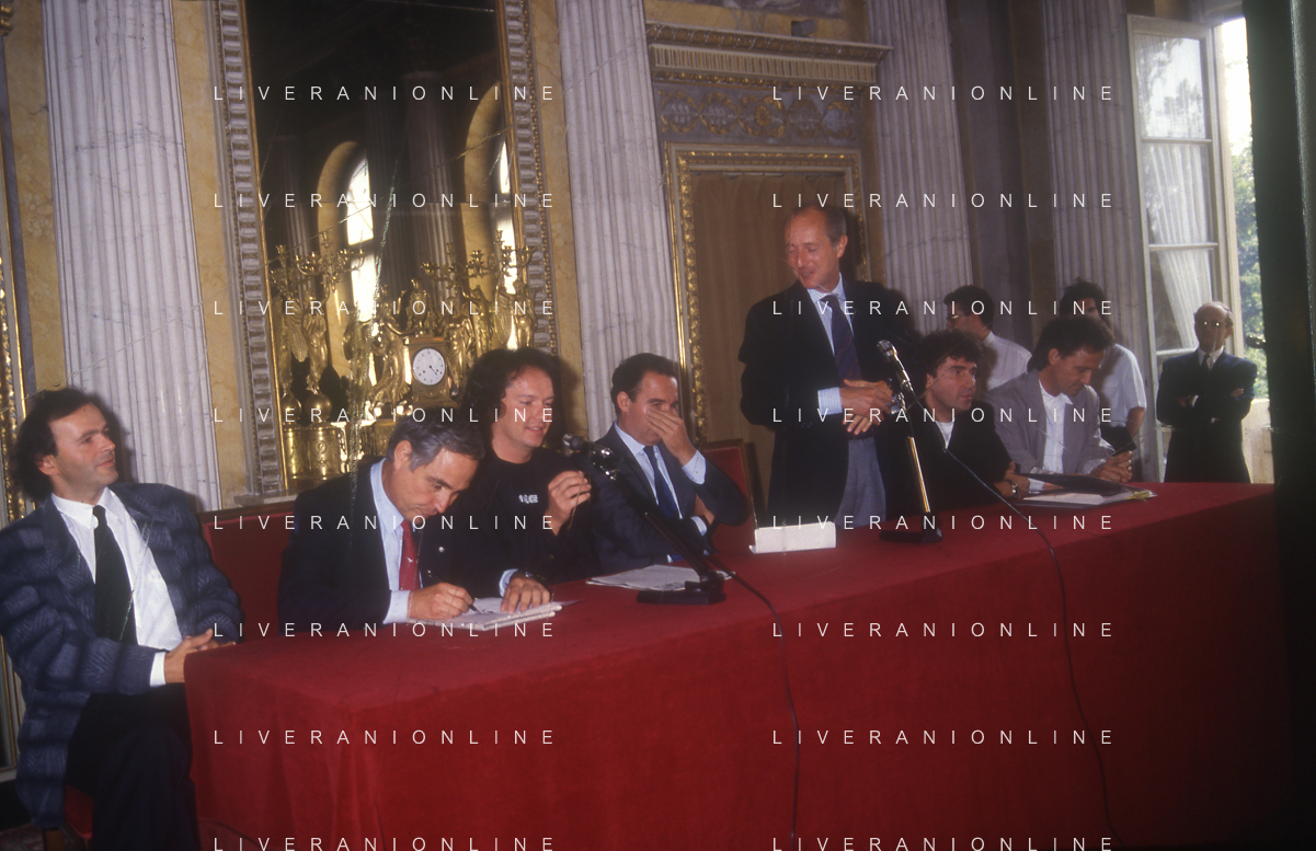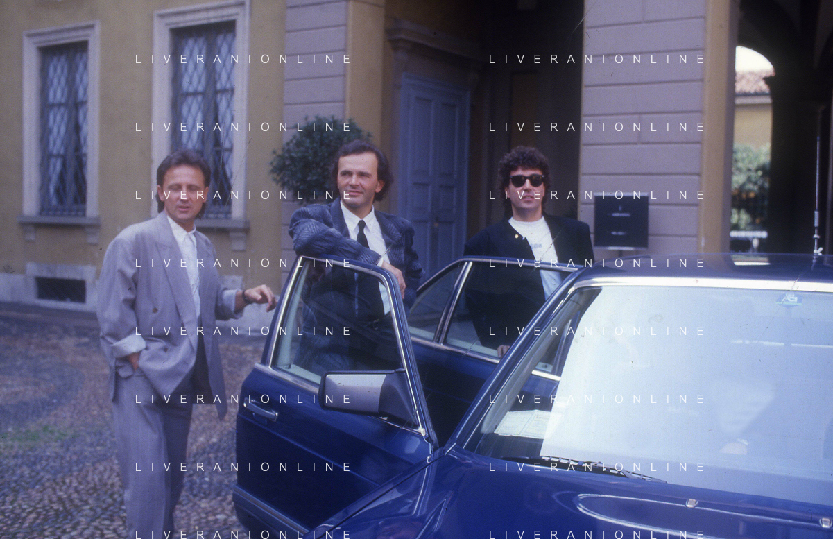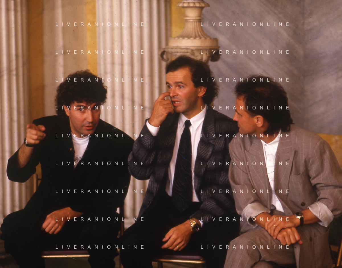 1988 MILANO VILLA REALE CONSEGNA DEL DISCO D'DOROA AL COMPLESSO MUSICALE DEI POOH NELLA FOTO IL COMPLESSO MUSICALE DEI POOH ALLA PRESENZA DEL SINDACO DI MILANO PAOLO PILLITTERI RICEVE IL DISCO D'ORO NELL'ANNO 1988 AG ALDO LIVERANI SAS