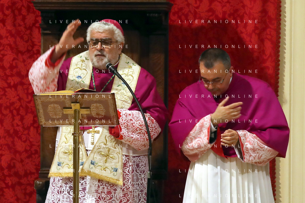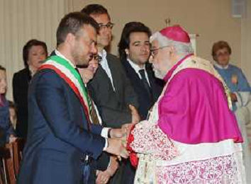 IMOLA 07 05 2023 MADONNA DEL PIRATELLO ARRIVO IN CATTEDRALE DI SAN CASSIANO NELLA FOTO SALUTO TRA VESCOVO DI IMOLA GIOVANNI MOSCIATTI E SINDACO DI IMOLA MARCO PANIERI PRESENTI ANCHE VICE SINDACO FABRIZIO CASTELLARI ROBERTO VISAN PRESIDENTE DEL CONSIGLIO COMUNALE I E NICHOLAS VACCHI VICE PRESIDENTE DEL CONSIGLIO COMUNALE FOTO GIANNI SANNA-AG ALDO LIVERANI SAS