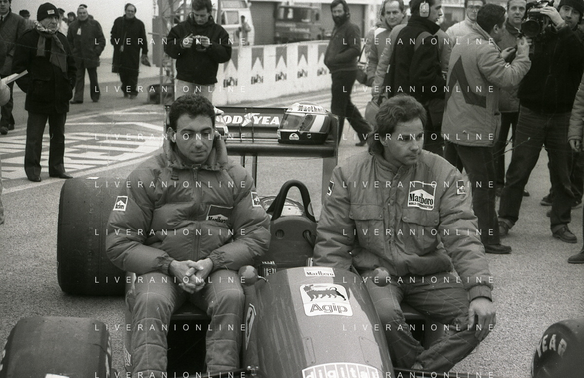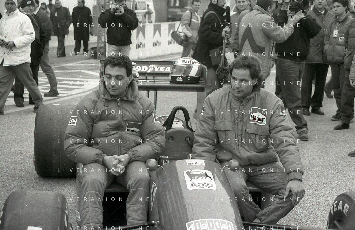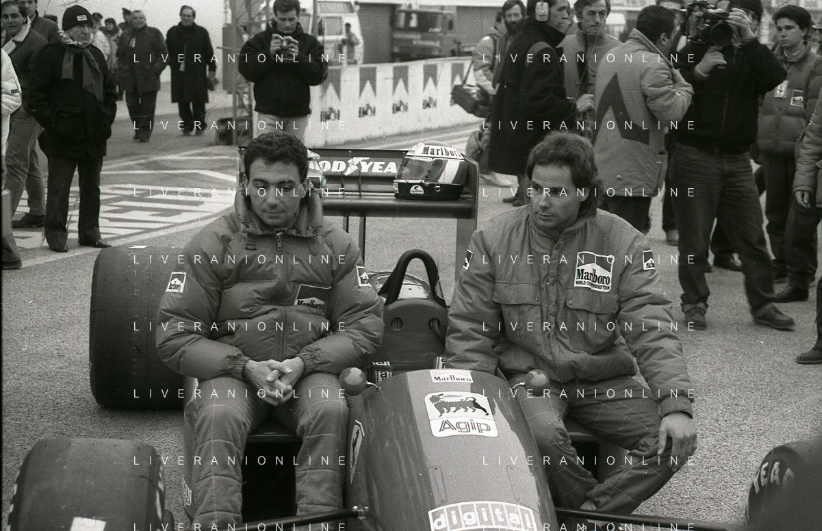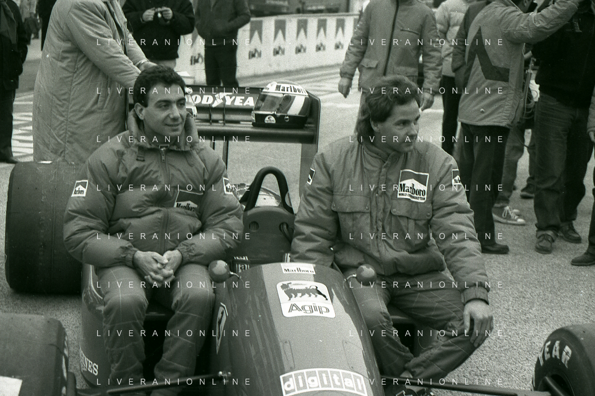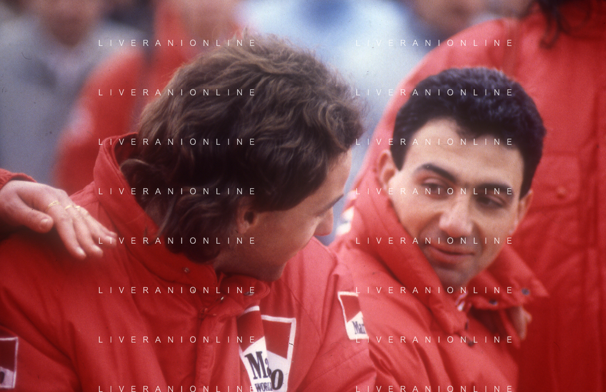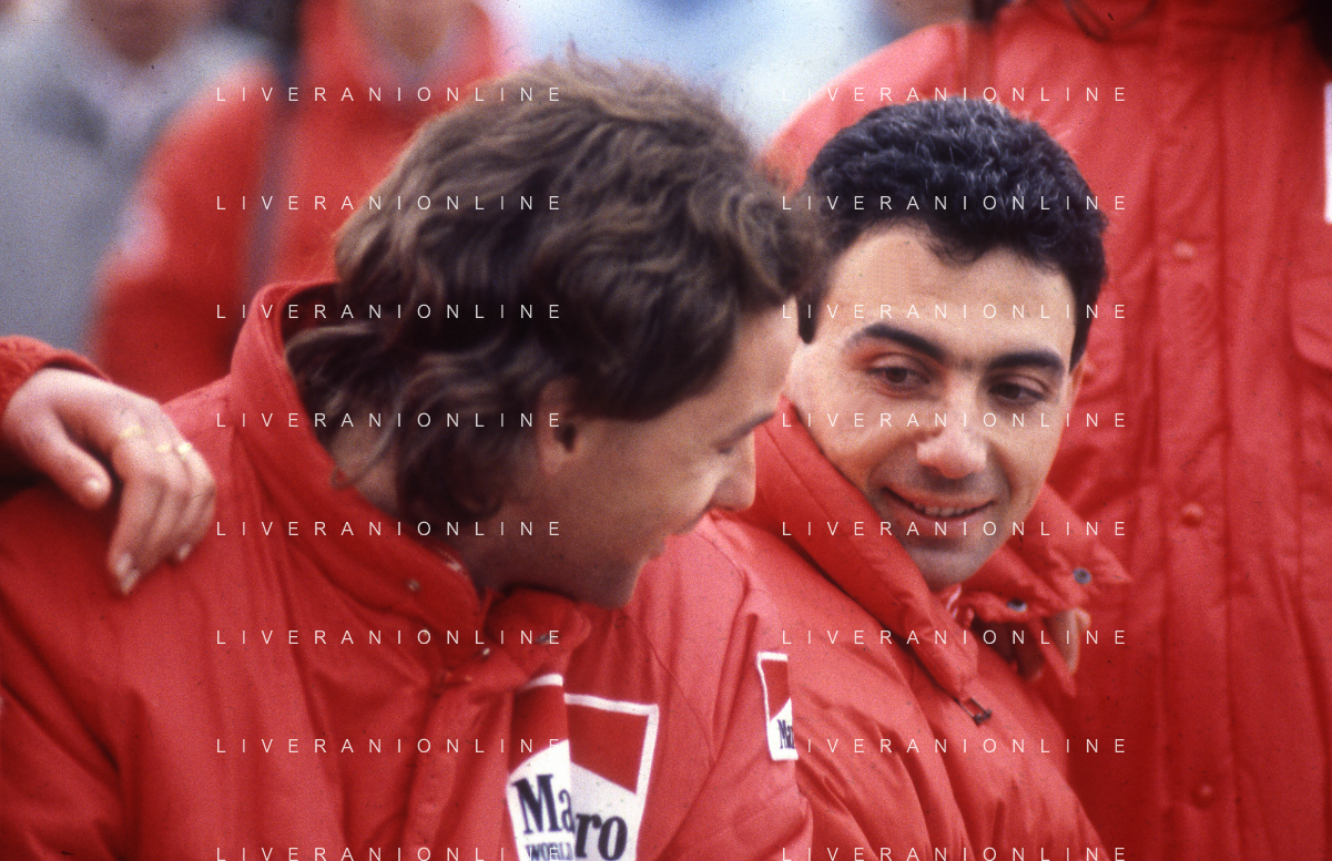 RETROSPETTIVA MICHELE ALBORETO PILOTA F1 NELLA FOTO MICHELE ALBORETO NELL'ANNO 1987 CON GERHARD BERGER AG ALDO LIVERANI SAS