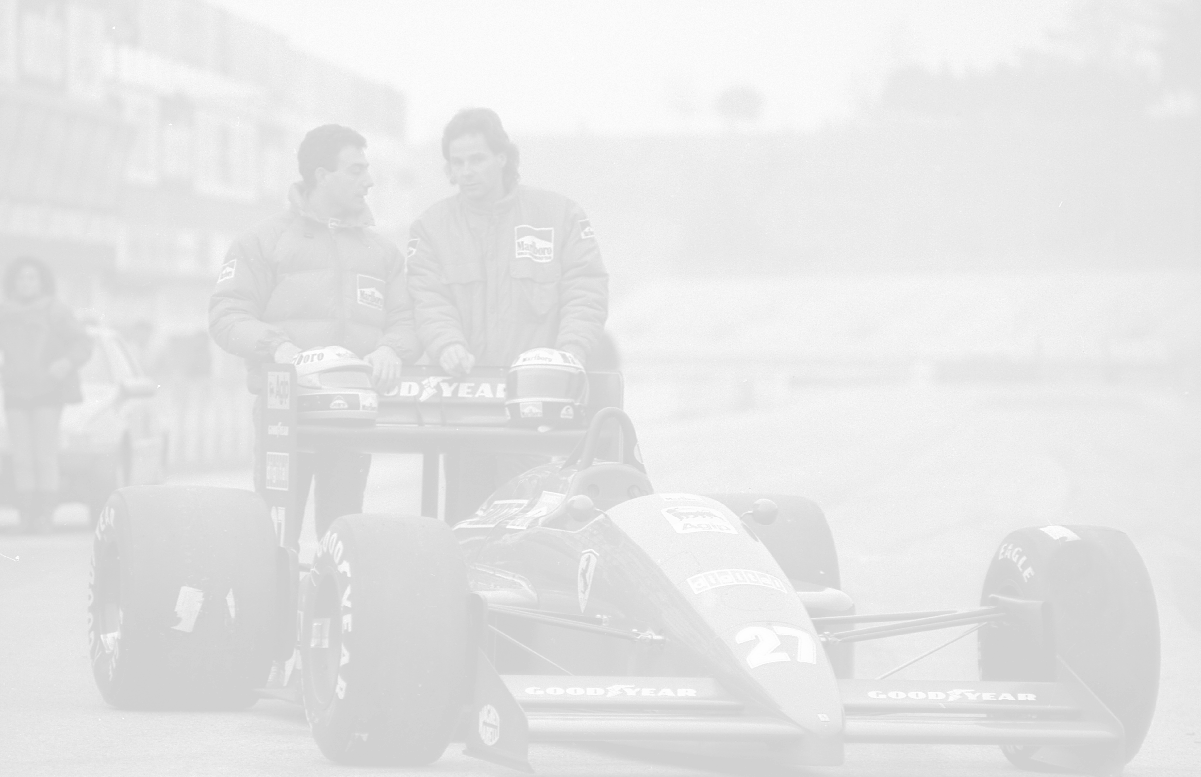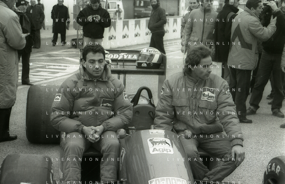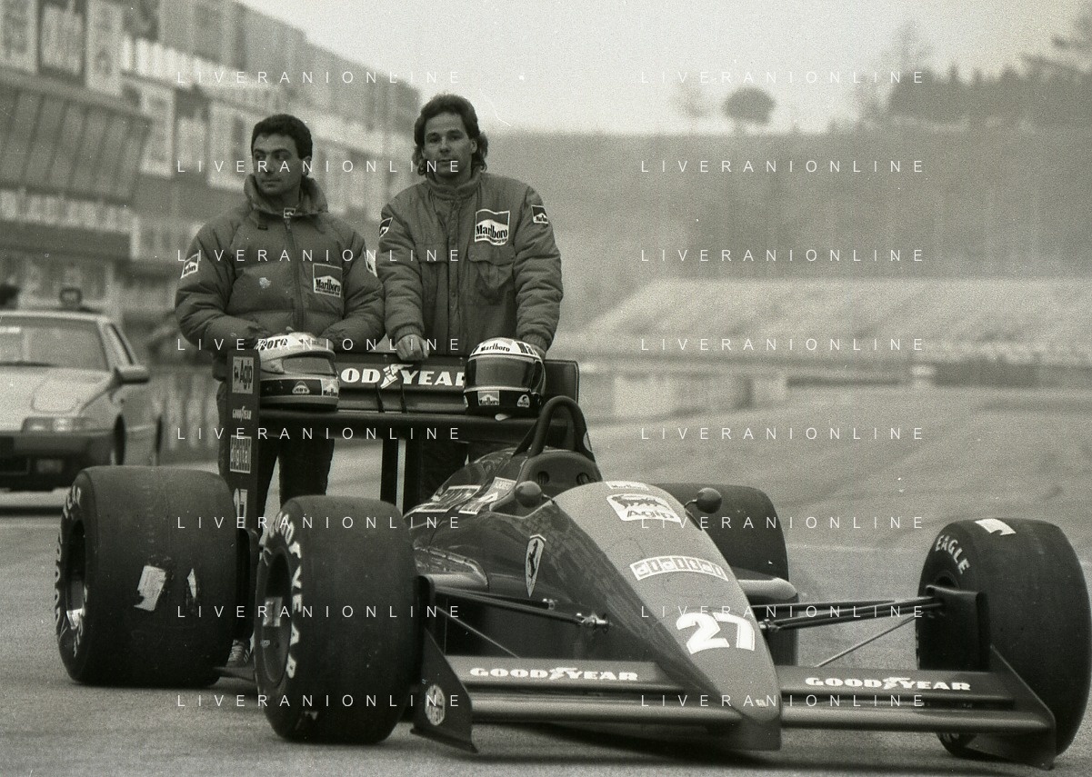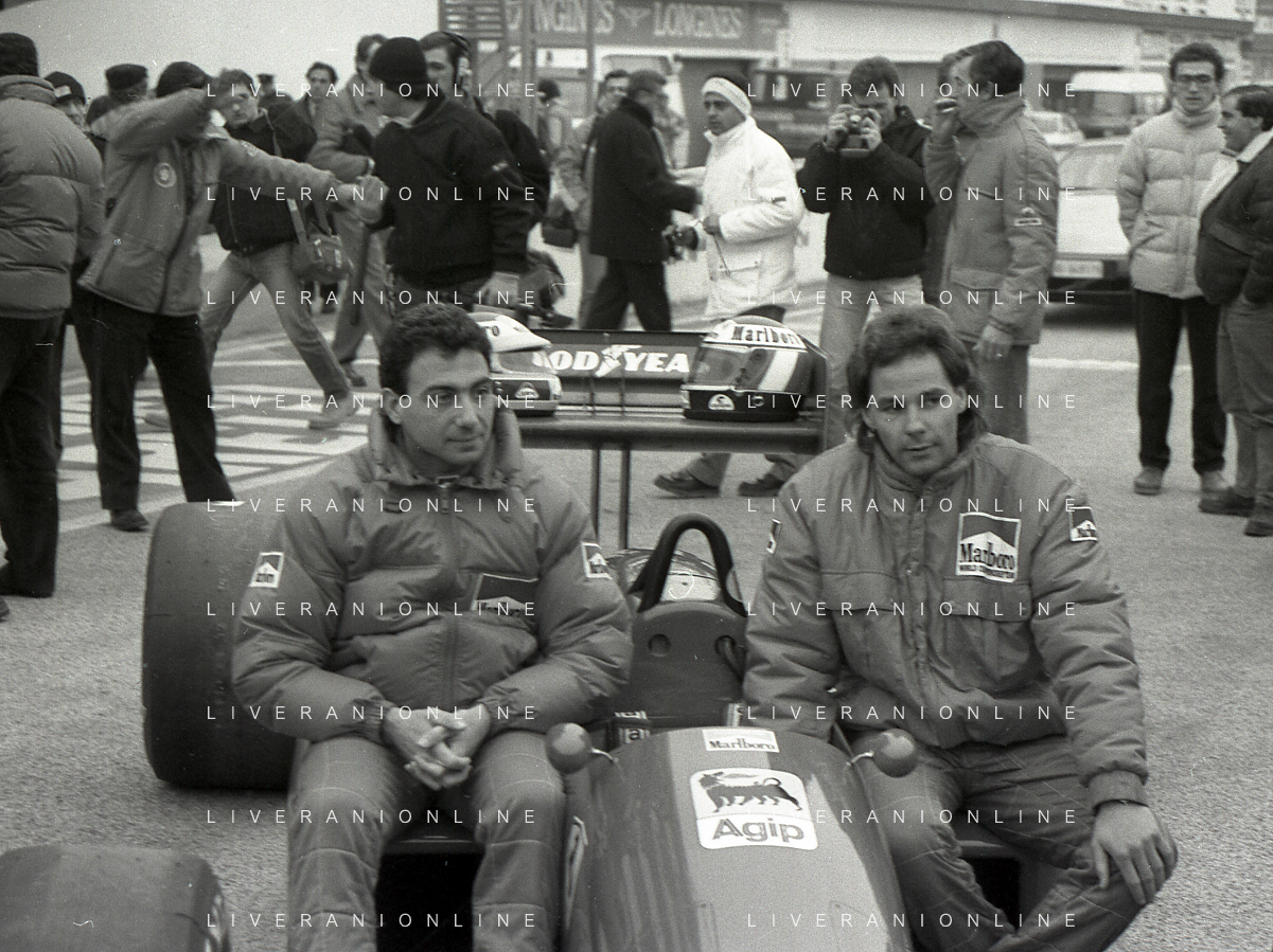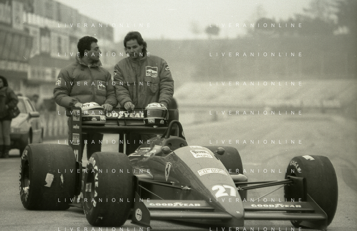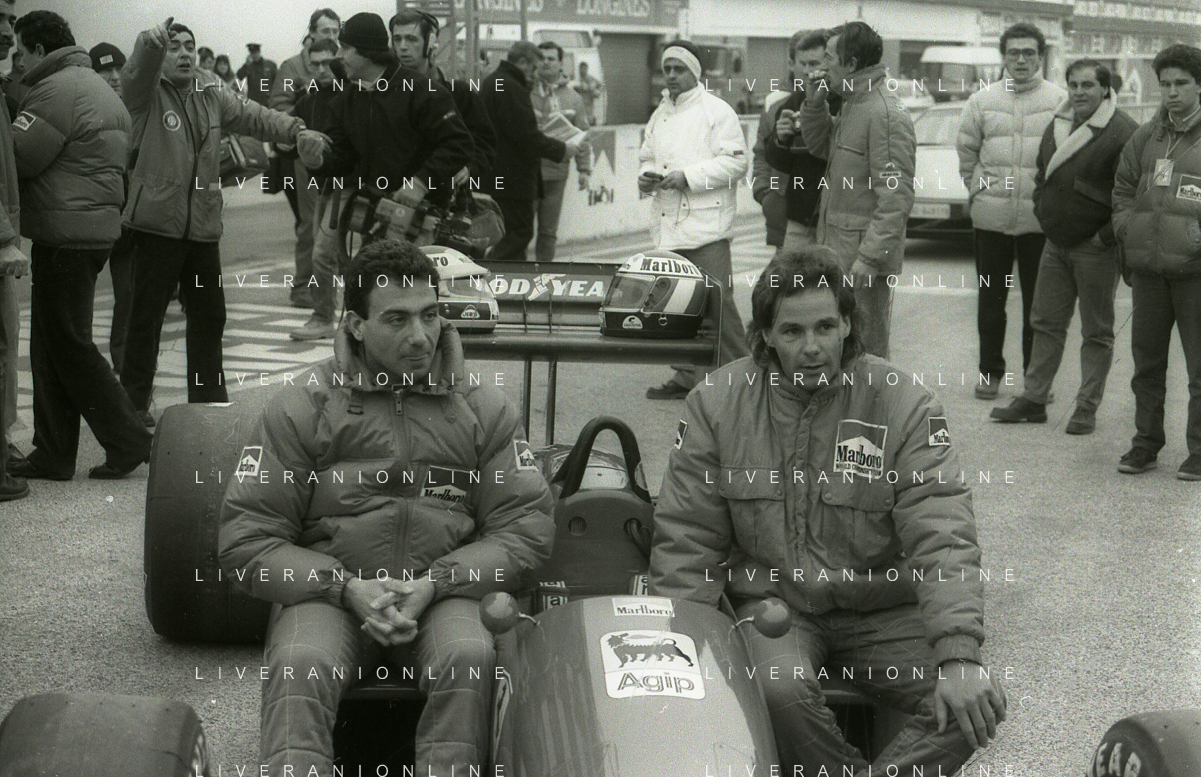 RETROSPETTIVA MICHELE ALBORETO PILOTA F1 NELLA FOTO MICHELE ALBORETO NELL'ANNO 1987 CON GERHARD BERGER AG ALDO LIVERANI SAS