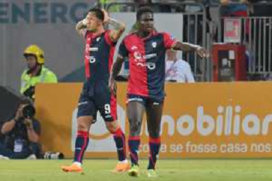 275-2023. Cagliari Calcio-Venezia F.C. Gara preliminare play off BKT 2022/2023, stadio Unipol Domus Cagliari. Foto Salvatore Moi/Aldo Liverani s.a.s. Nella foto: Gol ed esultanta in casa, del Cagliari Calcio contro Venezia F.C. allo stadio Unipol Domuis di Cagliari. Segna: Gianluca Lapdula Cagliari nella foto Nahitan Nandez Cagliari, Antoine Makoumbou Cagliari ©MOI SALVATORE / AGENZIA ALDO LIVERANI SAS