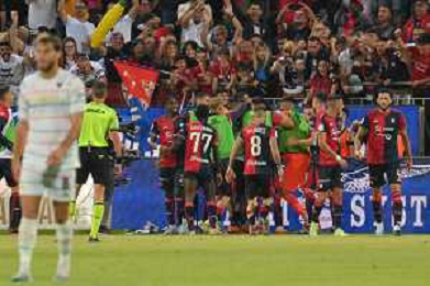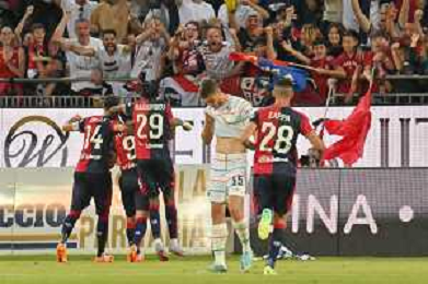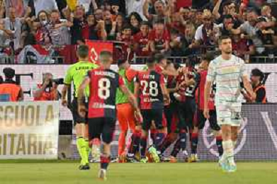 275-2023. Cagliari Calcio-Venezia F.C. Gara preliminare play off BKT 2022/2023, stadio Unipol Domus Cagliari. Foto Salvatore Moi/Aldo Liverani s.a.s. Nella foto: esultanza di Gianluca Lapadula Cagliari, Edoardo Goldaniga Cagliari, Michael Svoboda Venezia delusione ©MOI / AGENZIA ALDO LIVERANI SAS