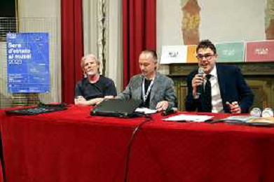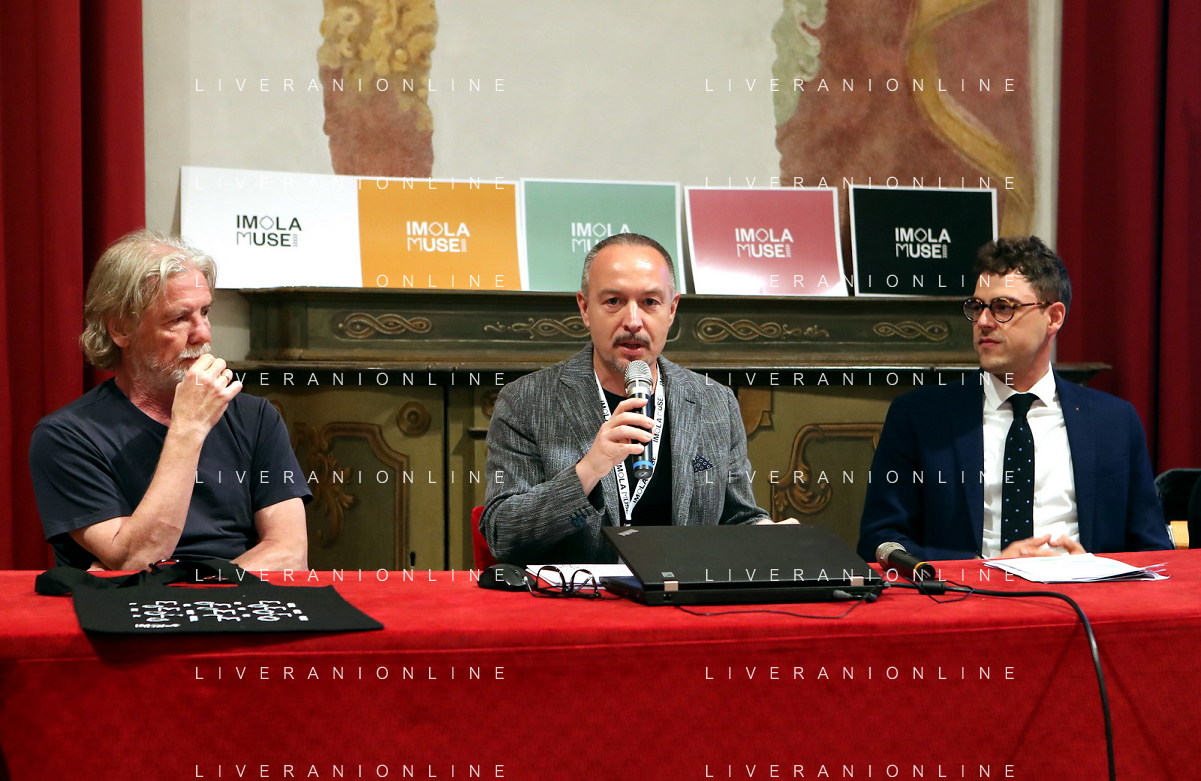 IMOLA 29 05 2023 PALAZZO TOZZONI CONF STAMPA "SERE D'ESTATE AI MUSEI"NELLA FOTO DA SINISTRA RENZO DI RENZO ART DIRETTORE DEL NUOVO LOGO DEI MUSEI ,DIEGO GALIZZI DIRETTORE DEL MUSEO SAN DOMENICO E ASSESSORE ALLA CULTURA GIACOMO GAMBI FOTO GIANNI SANNA-AG ALDO LIVERANI SAS