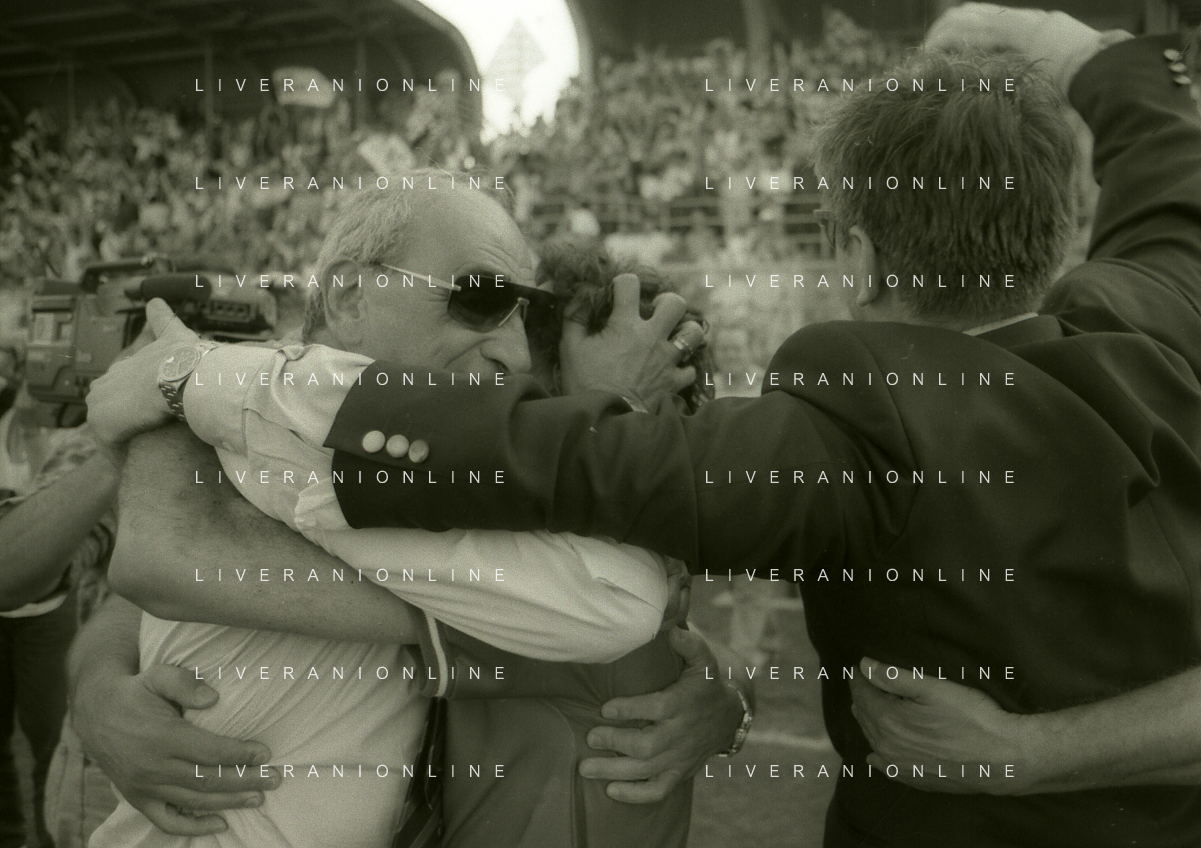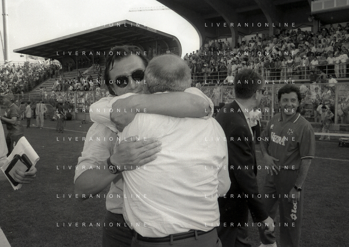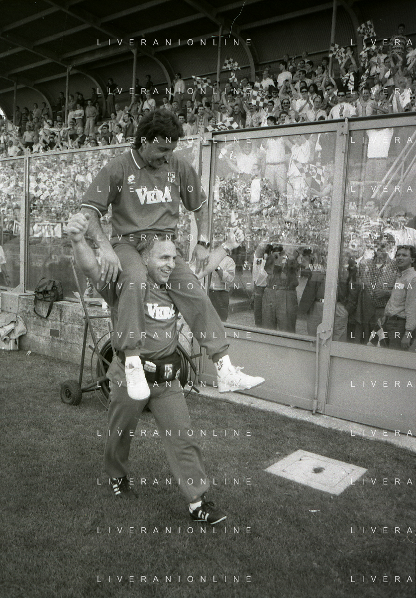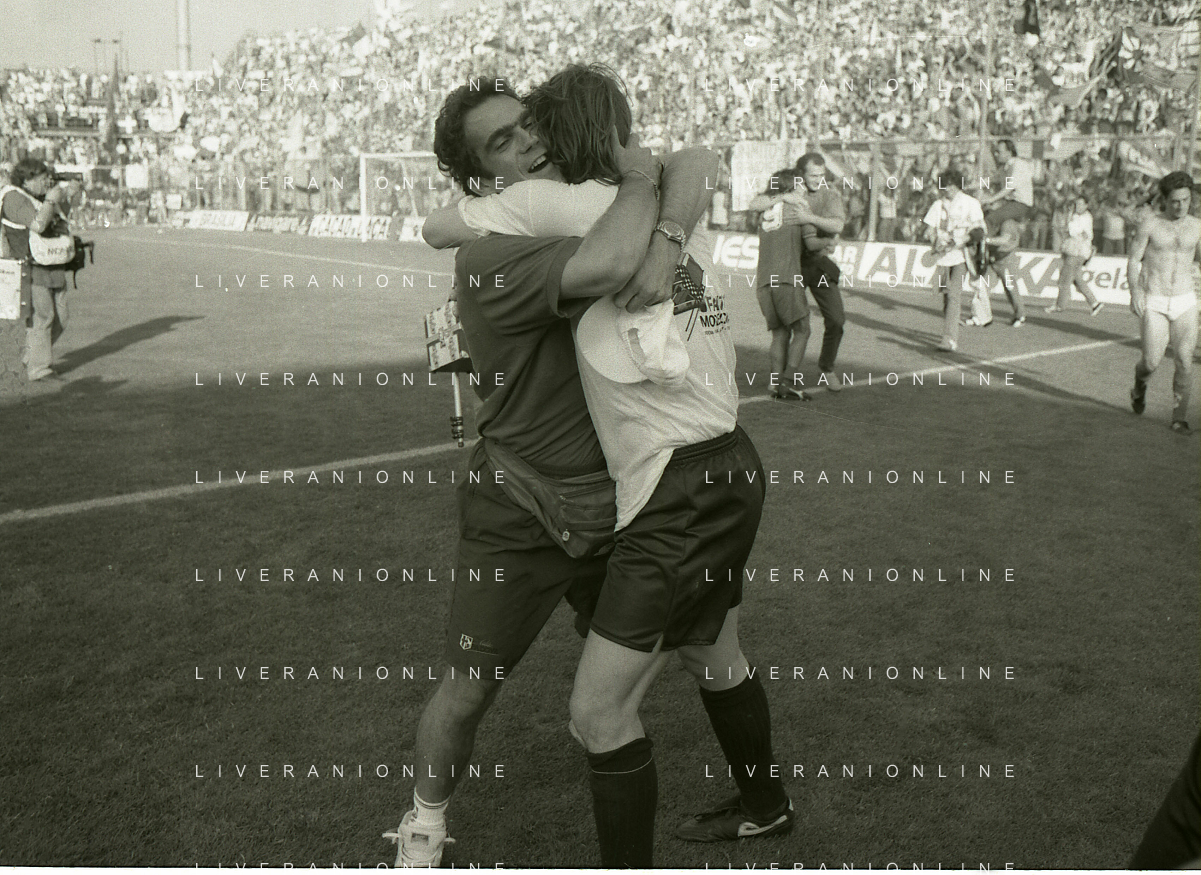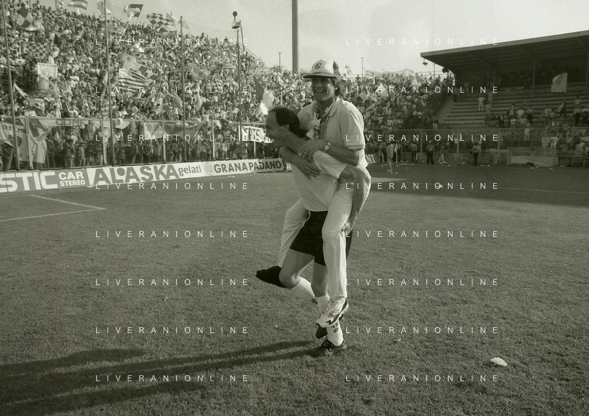 NEG- 15-06-1994 CREMONA SPAREGGIO PER LA PROMOZIONE IN SERIE A PADOVA-CESENA 2-1 NELLA FOTO IL PRESIDENTE DEL PADOVA CALCIO ANDREA GIORDANO ABBRACCIA IL DIRETTORE SPORTIVO PIERO AGGRADI AG ALDO LIVERANI SAS