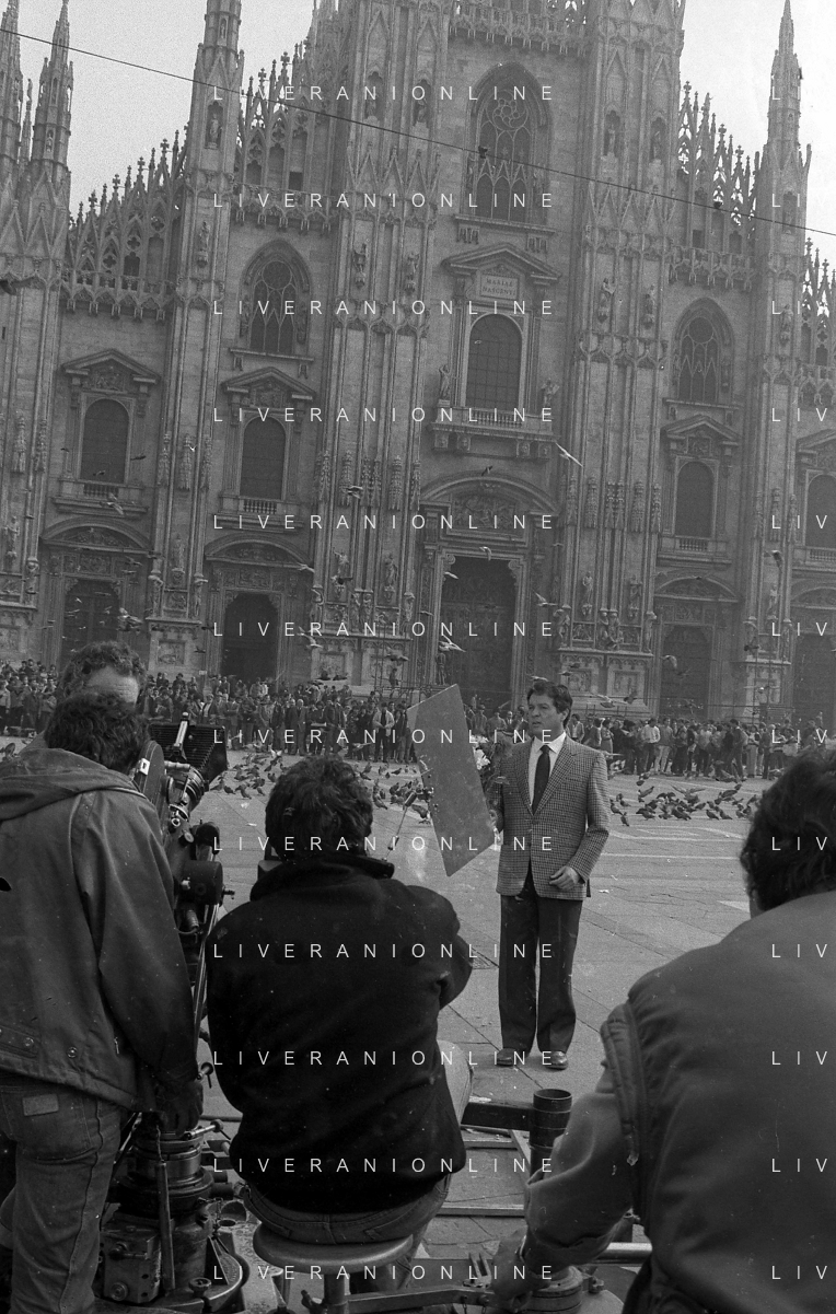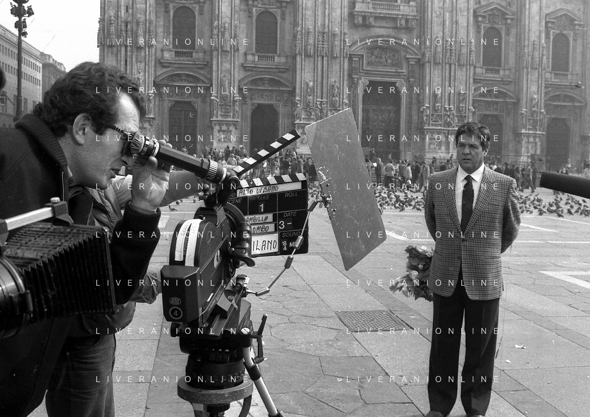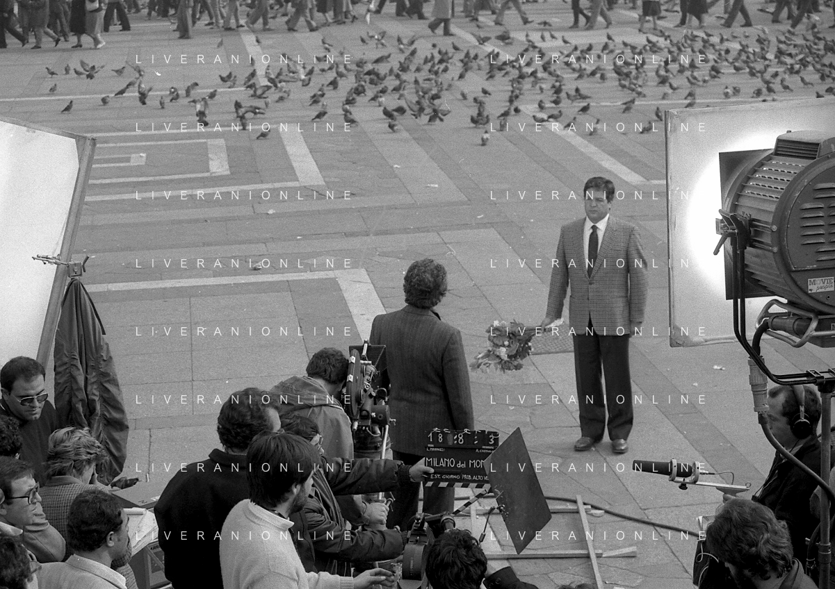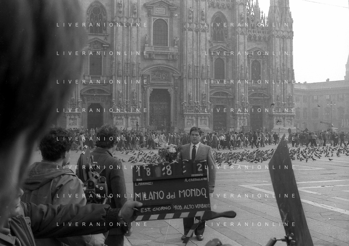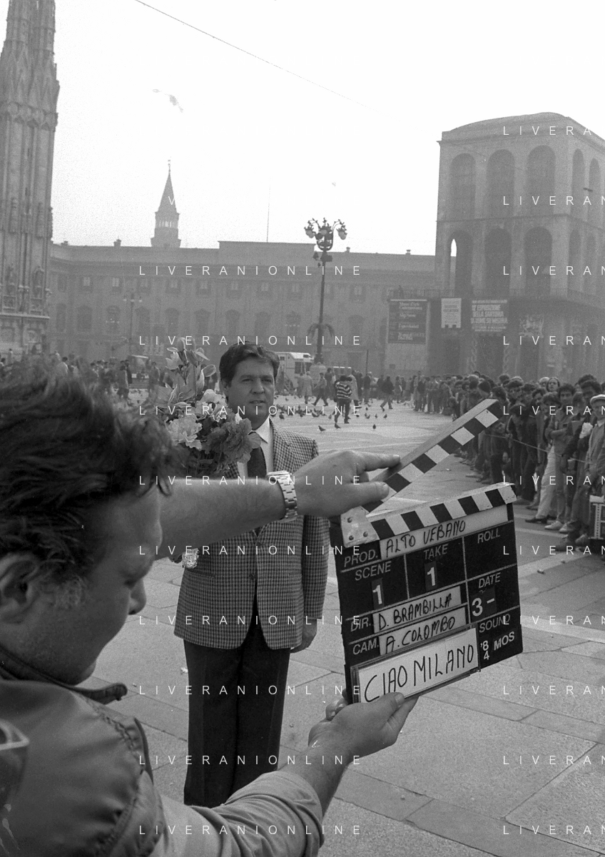 Neg- RETROSPETTIVA RENATO POZZETTO ATTORE NELLA FOTO SUL SET DEL FILM “IL RAGAZZO DI CAMPAGNA“ IN PIAZZA DUOMO A MILANO NELL'ANNO 1984 AG ALDO LIVERANI SAS