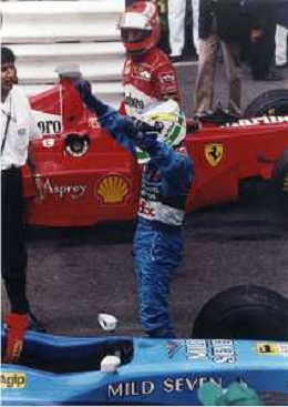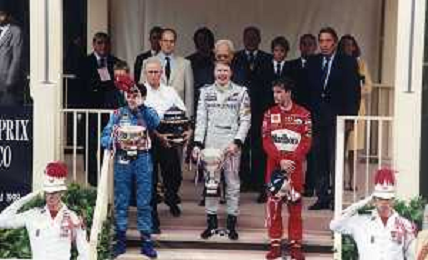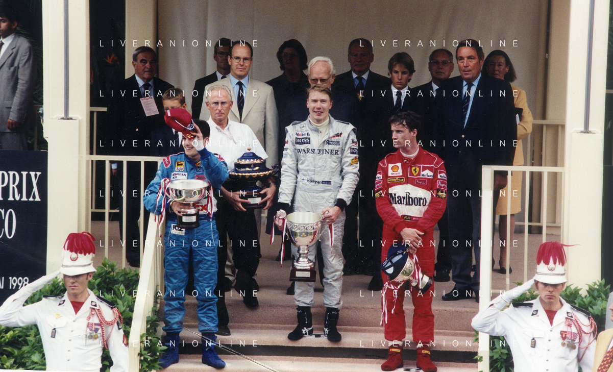 RETROSPETTIVA GIANCARLO FISICHELLA PILOTA F1 NELLA FOTO GIANCARLO FISICHELLA NELL'ANNO 1998 GP MONTECARLO MIKKA HAKKINEN E EDDIE IRVINE AG CONTROLUCE.-AG ALDO LIVERANI SAS