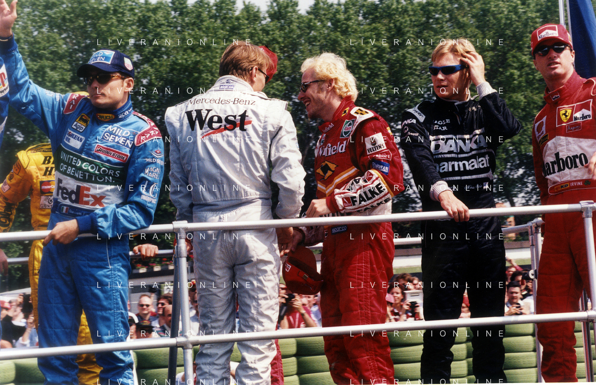 RETROSPETTIVA GIANCARLO FISICHELLA PILOTA F1 NELLA FOTO GIANCARLO FISICHELLA NELL'ANNO 1998 AL GP DI IMOLA CON MIKKA HAKKINEN-JAVQUES VILLENEUVE SALO-EDDIE IRVINE AG CONTROLUCE.-AG ALDO LIVERANI SAS