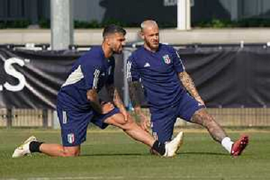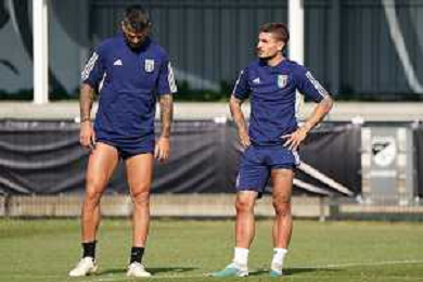 Leonardo Spinazzola (Italy) and Marco Verratti (Italy) during the Training Session of Italy on June 17, 2023 at Kvv Quick'20, in Oldenzaal, Netherlands ©Emmanuele Mastrodonato / AG ALDO LIVERANI SAS
