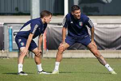 Leonardo Spinazzola (Italy) and Federico Dimarco (Italy) during the Training Session of Italy on June 17, 2023 at Kvv Quick'20, in Oldenzaal, Netherlands ©Emmanuele Mastrodonato / AG ALDO LIVERANI SAS