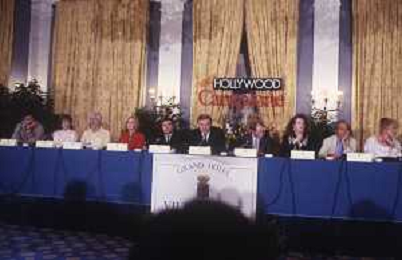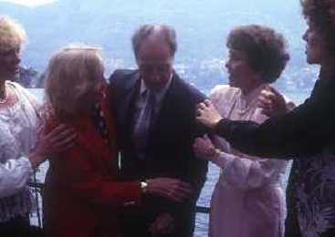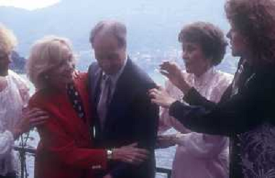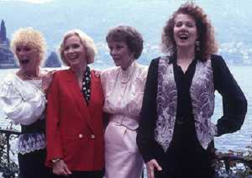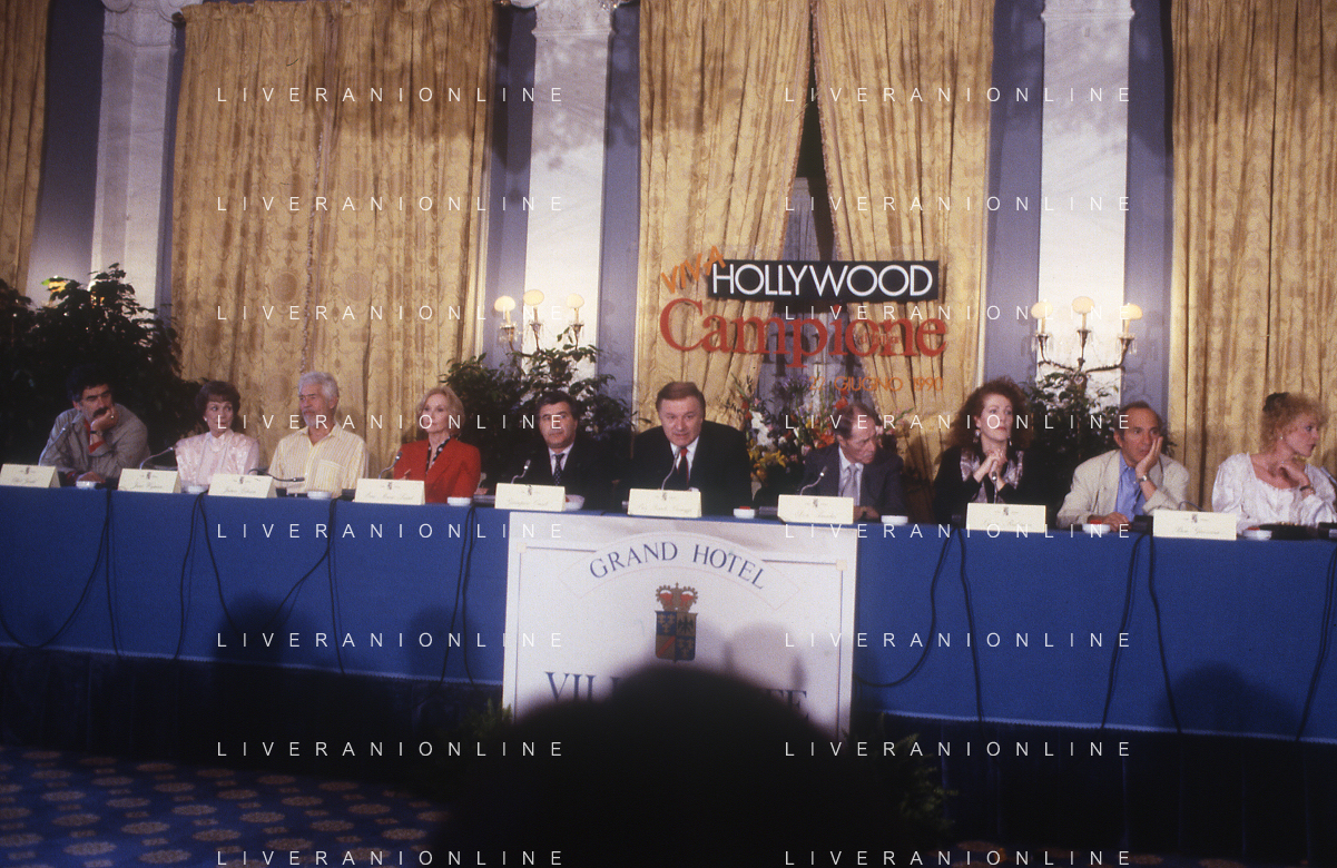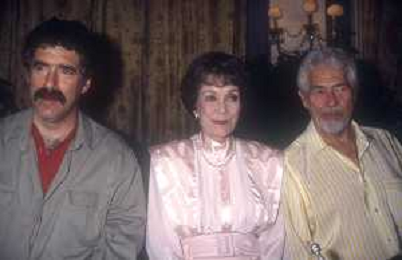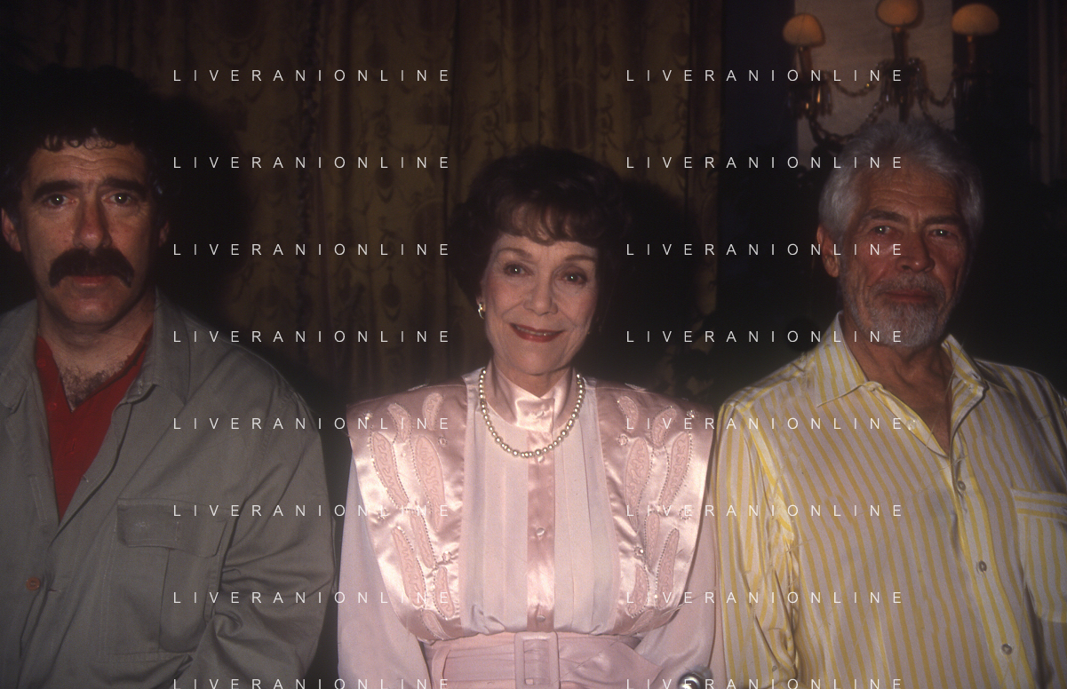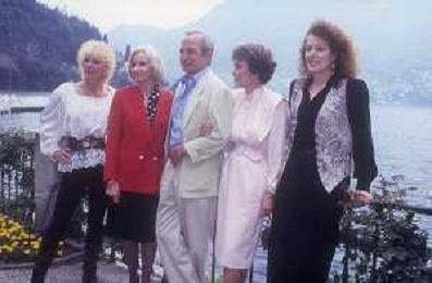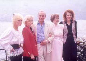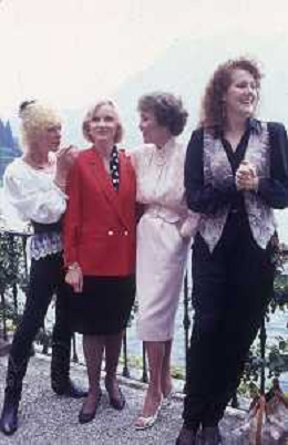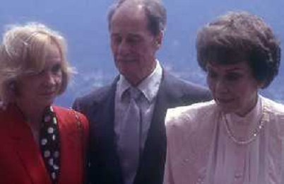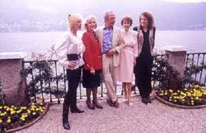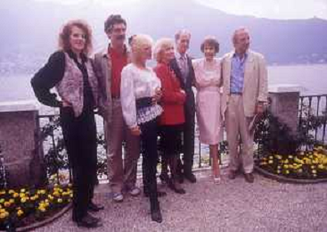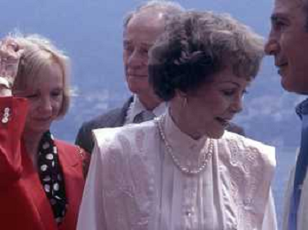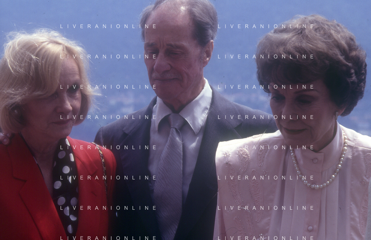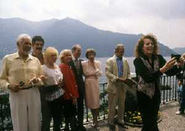 COL-RETROSPETTIVA JANE WYMAN PSEUDONIMO DI SARAH JANE MAYFIELD ATTRICE CANTANTE E BALLERINA NELLA FOTO JANE WYMAN PSEUDONIMO DI SARAH JANE MAYFIELD A CERNOBBIO VILLA D'ESTE NELL'ANNO 1990 CON ELLIOTT GOULD E JAMES COBURN FOTO THEMA-AG ALDO LIVERANI SAS