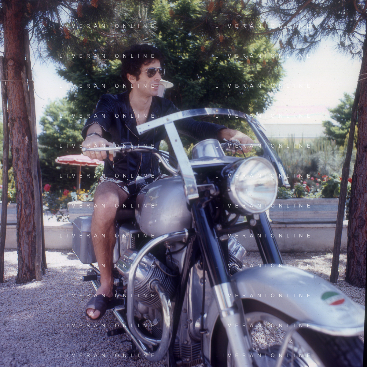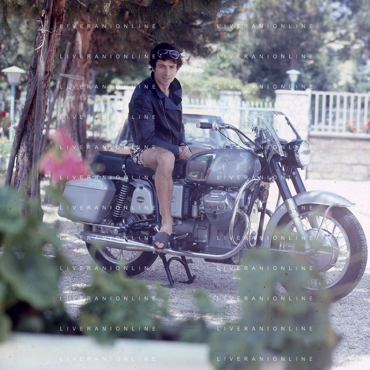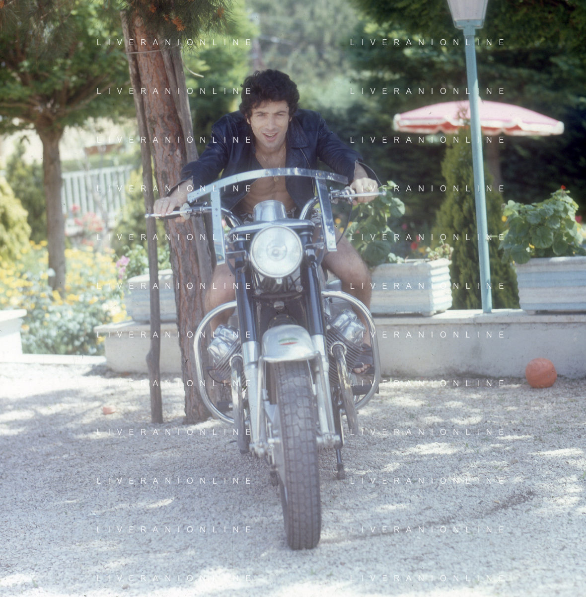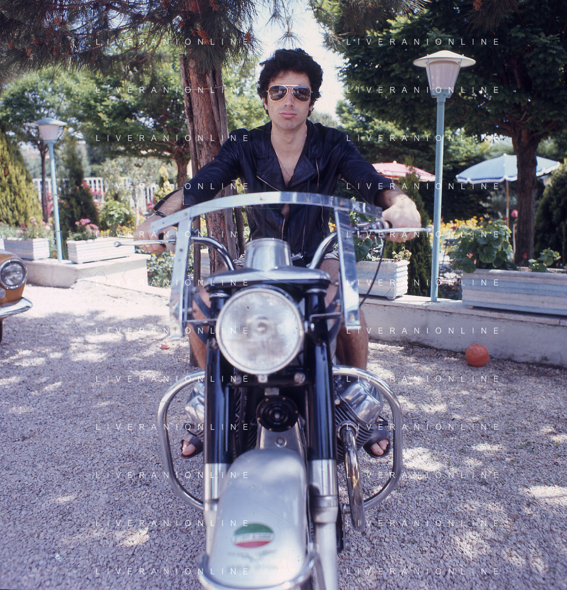 COL--RETROSPETTIVA DON BACKY PSEUDONIMO DI ALDO CAPONI CANTAUTORE ATTORE E SCRITTORE NELLA FOTO DON BACKY SULLA MOTOCICLETTA GUZZI AG ALDO LIVERANI SAS