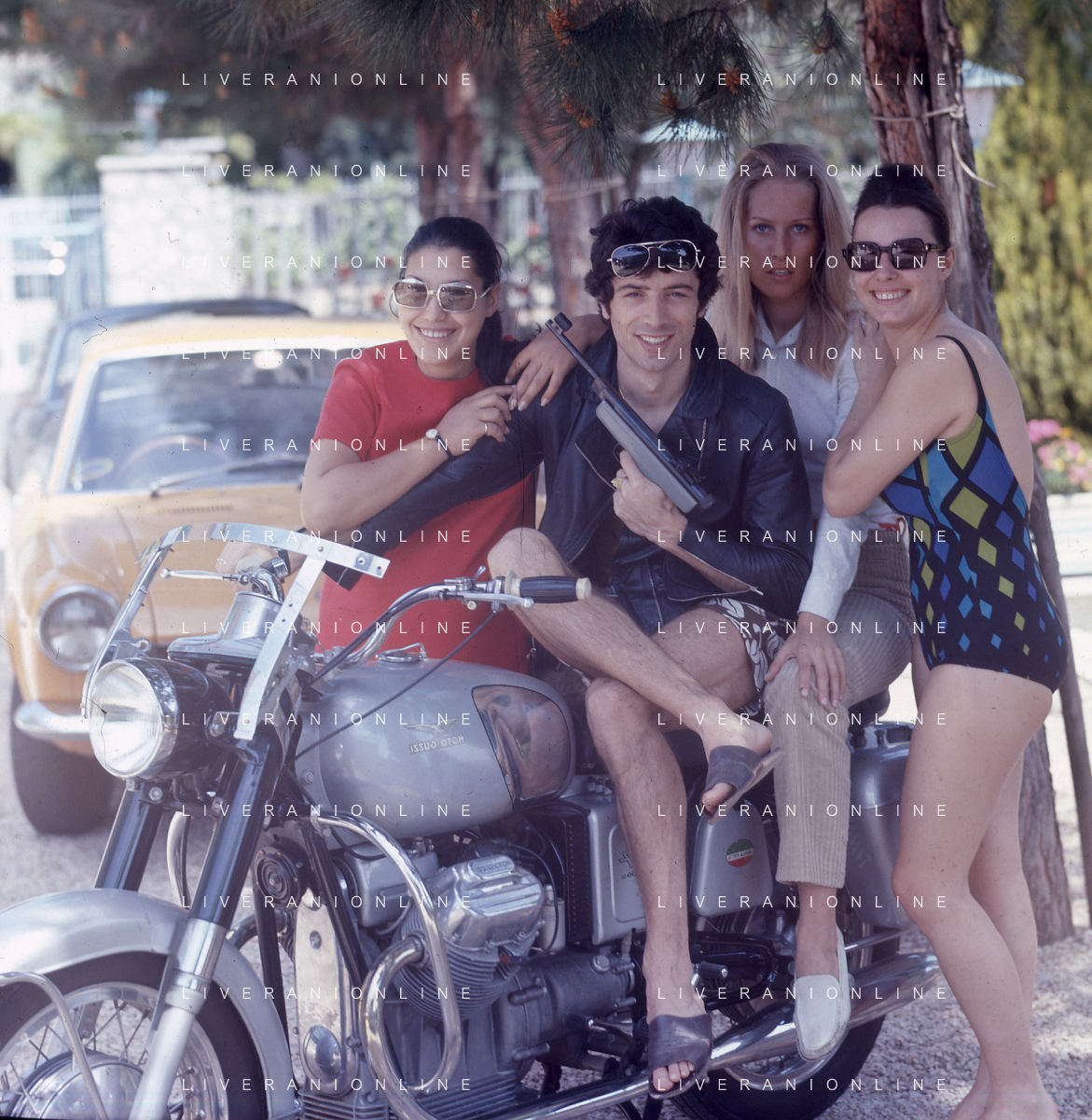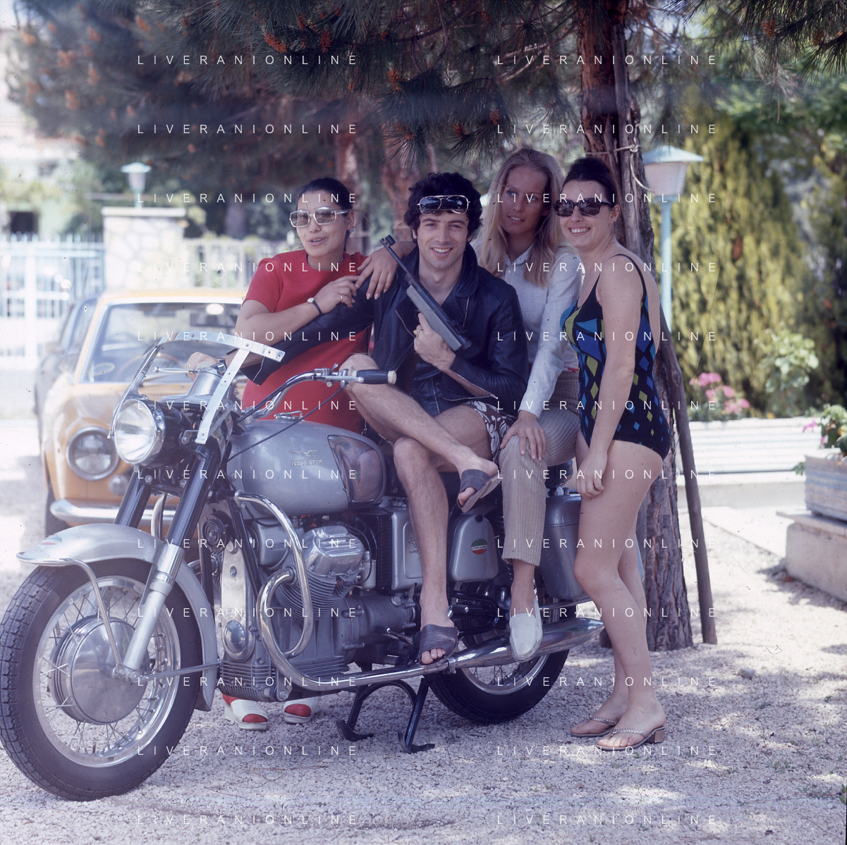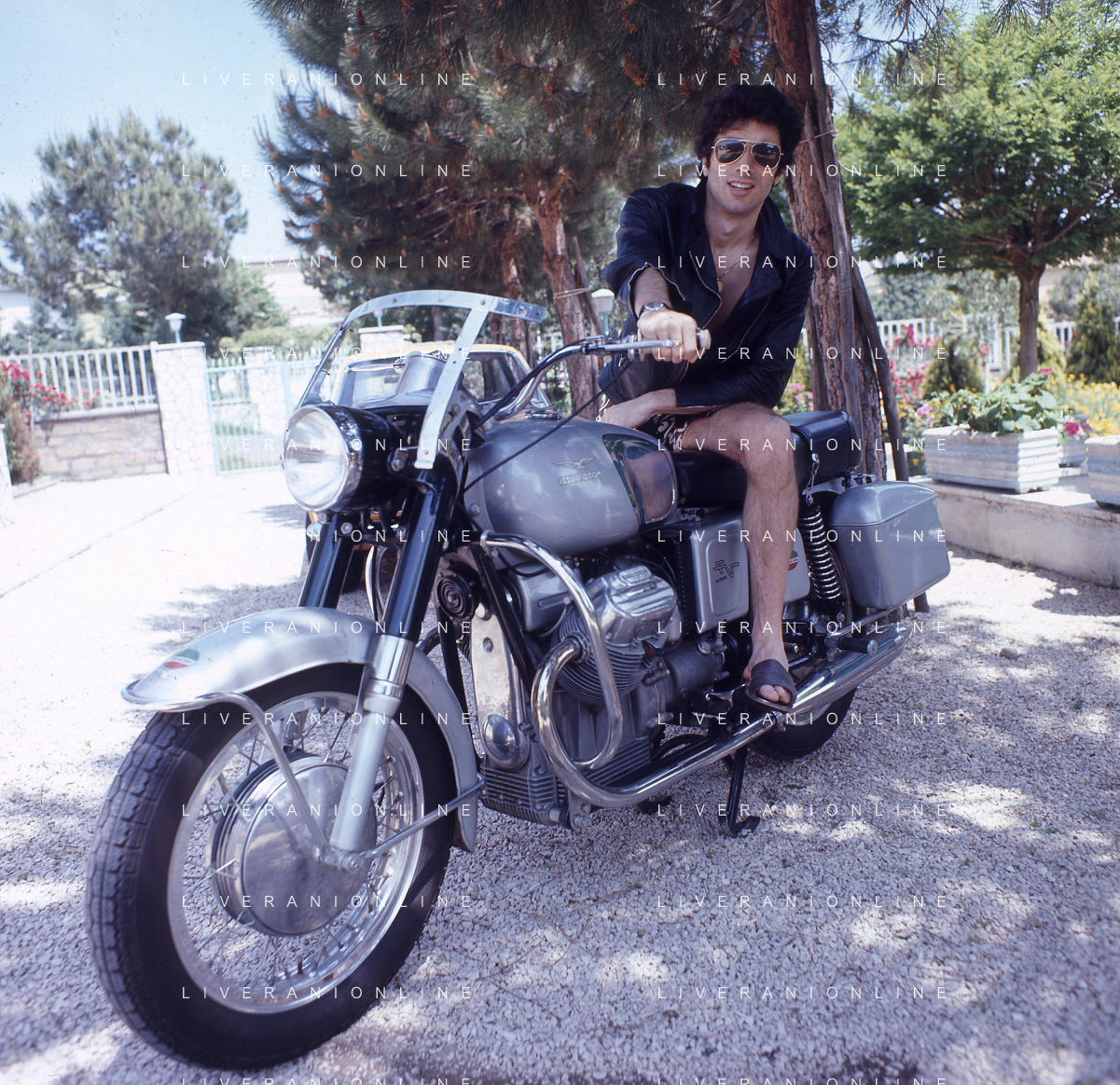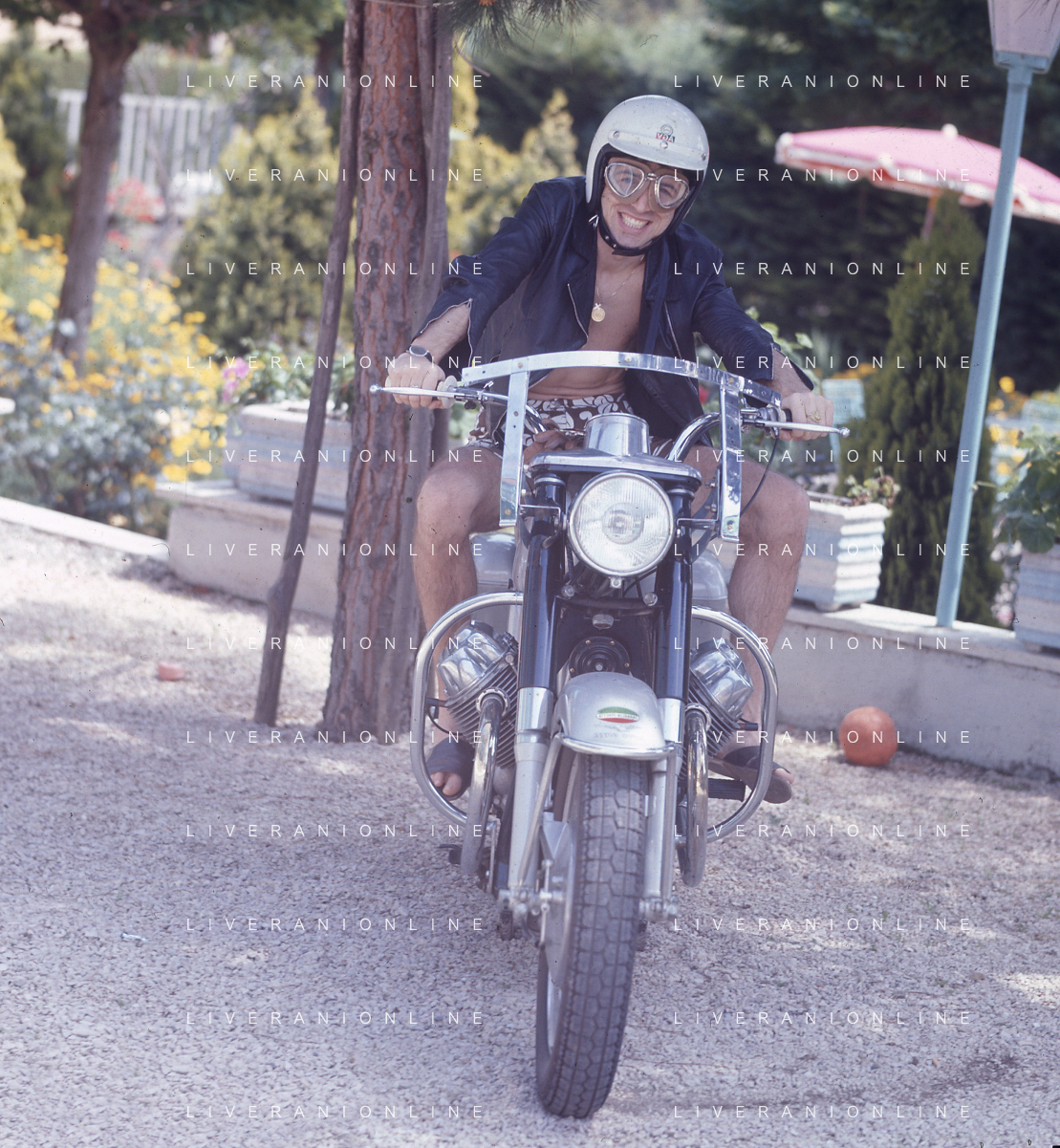 COL--RETROSPETTIVA DON BACKY PSEUDONIMO DI ALDO CAPONI CANTAUTORE ATTORE E SCRITTORE NELLA FOTO DON BACKY SULLA MOTOCICLETTA GUZZI AG ALDO LIVERANI SAS