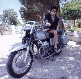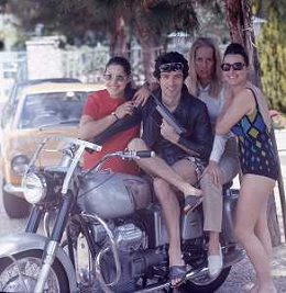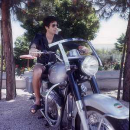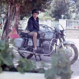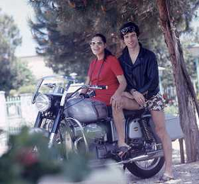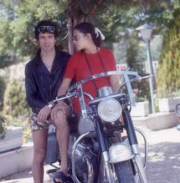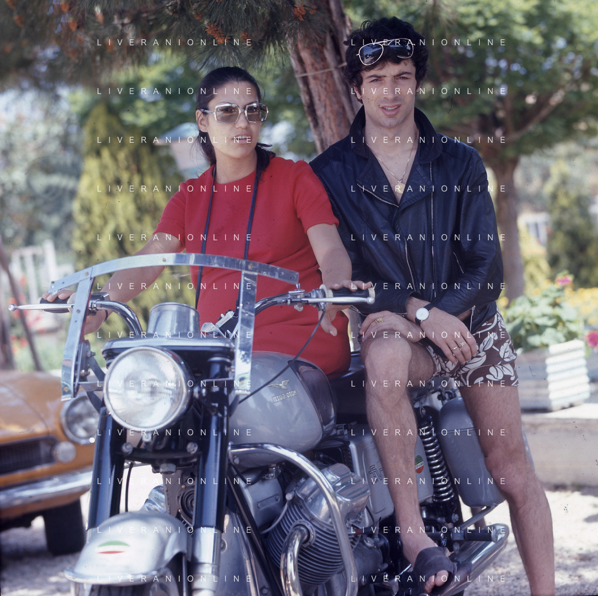 COL--RETROSPETTIVA DON BACKY PSEUDONIMO DI ALDO CAPONI CANTAUTORE ATTORE E SCRITTORE NELLA FOTO DON BACKY SULLA MOTOCICLETTA GUZZI CON LILIANA PETRALIA AG ALDO LIVERANI SAS