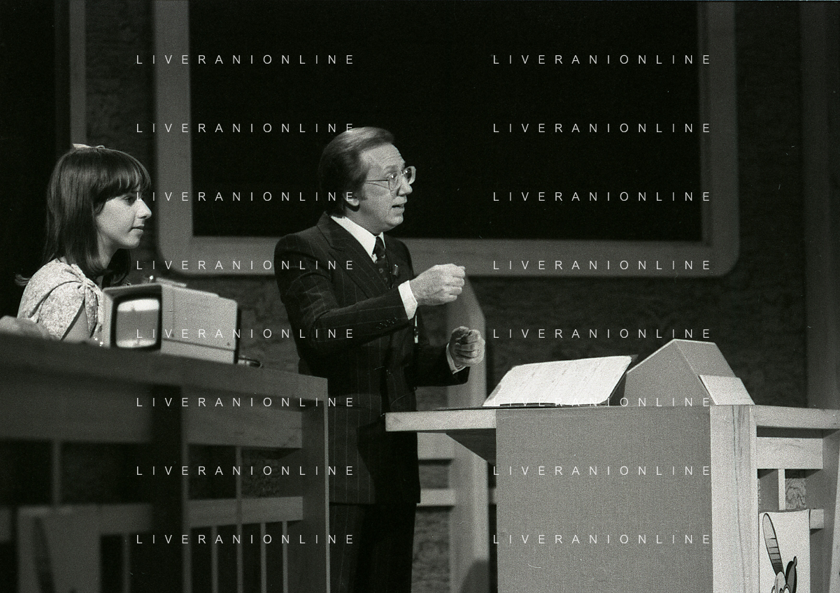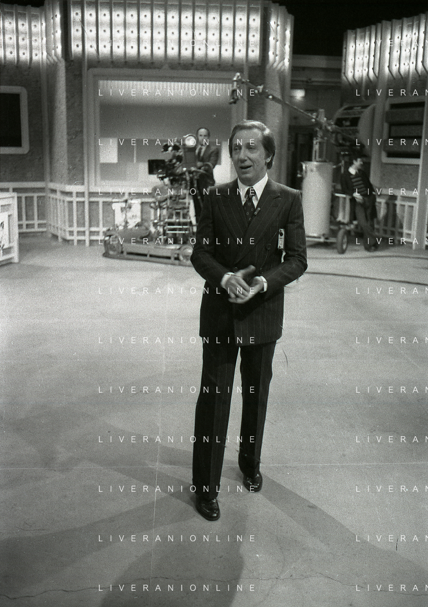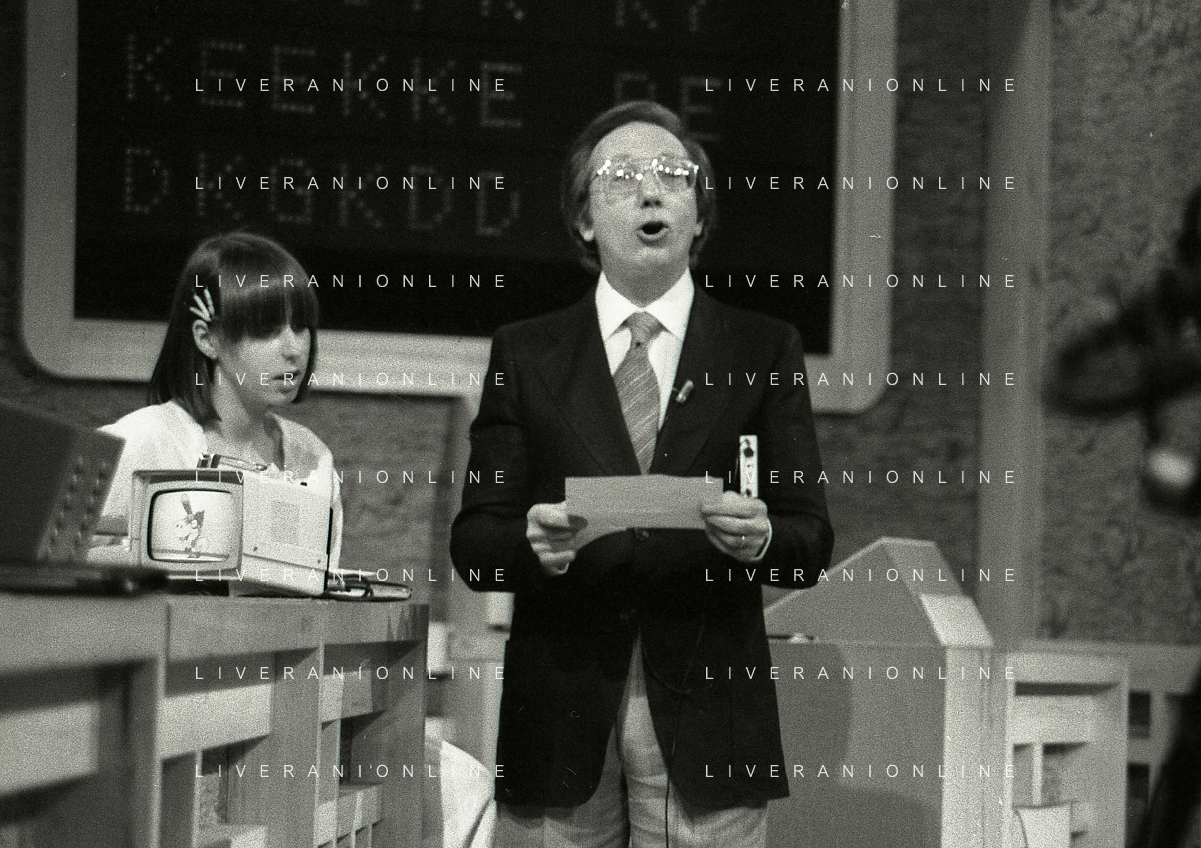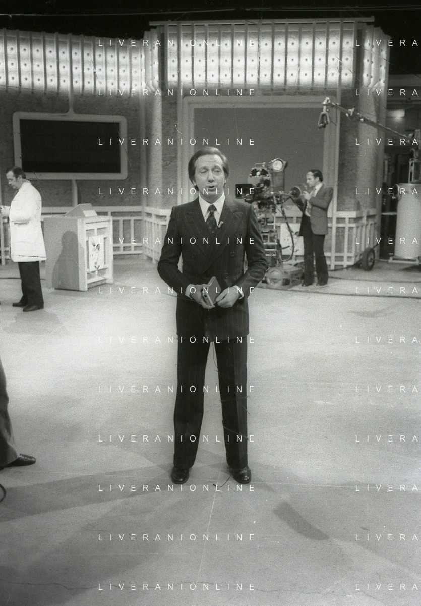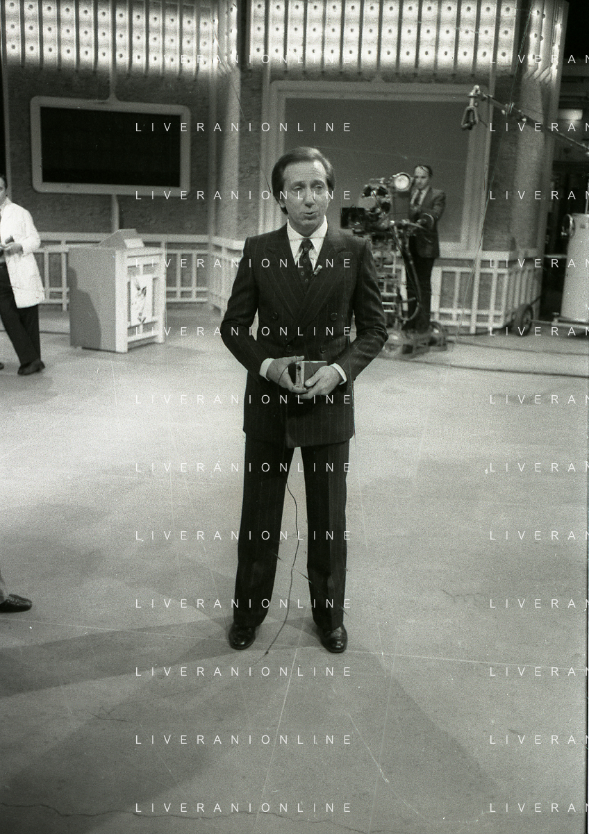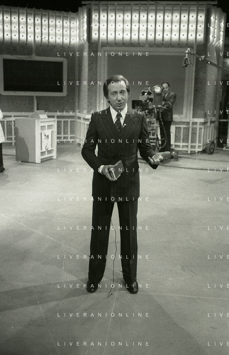 NEG-RETROSPETTIVA MIKE BONGIORNO PRESENTATORE TELEVISIVO NELLA FOTO MIKE BONGIORNO NELLA TRASMISSIONE TELEVISIVA SCOMMETTIAMO NELL'ANNO 1977-1978 AG ALDO LIVERANI SAS