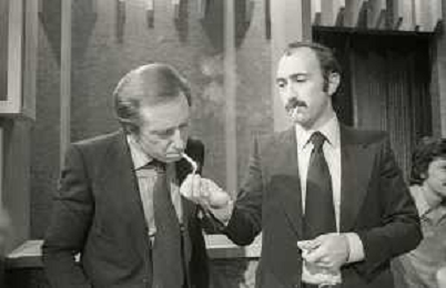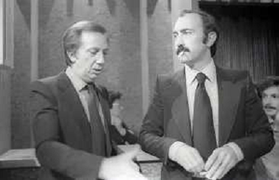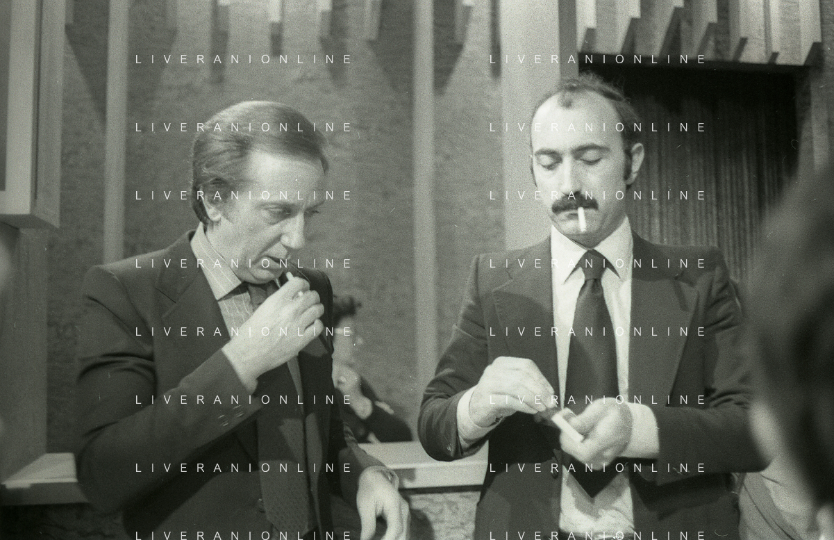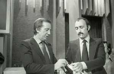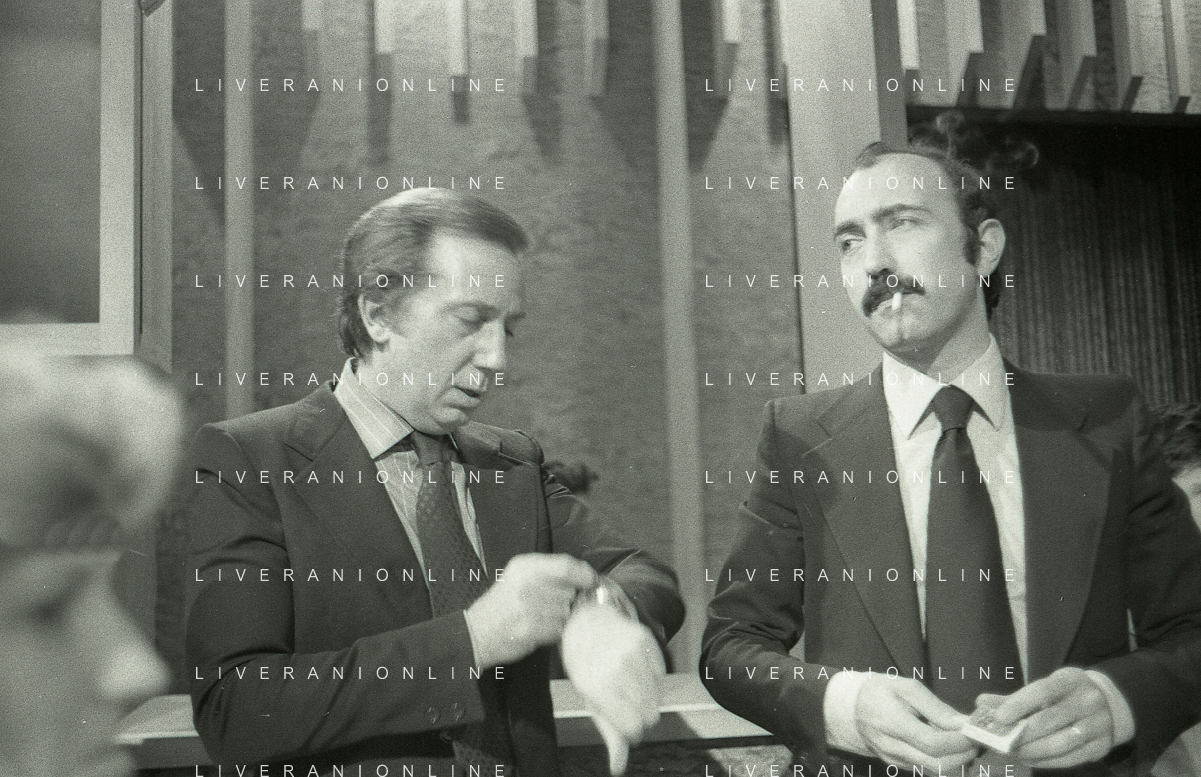 NEG-RETROSPETTIVA MIKE BONGIORNO PRESENTATORE TELEVISIVO NELLA FOTO MIKE BONGIORNO CON LUDOVICO PEREGRINI NELLA TRASMISSIONE TELEVISIVA SCOMMETTIAMO NELL'ANNO 1977-1978 AG ALDO LIVERANI SAS