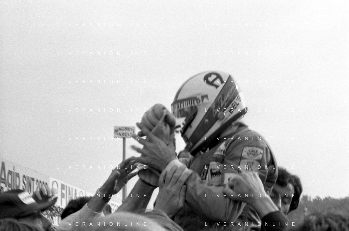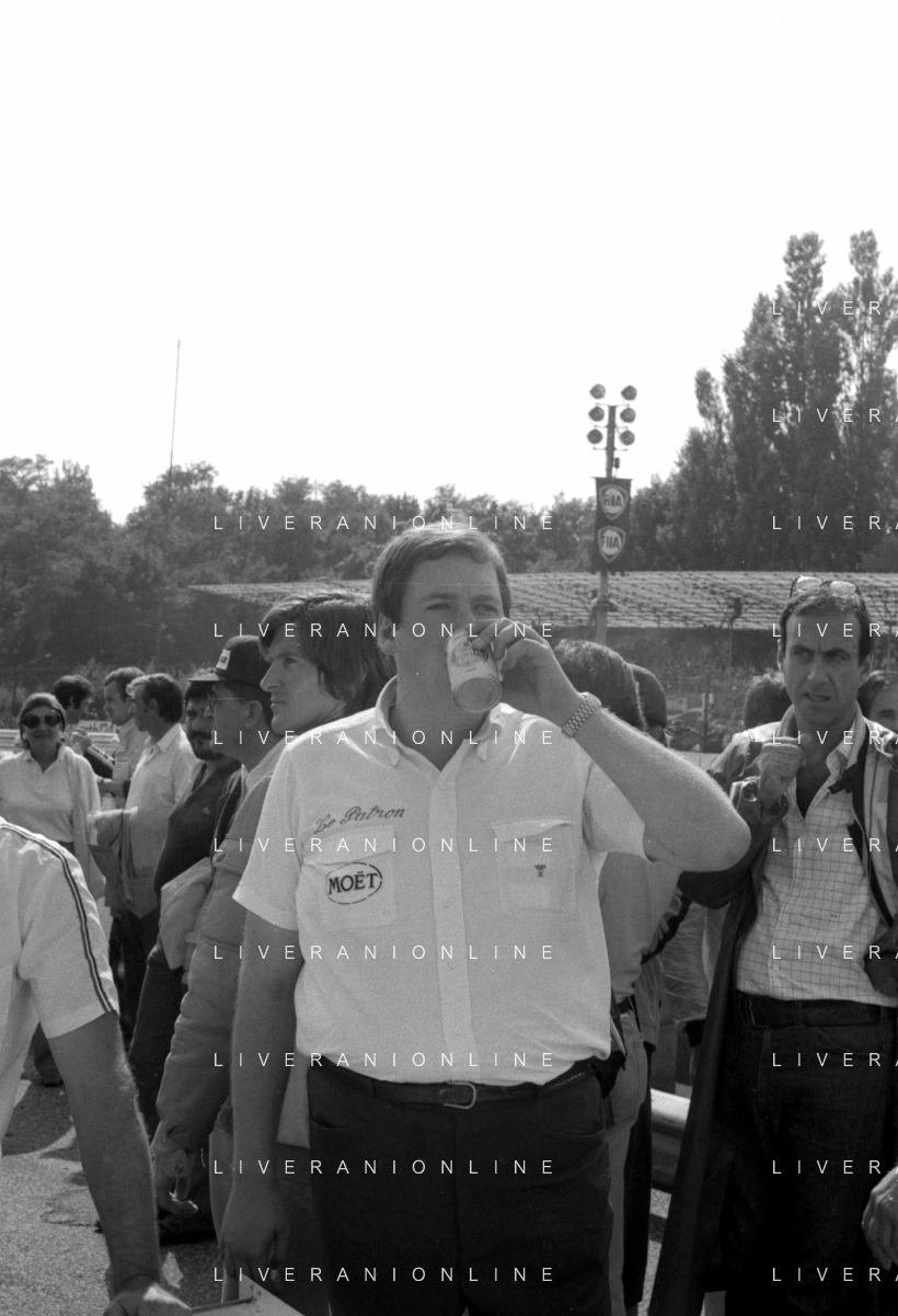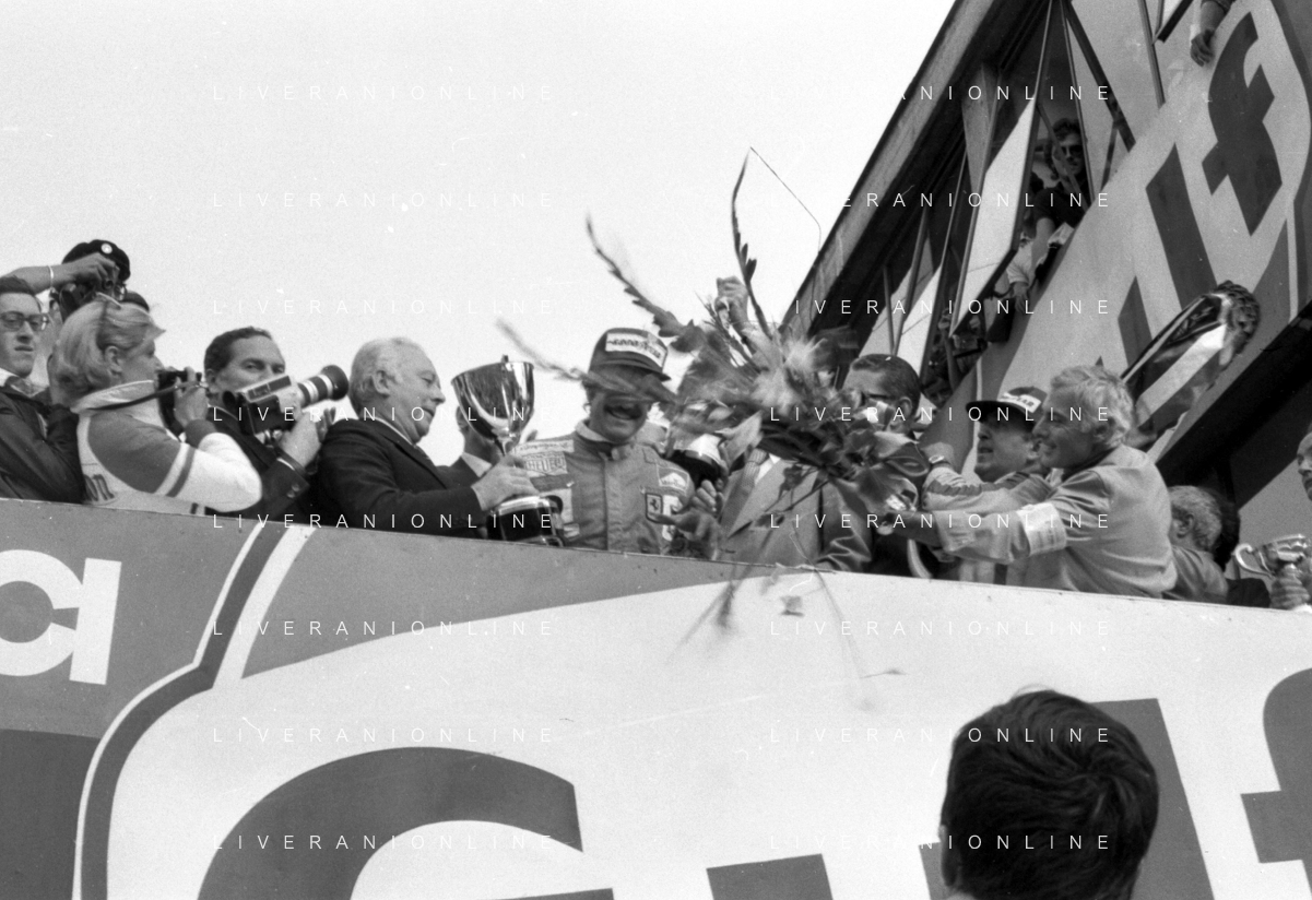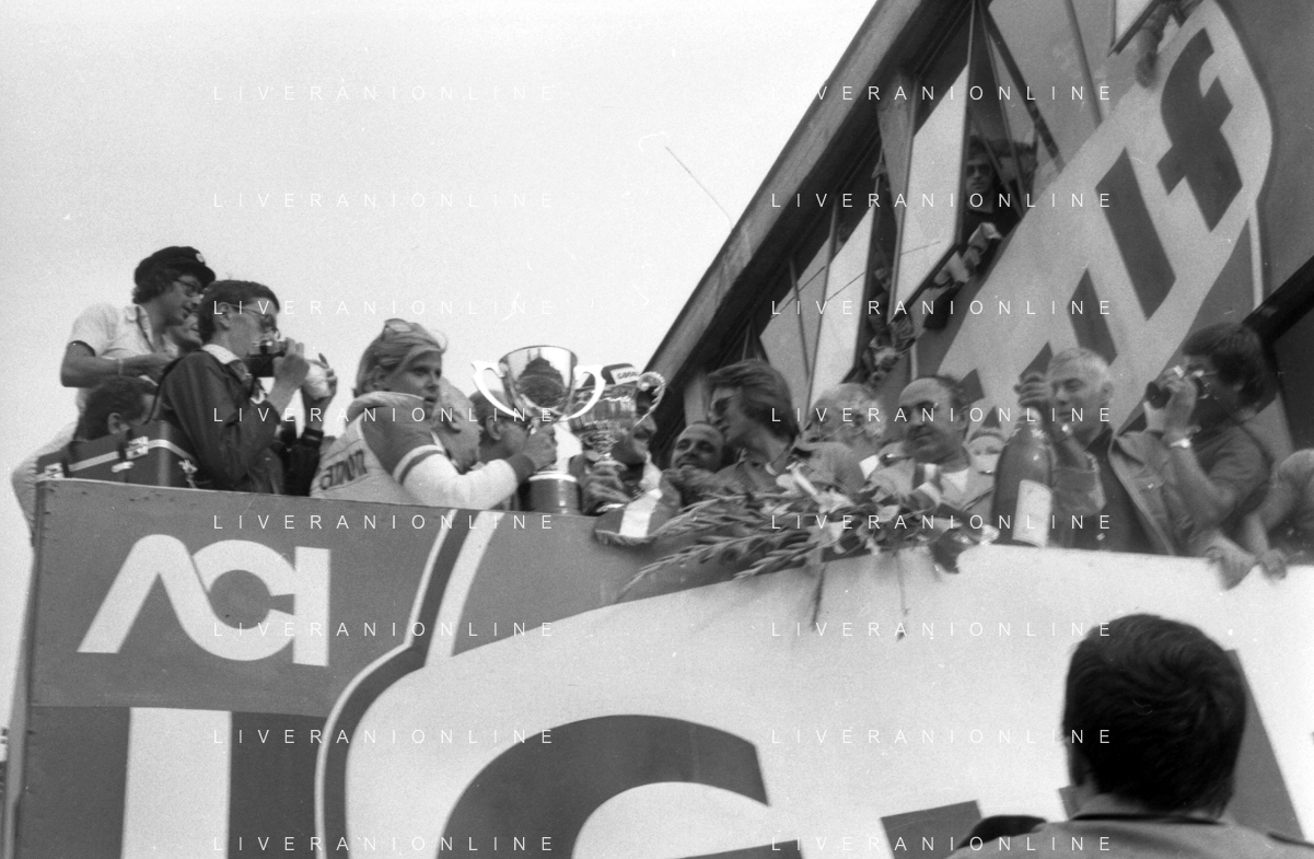Neg- GRAN PREMIO D'ITALIA 1975 CAMPIONATO MONDIALE DI FORMULA 1 MONZA - RETROSPETTIVA NELLA FOTO CLAY REGAZZONI (FERRARI) VINCITORE SUL PODIO AG ALDO LIVERANI SAS