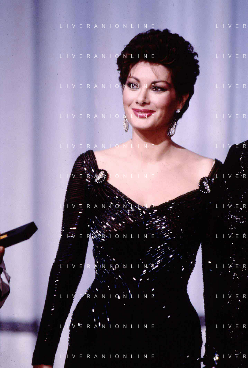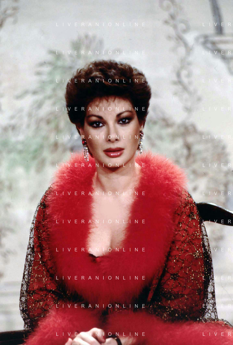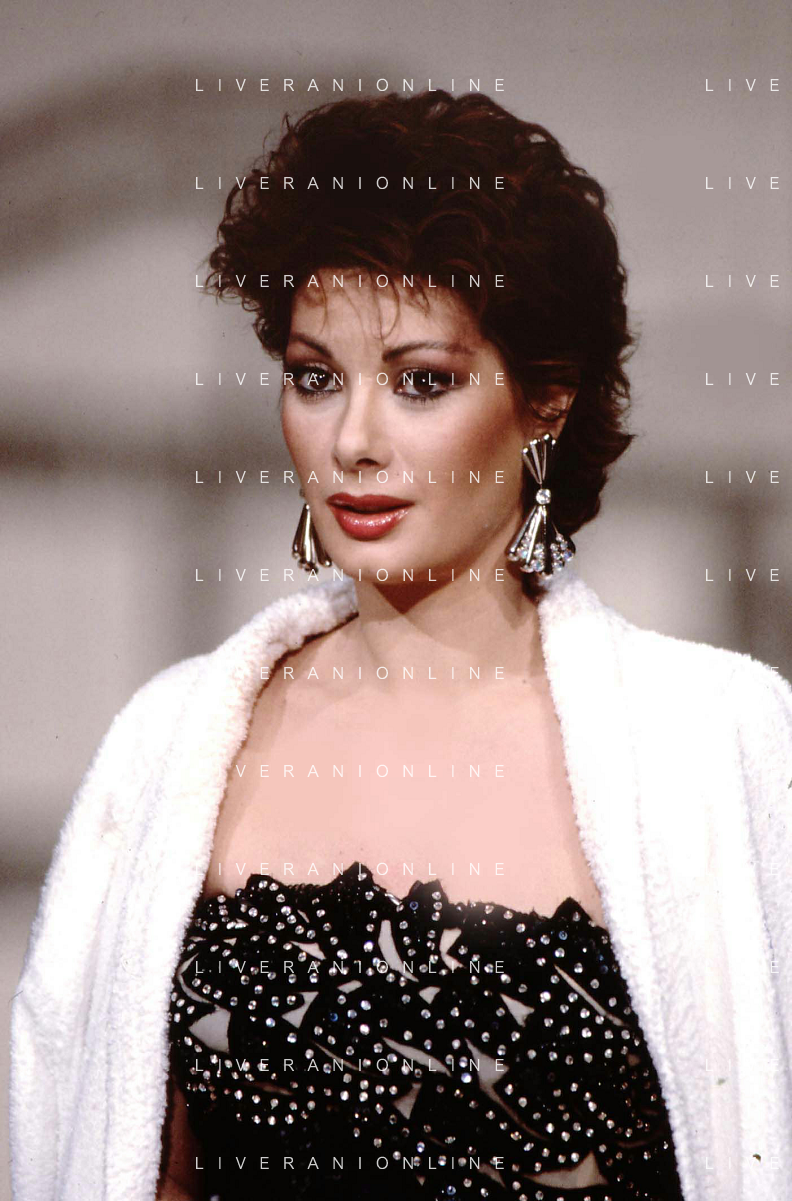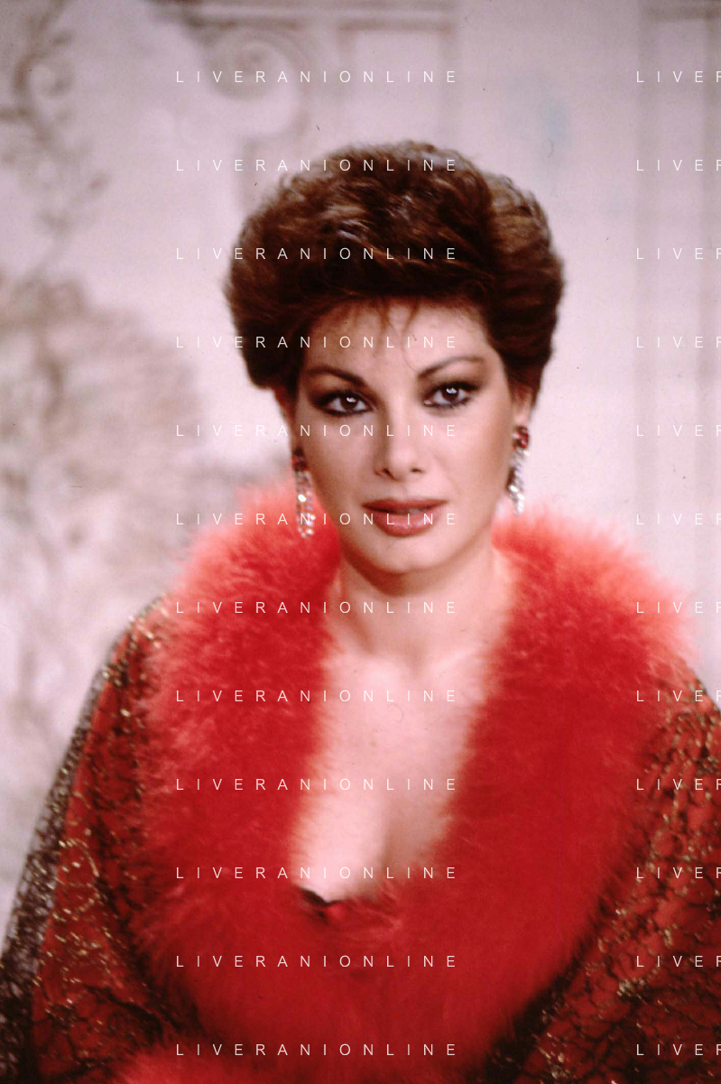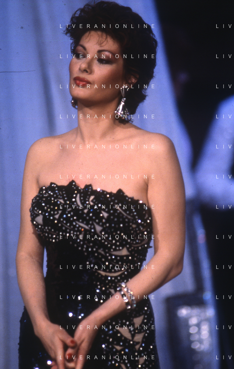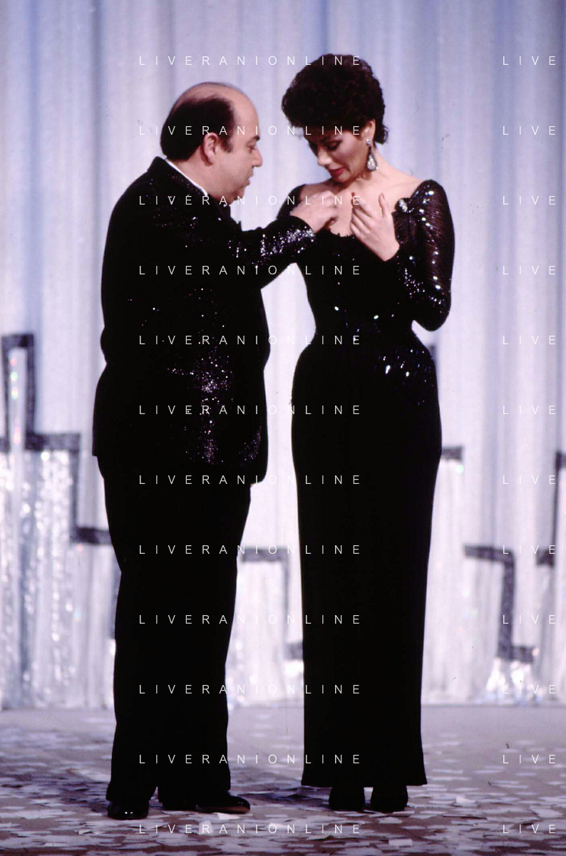 DIAP-RETROSPETTIVA EDWIGE FENECH ATTRICE NELLA FOTO EDWIGE FENECH NELL'ANNO 1985 NELLA TRASMISSIONE TELEVISIVA RISATISSIMA CON LINO BANFI AG ALDO LIVERANI SAS