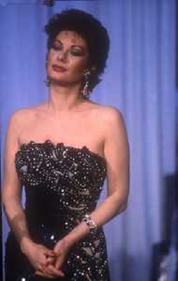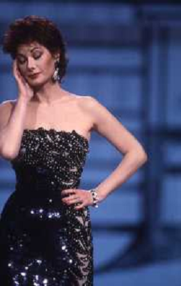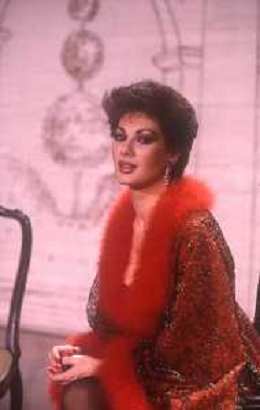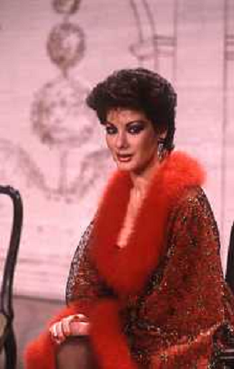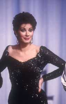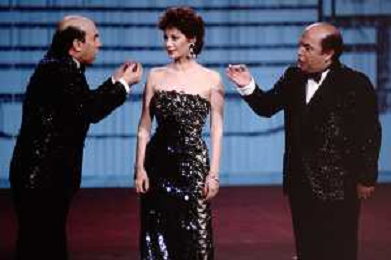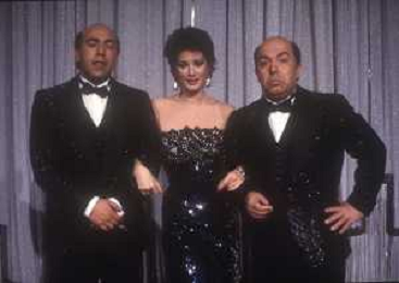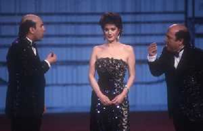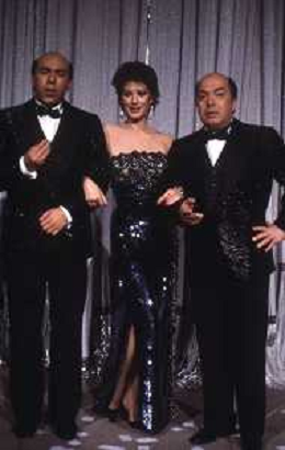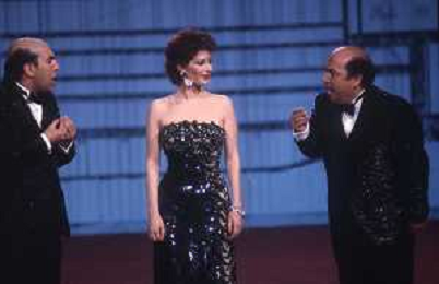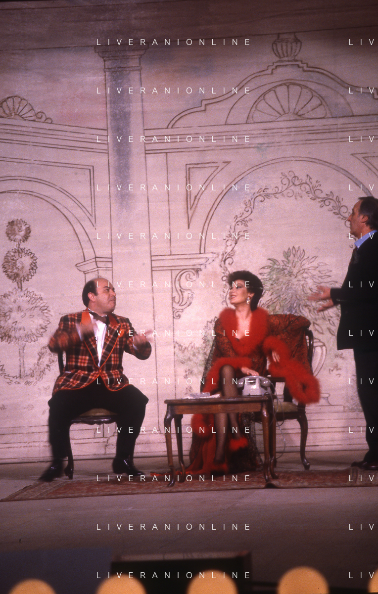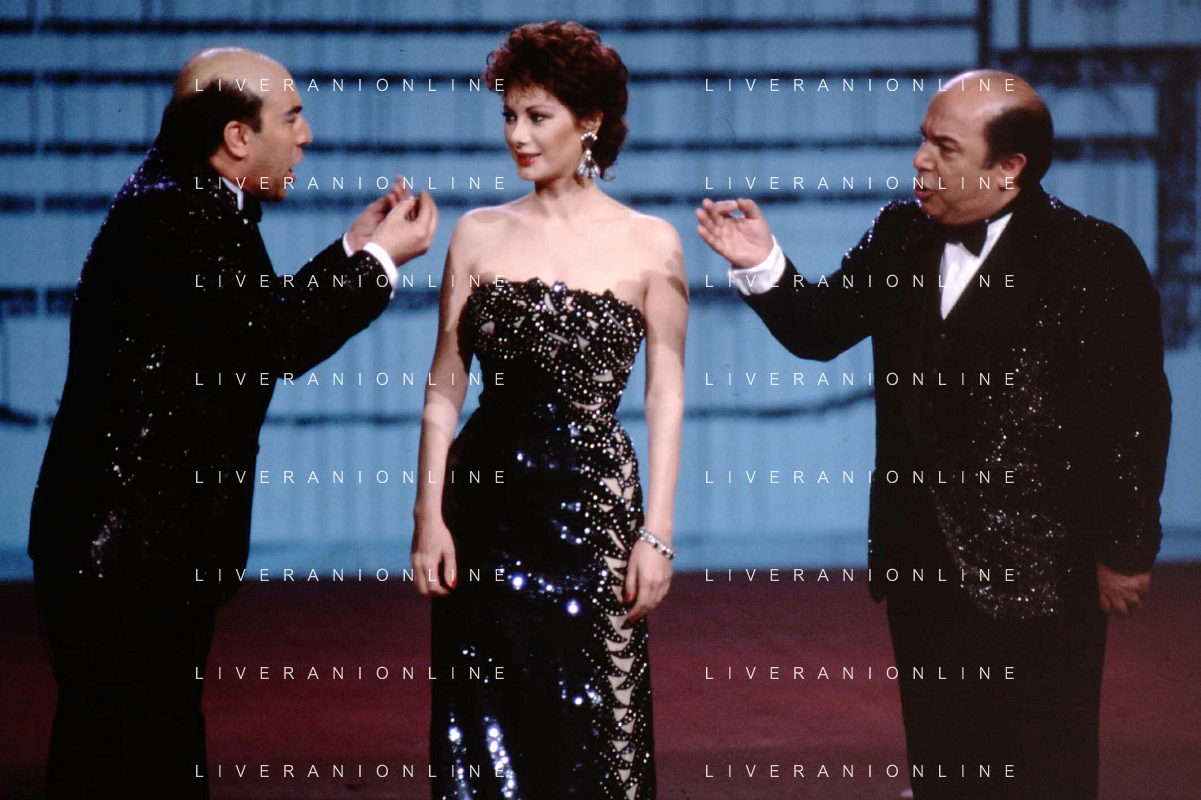 DIAP-RETROSPETTIVA EDWIGE FENECH ATTRICE NELLA FOTO EDWIGE FENECH NELL'ANNO 1985 NELLA TRASMISSIONE TELEVISIVA RISATISSIMA CON MASSIMO BOLDI E LINO BANFI AG ALDO LIVERANI SAS