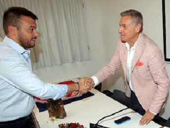 IMOLA 19 07 2023 IMOLESE CALCIO SERIE D CONFERENZA STAMPA PRESENTAZIONE DELLA NUOVA SOCIETA' NELLA FOTO SINDACO DI IMOLA MARCO PANIERI SALUTI DIRETTORE GENERALE DELL'IMOLESE CALCIO ULISSE SAVINI IN CENTRO PRESIDENTE DELL'IMOLESE CALCIO DOMENICO ALTOMONTE ©SANNA/Agenzia Aldo Liverani Sas
