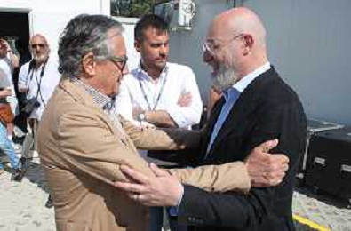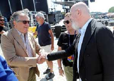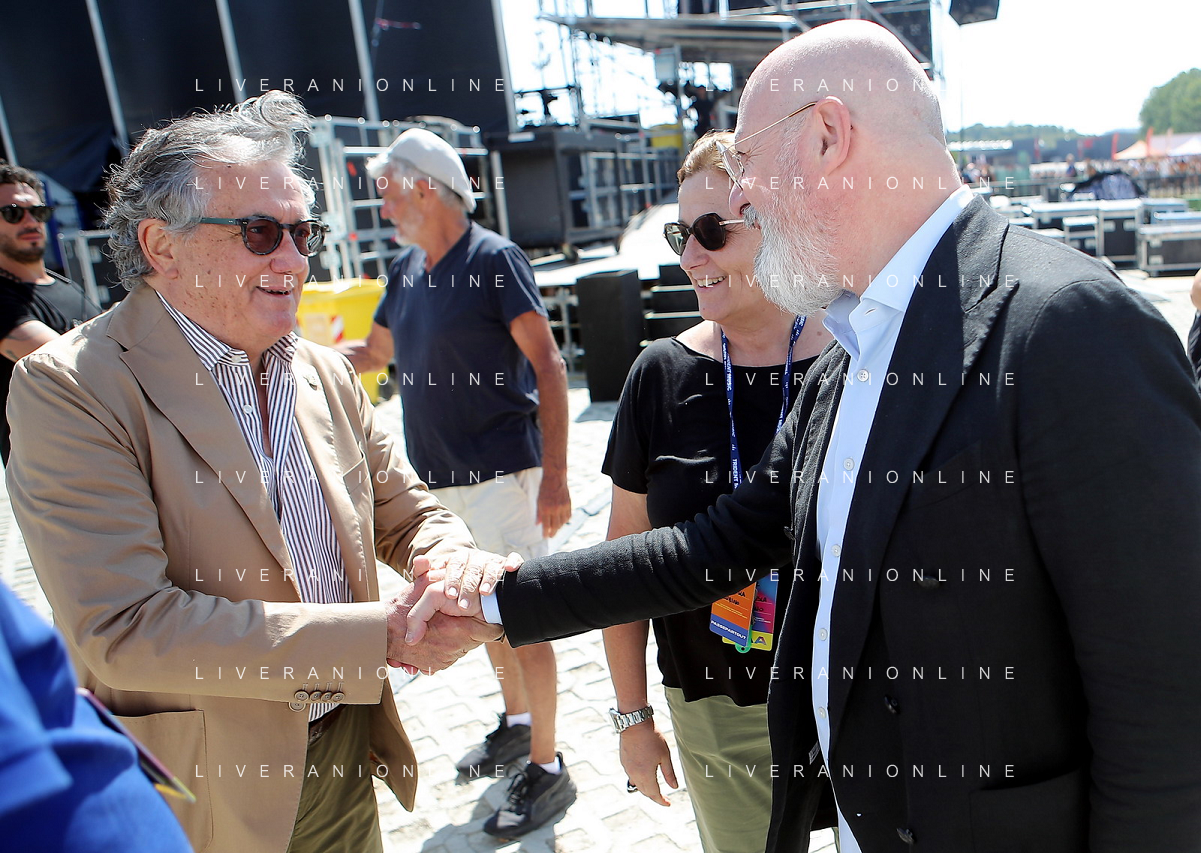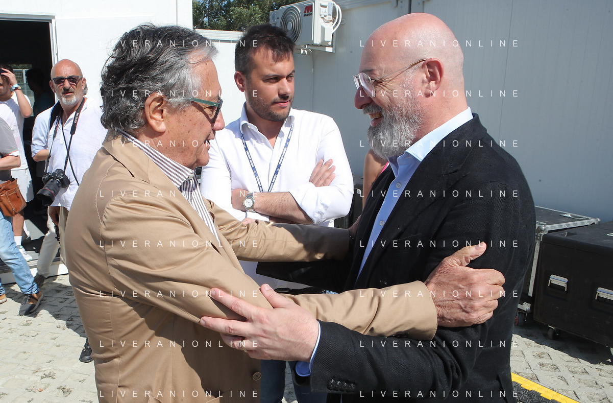 IMOLA 29 07 2023 AUTODROMO ENZO E DINO FERRAR I "IMOLA SUMMER FESTIVAL" CONCERTO DI BENIFICENZA PER GLI ALLUVIONATI IN ROMAGNA NELLA FOTO GIANCARLO MINARDI PRESIDENTE DELL'AUTODROMO ENZO E DINO FERRARI E STEFANO BONACCINI PRESIDENTE DELLA REGIONE EMILIA ROMAGNA FOTO GIANNI SANNA-AG ALDO LIVERANI SAS