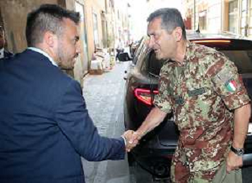 IMOLA 01 08 2023 VISITA DEL COMMISSARIO GEN.FIGLIUOLO PAOLO FRANCESCO A IMOLA E VALLATA DEL FIUME SANTERNO NELLA FOTO ARRIVO A IMOLA E STRETTA DI MANO SINDACO DI IMOLA MARCO PANIERI E GENERALE FIGLIUOLO PAOLO FRANCESCO FOTO GIANNI SANNA-AG ALDO LIVERANI SAS