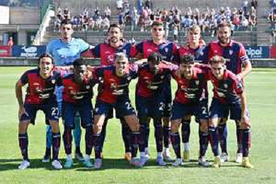 formazione Cagliari, in piedi da SX Simone Scuffet, Edoardo Goldaniga, Adam Obert, Christos Kourfalidis e Leonardo Pavoletti; in basso da SX Tommaso Augello, Ibrahim Sulemana, Gabriele Zappa, Antoine Makoumbou, Nunzio Lella e Gaetano Oristanio Cagliari vs Como gara amichevole Chatillon (AO) 02-08-2023 Stadio Ernesto Brunod foto Roberto Garavaglia/ag. Aldo Liverani sas