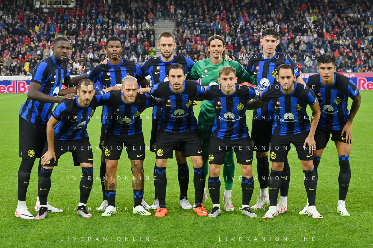 formazione Inter, in piedi da SX Marcus Thuram, Denzel Dumfries, Stefan de Vrij, Yann Sommer e Alessandro Bastoni; in basso da SX Henrikh Mkhitaryan, Federico Dimarco, Matteo Darmian, Nicolo' Barella, Hakan Calhanoglu e Joaquin Correa Salisburgo vs Inter Salisburgo (AUT) 09-08-2023 Red Bull Arena amichevole precampionato foto Roberto Garavaglia/ag. Aldo Liverani sas /AGENZIA ALDO LIVERANI SAS