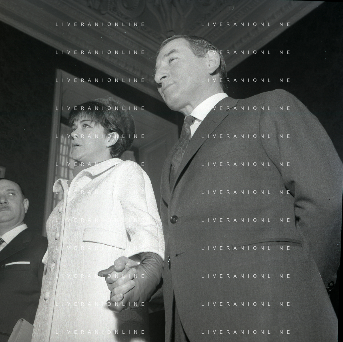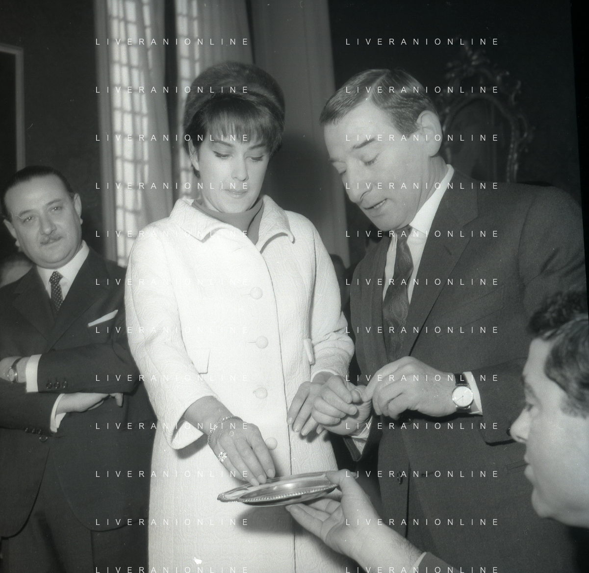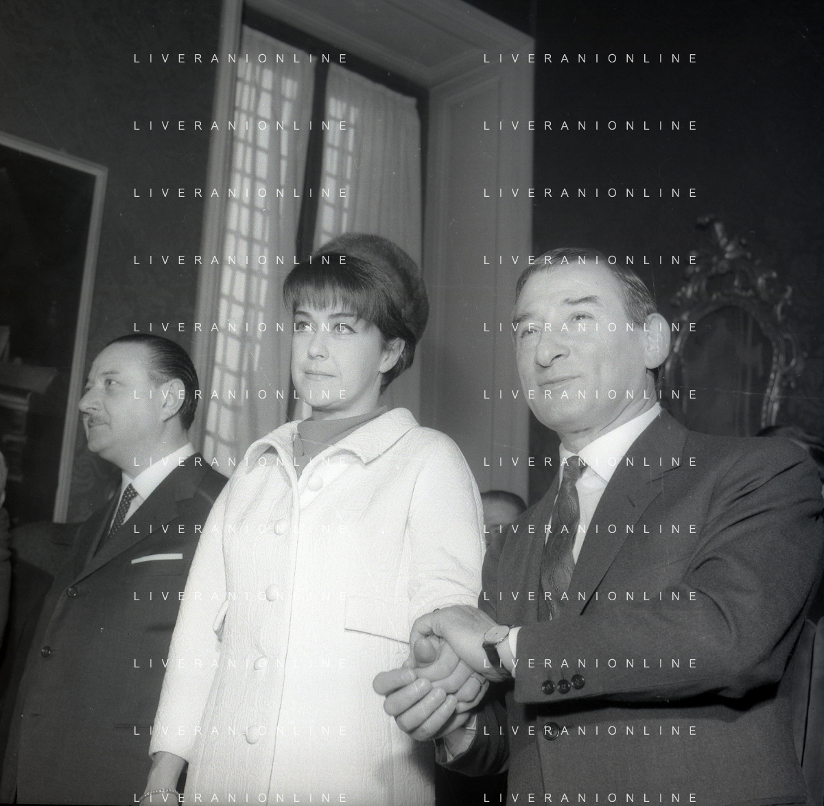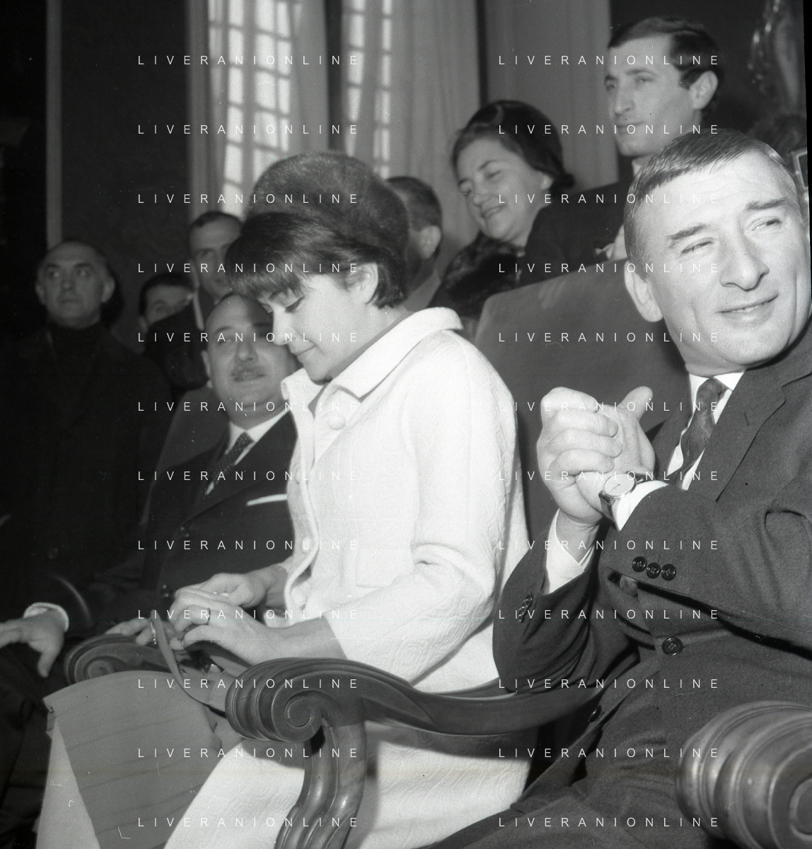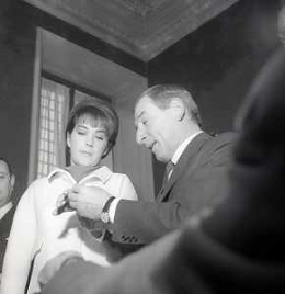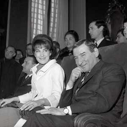 NEG-RETROSPETTIVA RENATO RASCEL ATTORE NELLA FOTO RENATO RASCEL CON HUGUETTE CARTIER A MILANO PER IL LORO MATRIMONIO IL GIORNO 03-01-1966 AG ALDO LIVERANI SAS