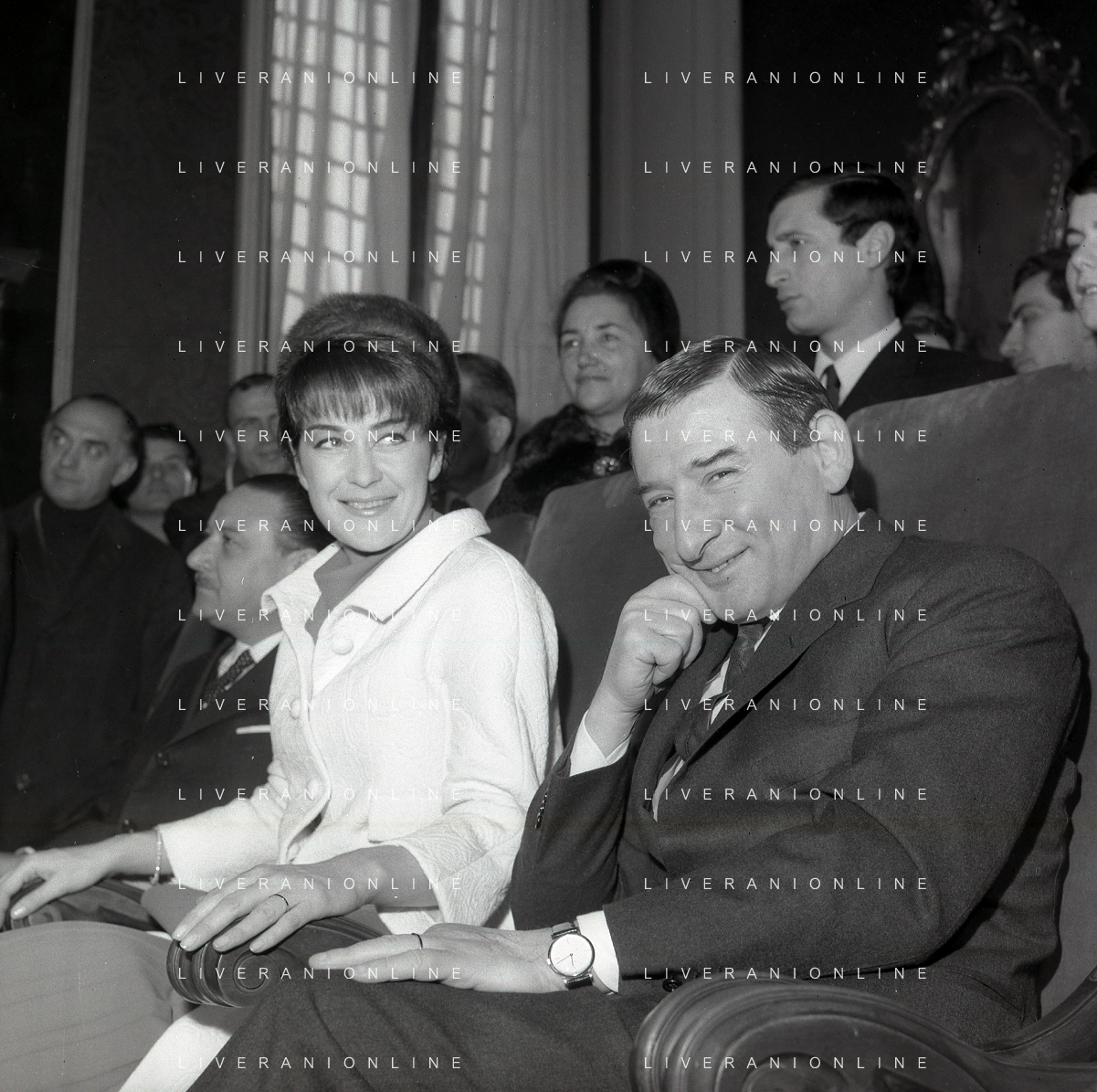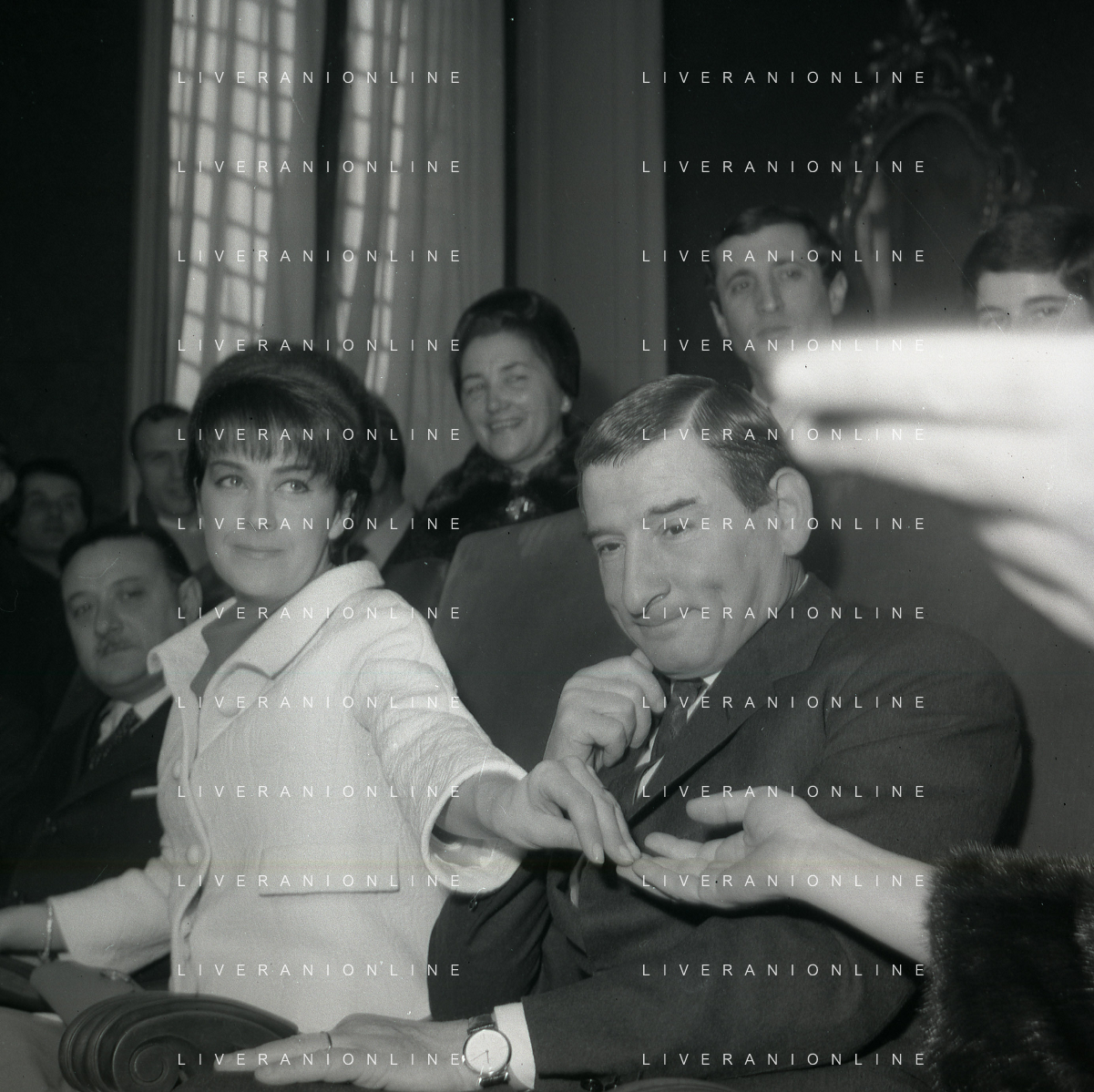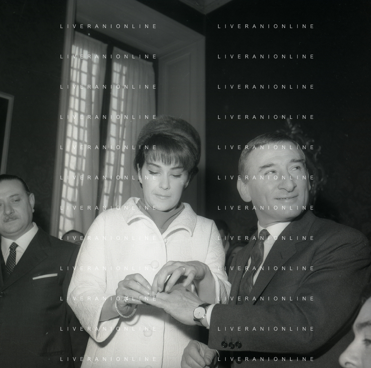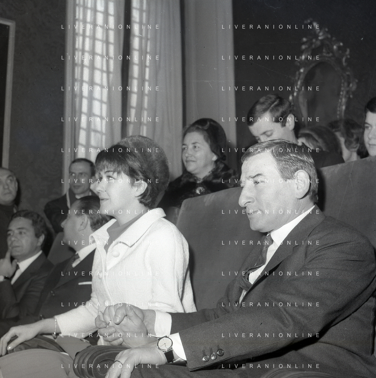 NEG-RETROSPETTIVA RENATO RASCEL ATTORE NELLA FOTO RENATO RASCEL CON HUGUETTE CARTIER A MILANO PER IL LORO MATRIMONIO IL GIORNO 03-01-1966 AG ALDO LIVERANI SAS