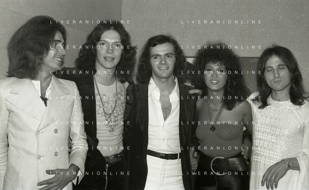 RETROSPETTIVA COMPLESSO MUSICALE POOH NELLA FOTO IL COMPLESSO MUSICALE DEI POOH CON MARCELLA BELLA AL DISCO D D'ORO NELL'ANNO 1973 AG ALDO LIVERANI SAS