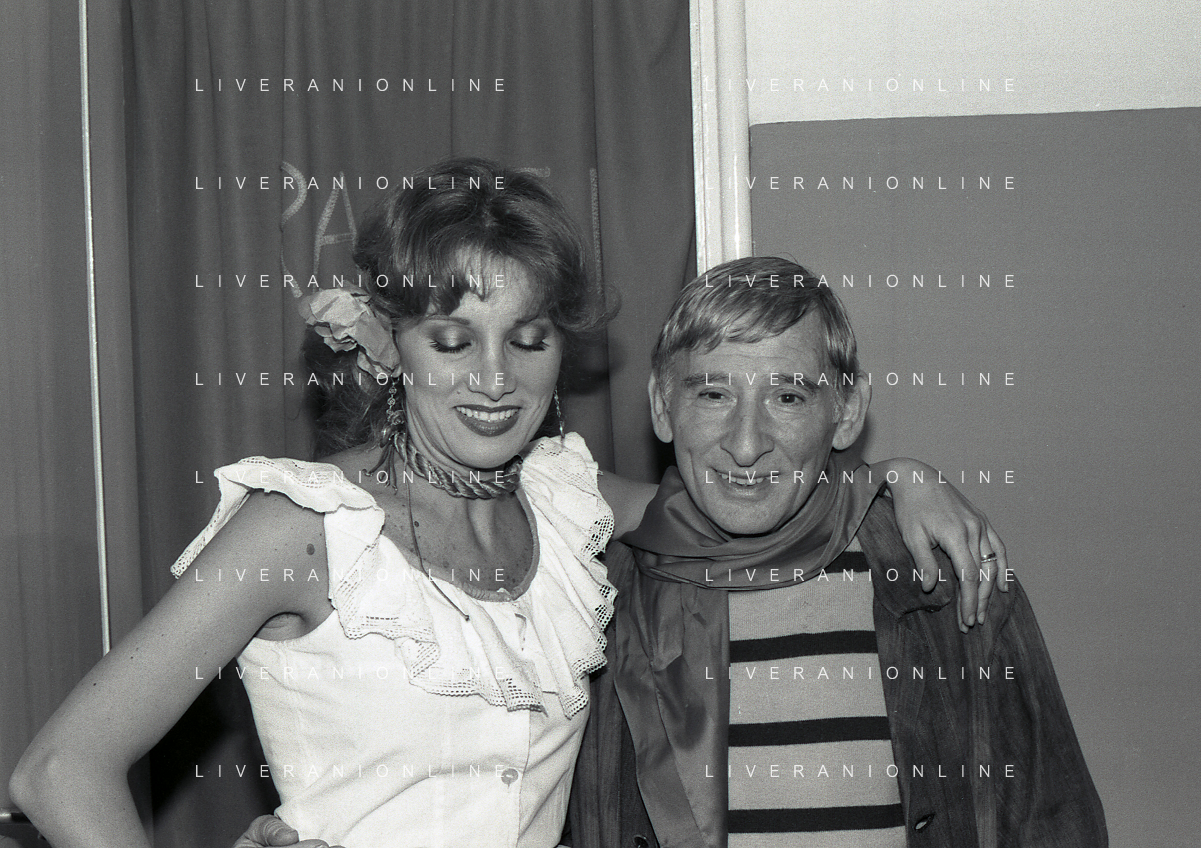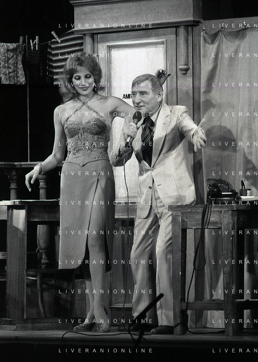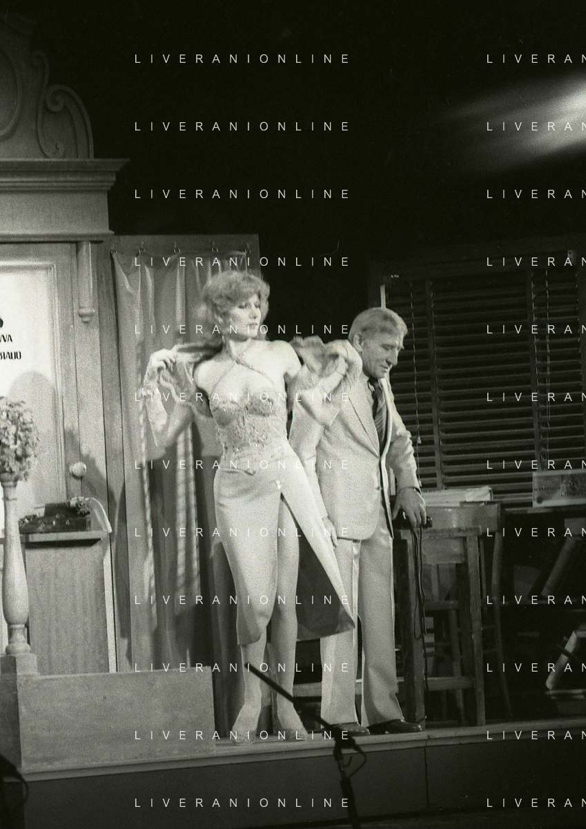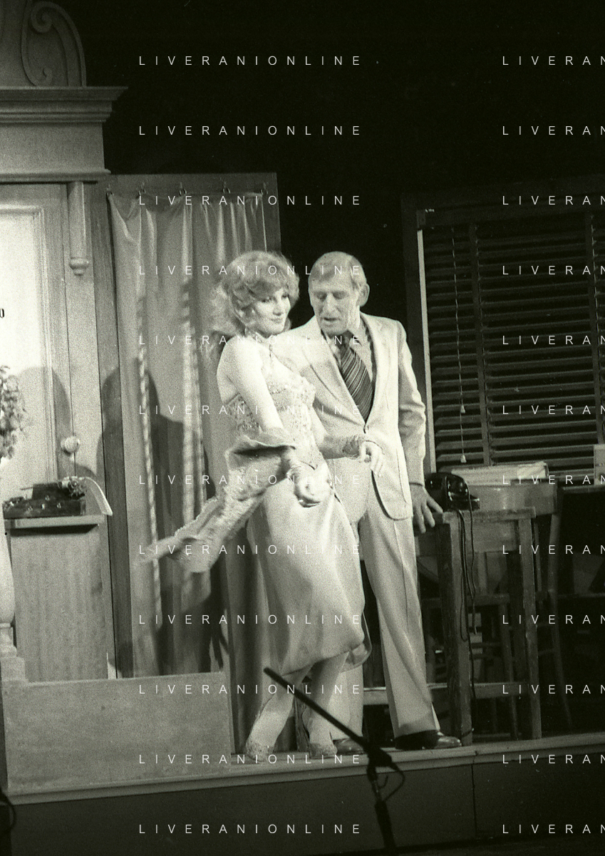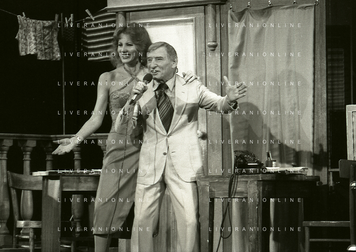 NEG-RETROSPETTIVA RENATO RASCEL ATTORE NELLA FOTO RENATO RASCEL E GIUDITTA SANTARINI NELL'ANNO 1980 A MILANO NELLA COMMEDIA TEATRALE IN BOCCA ALL'UFO AG ALDO LIVERANI SAS
