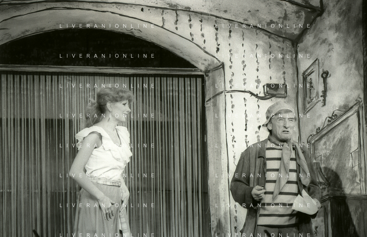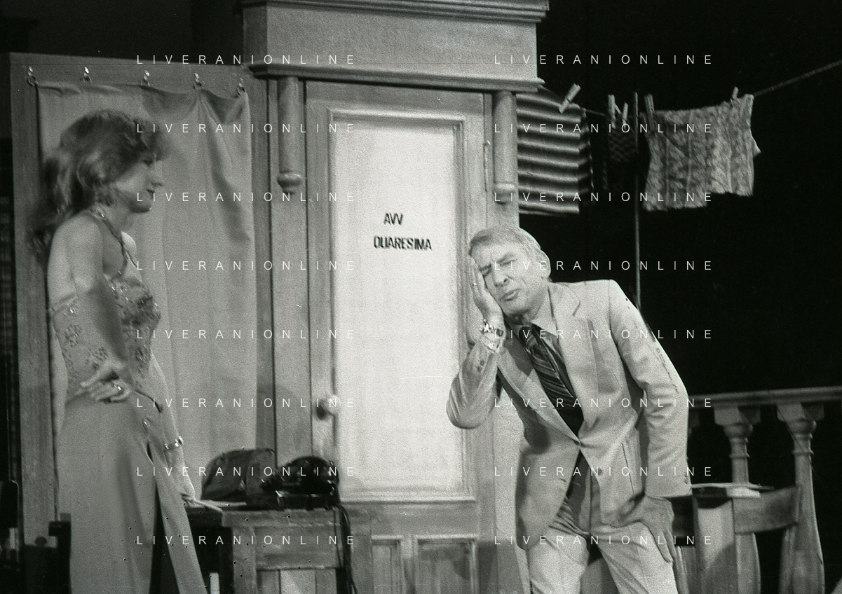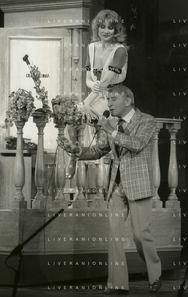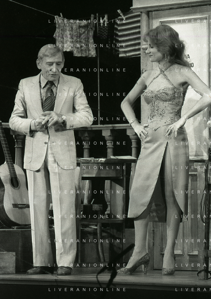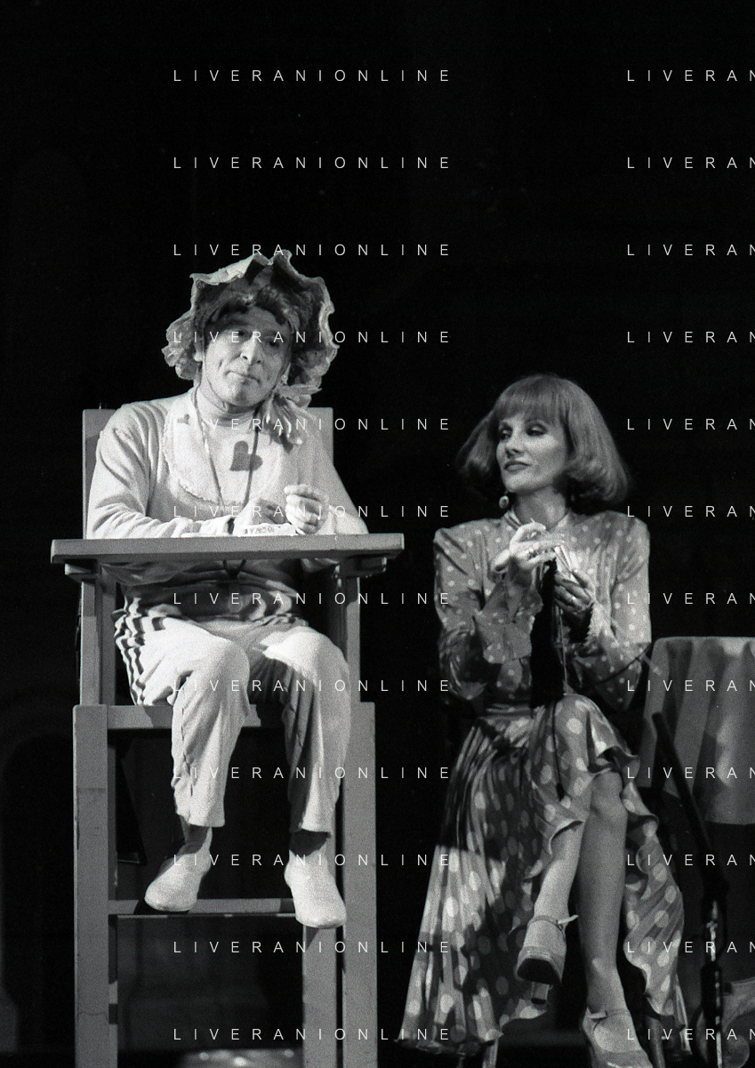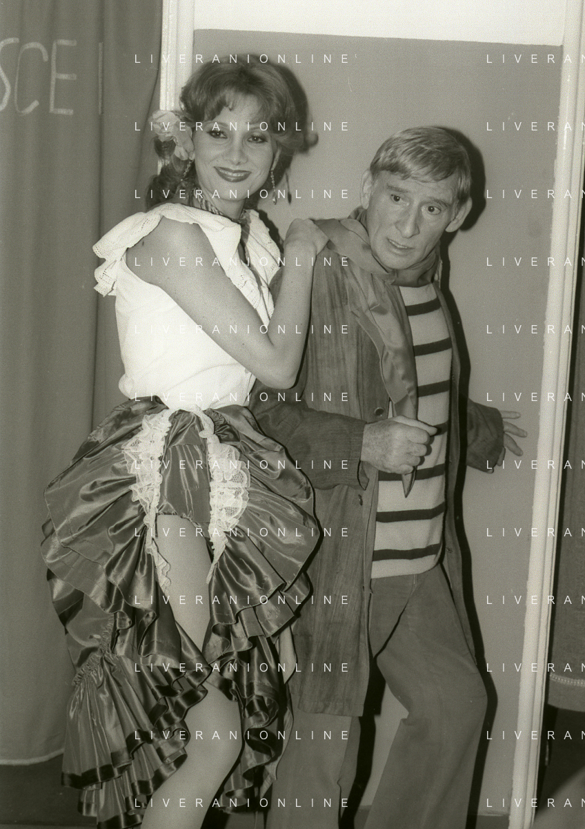 NEG-RETROSPETTIVA RENATO RASCEL ATTORE NELLA FOTO RENATO RASCEL E GIUDITTA SANTARINI NELL'ANNO 1980 A MILANO NELLA COMMEDIA TEATRALE IN BOCCA ALL'UFO AG ALDO LIVERANI SAS