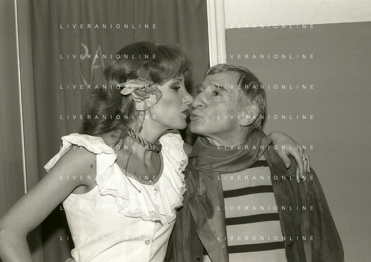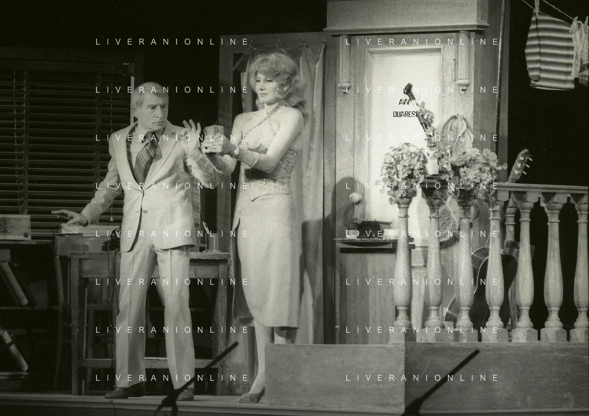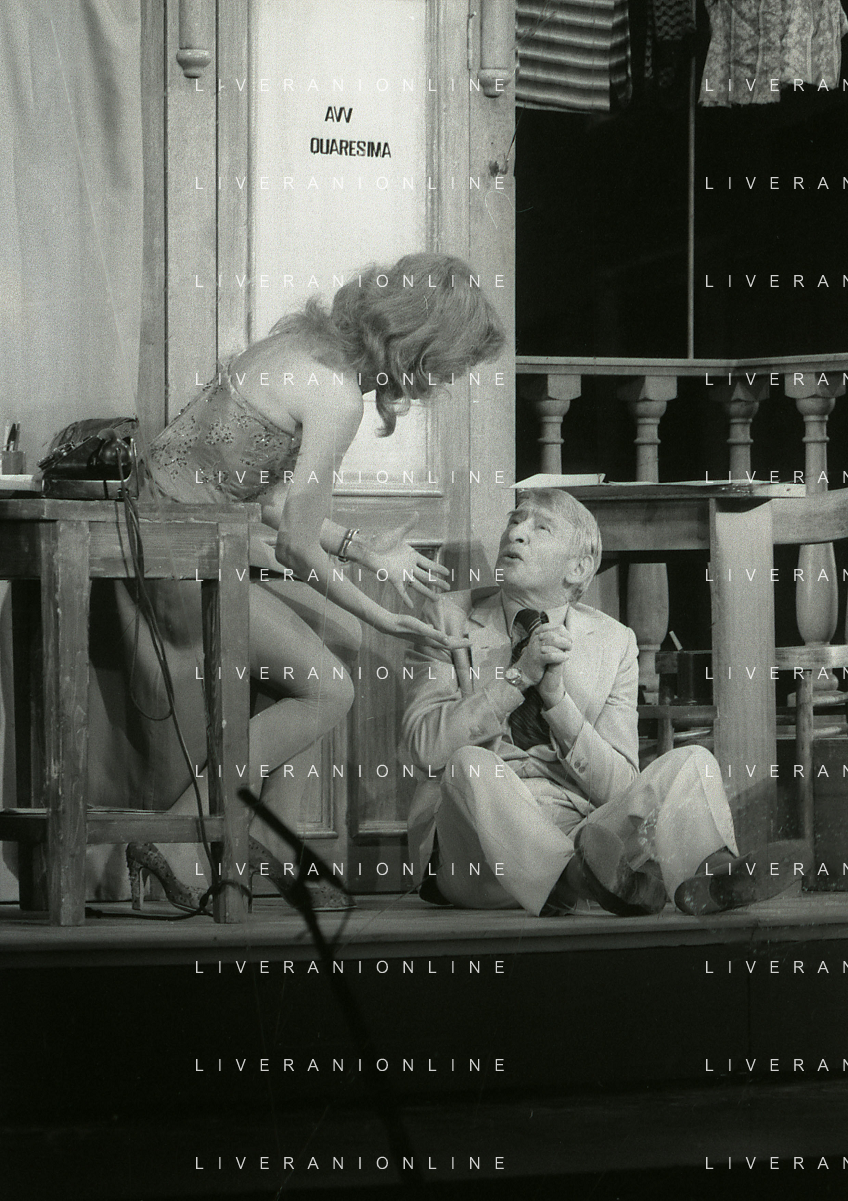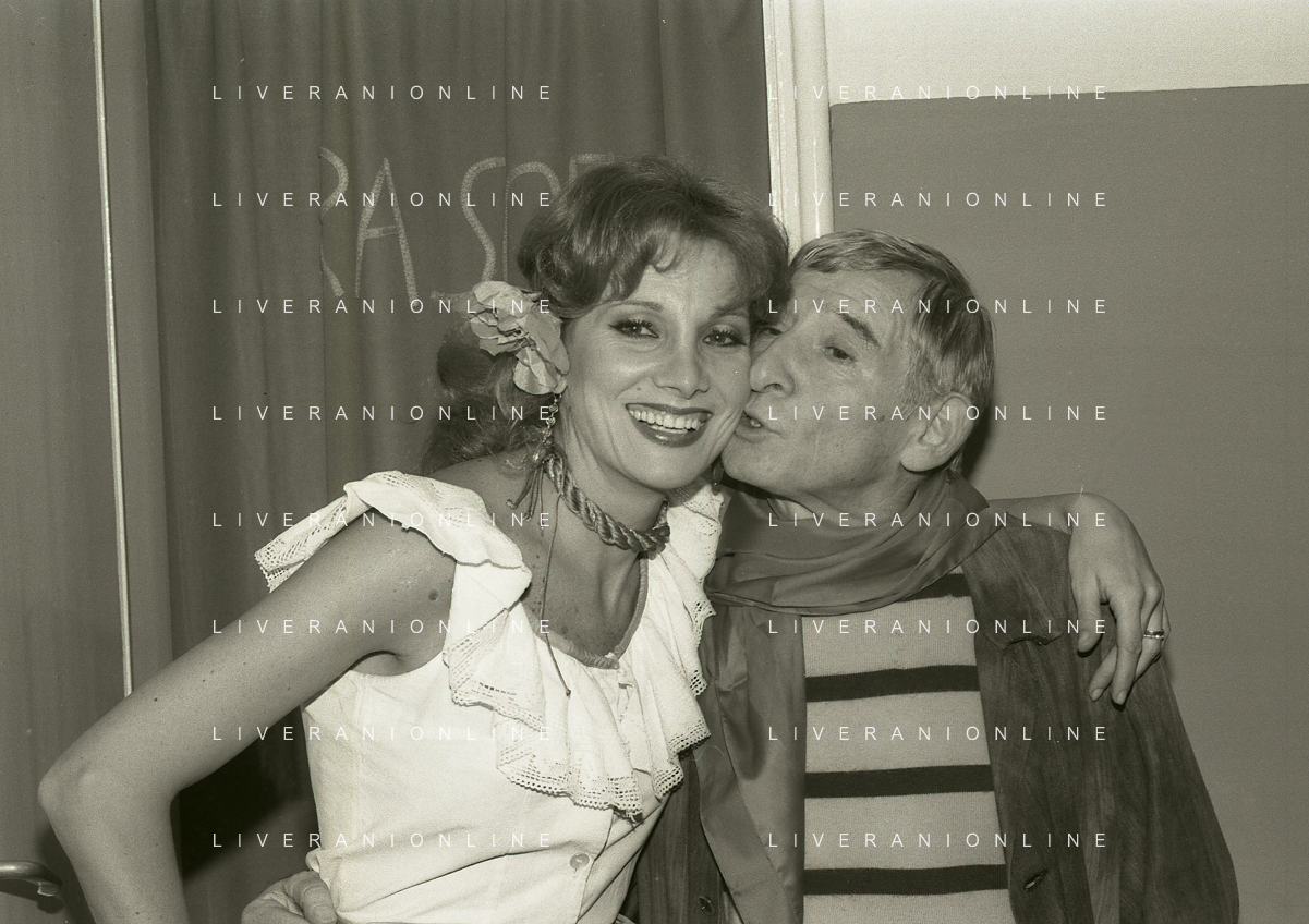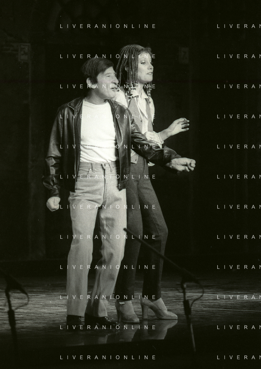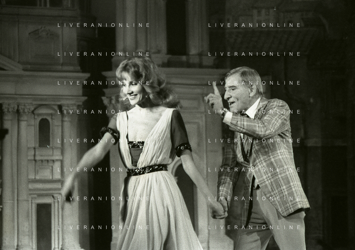 NEG-RETROSPETTIVA RENATO RASCEL ATTORE NELLA FOTO RENATO RASCEL E GIUDITTA SANTARINI NELL'ANNO 1980 A MILANO NELLA COMMEDIA TEATRALE IN BOCCA ALL'UFO AG ALDO LIVERANI SAS