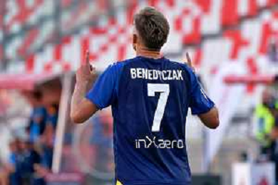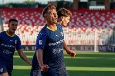 Adrian Benedyczak (Parma Calcio) celebrates after scoring a goal during the Coppa Italia Round of 32 match between SSC Bari and Parma Calcio at stadio San Nicola on August 12, 2023 in Bari, Italy. (Photo by Emmanuele Mastrodonato/ag. Aldo Liverani sas)