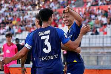 Adrian Benedyczak (Parma Calcio) celebrates after scoring a goal with Yordan Osorio (Parma Calcio) during the Coppa Italia Round of 32 match between SSC Bari and Parma Calcio at stadio San Nicola on August 12, 2023 in Bari, Italy. (Photo by Emmanuele Mastrodonato/ag. Aldo Liverani sas)