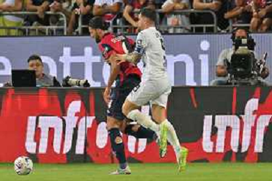 12-8-2023. Cagliari calcio-Palermo calcio. Trentaduesimi Coppa Italia Freccia Rossa 2023/2024, Stadio Unipol Domus Cagliari. Foto Salvatore Moi/Agenzia Aldo Liverani s.a.s. Nella foto:Alberto Dossena Cagliari, Brunori Palermo ©MOI SALVATORE / AGENZIA ALDO LIVERANI SAS