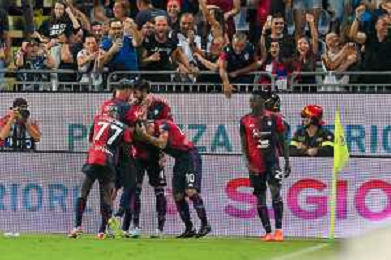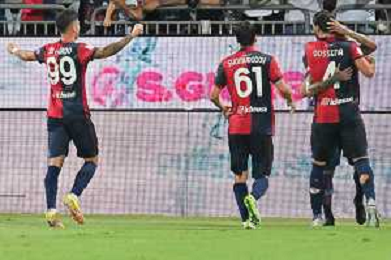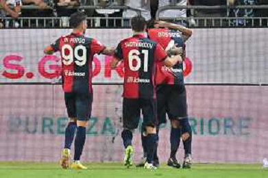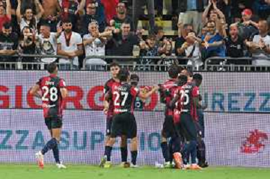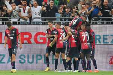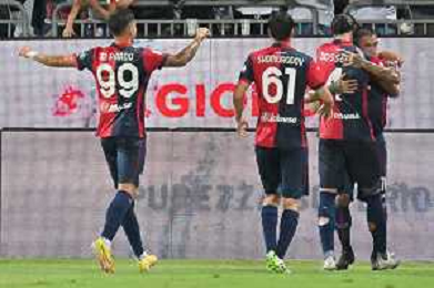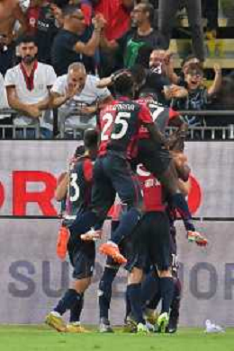 12-8-2023. Cagliari calcio-Palermo calcio. Trentaduesimi Coppa Italia Freccia Rossa 2023/2024, Stadio Unipol Domus Cagliari. Foto Salvatore Moi/Agenzia Aldo Liverani s.a.s. Nella foto: Gol ed esultanza del Cagliari in casa contro il Palermo, nello stadio Unipol Domus di Cagliari. Segna:Alberto Dossena Cagliari ©MOI SALVATORE / AGENZIA ALDO LIVERANI SAS