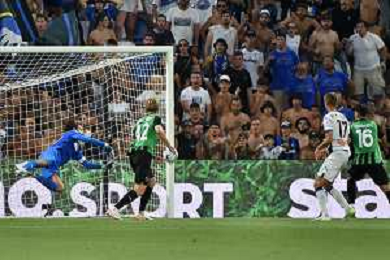 Sassuolo vs Atalanta nella foto Andrea Consigli (Sassuolo) respinge il colpo di testa di Charles de Ketelaere (Atalanta) dopo che il pallone ha gia' varcato la linea di porta e l'arbitro Matteo Marchetti di Ostia Lido (Roma) concede la rete con l'aiuto della gol line technology Reggio Emilia 20-08-2023 Mapei Stadium - Stadio Città del Tricolore Campionato Serie A TIM - 1a giornata foto Roberto Garavaglia/ag. Aldo Liverani sas